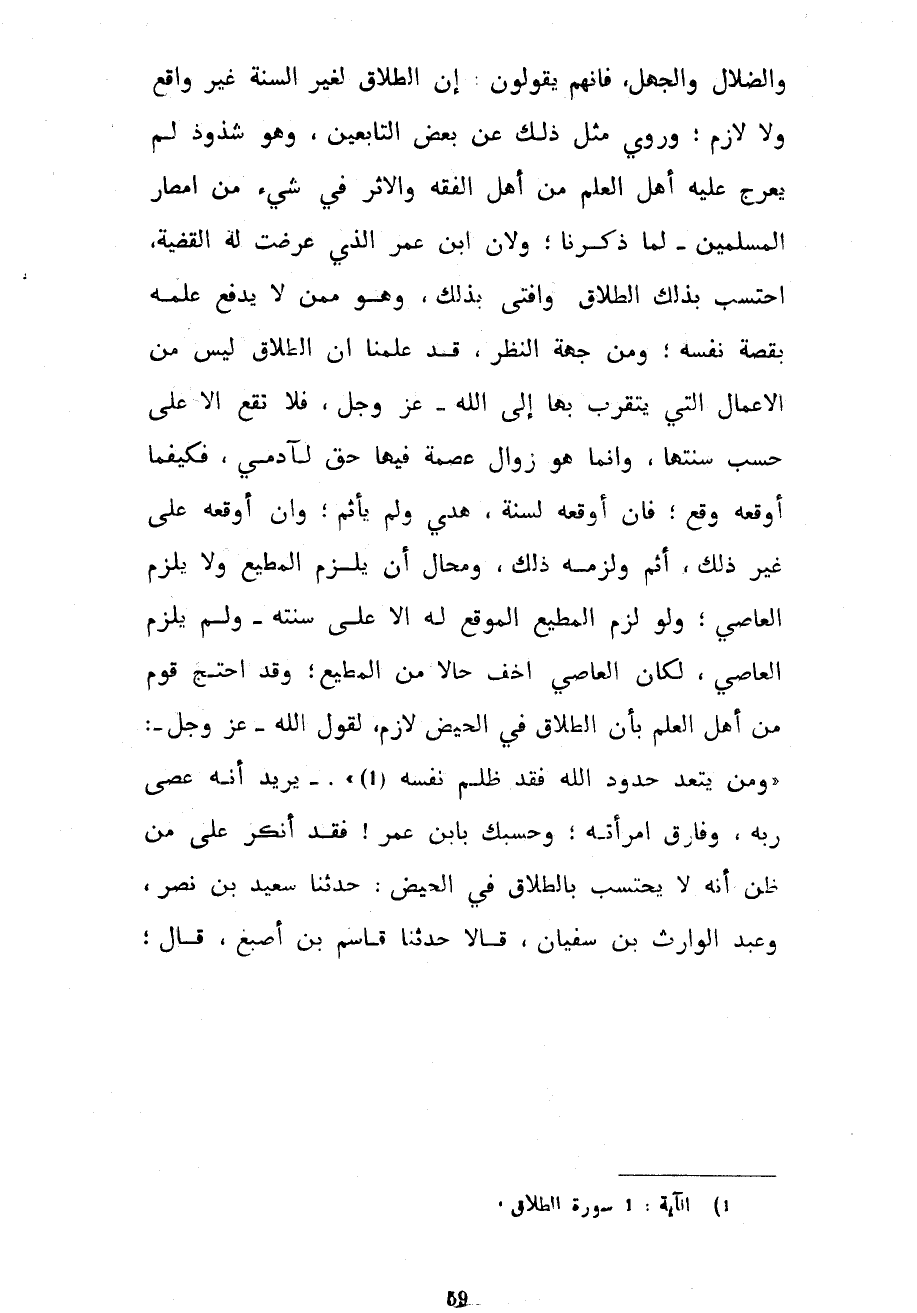 وَالضَّلَالِ وَالْجَهْلِ فَإِنَّهُمْ يَقُولُونَ إِنَّ الطَّلَاقَ لِغَيْرِ السُّنَّةِ غَيْرُ وَاقِعٍ وَلَا لَازِمٍ وَرُوِيَ مِثْلُ ذَلِكَ عَنْ بَعْضِ التَّابِعِينَ وَهُوَ شُذُوذٌ لَمْ يُعَرِّجْ عَلَيْهِ أَهْلُ الْعِلْمِ مِنْ أَهْلِ الْفِقْهِ وَالْأَثَرِ فِي شَيْءٍ مِنْ أَمْصَارِ الْمُسْلِمِينَ لِمَا ذَكَرْنَا وَلِأَنَّ ابْنَ عُمَرَ الَّذِي عَرَضَتْ لَهُ الْقَضِيَّةُ احْتَسَبَ بِذَلِكَ الطَّلَاقَ وَأَفْتَى بِذَلِكَ وَهُوَ مِمَّنْ لَا يُدْفَعُ عِلْمُهُ بِقِصَّةِ نَفْسِهِ وَمِنْ جِهَةِ النَّظَرِ قَدْ عَلِمْنَا أَنَّ الطَّلَاقَ لَيْسَ مِنَ الْأَعْمَالِ الَّتِي يَتَقَرَّبُ بِهَا إِلَى اللَّهِ عَزَّ وَجَلَّ فَلَا تَقَعُ إِلَّا عَلَى حَسَبِ سُنَّتِهَا وَإِنَّمَا هُوَ زَوَالُ عِصْمَةٍ فِيهَا حَقٌّ لِآدَمِيٍّ فَكَيْفَمَا أَوْقَعَهُ وَقَعَ فَإِنْ أَوْقَعَهُ لِسُنَّةٍ هُدِيَ وَلَمْ يَأْثَمْ وَإِنْ أَوْقَعَهُ عَلَى غَيْرِ ذَلِكَ أَثِمَ وَلَزِمَهُ ذَلِكَ وَمُحَالٌ أَنْ يَلْزَمَ الْمُطِيعَ وَلَا يَلْزَمَ الْعَاصِي وَلَوْ لَزِمَ الْمُطِيعَ الْمُوقِعَ لَهُ إِلَّا عَلَى سُنَّتِهِ وَلَمْ يَلْزَمِ الْعَاصِيَ لَكَانَ الْعَاصِي أَخَفَّ حَالًا مِنَ الْمُطِيعِ وَقَدِ احْتَجَّ قَوْمٌ مِنْ أَهْلِ الْعِلْمِ بِأَنَّ الطَّلَاقَ فِي الْحَيْضِ لَازِمٌ لِقَوْلِ اللَّهِ عَزَّ وَجَلَّ وَمَنْ يَتَعَدَّ حُدُودَ اللَّهِ فَقَدْ ظَلَمَ نَفْسَهُ يُرِيدُ أَنَّهُ عَصَى رَبَّهُ وَفَارَقَ امْرَأَتَهُ وَحَسْبُكَ بِابْنِ عُمَرَ فَقَدْ أَنْكَرَ عَلَى مَنْ ظَنَّ أَنَّهُ لَا يُحْتَسَبُ بِالطَّلَاقِ فِي الْحَيْضِ حَدَّثَنَا سَعِيدُ بْنُ نَصْرٍ وَعَبْدُ الْوَارِثِ بْنُ سُفْيَانَ قَالَا حَدَّثَنَا قَاسِمُ بْنُ أَصْبَغَ قَالَ