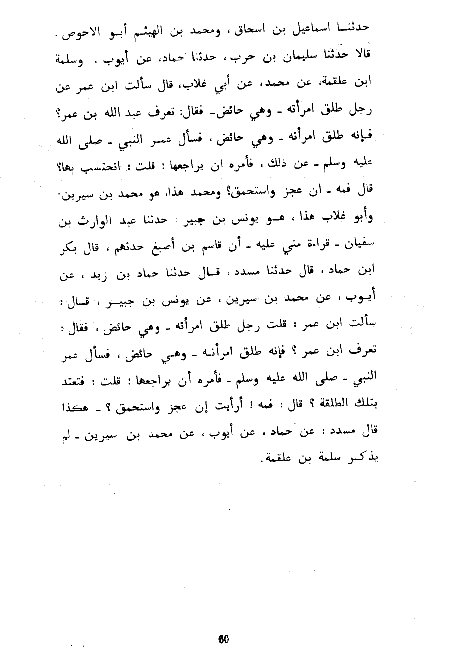 حَدَّثَنَا إِسْمَاعِيلُ بْنُ إِسْحَاقَ وَمُحَمَّدُ بْنُ الْهَيْثَمِ أَبُو الْأَحْوَصِ قَالَا حَدَّثَنَا سُلَيْمَانُ بْنُ حَرْبٍ حَدَّثَنَا حَمَّادٌ عَنْ أَيُّوبَ وَسَلَمَةَ بْنِ عَلْقَمَةَ عَنْ مُحَمَّدٍ عَنْ أَبِي غَلَّابٍ قَالَ سَأَلْتُ ابْنَ عُمَرَ عَنْ رَجُلٍ طَلَّقَ امْرَأَتَهُ وَهِيَ حَائِضٌ فَقَالَ تَعْرِفُ عَبْدَ اللَّهِ بْنَ عُمَرَ فَإِنَّهُ طَلَّقَ امْرَأَتَهُ وَهِيَ حَائِضٌ فَسَأَلَ عُمَرُ النَّبِيُّ صَلَّى اللَّهُ عَلَيْهِ وَسَلَّمَ عَنْ ذَلِكَ فَأَمَرَهُ أَنْ يُرَاجِعَهَا قُلْتُ أَتَحْتَسِبُ بِهَا قَالَ فَمَهْ إِنْ عَجَزَ وَاسْتَحْمَقَ وَمُحَمَّدٌ هَذَا هُوَ محمد بن سِيرِينَ وَأَبُو غَلَّابٍ هَذَا هُوَ يُونُسُ بْنُ جُبَيْرٍ حَدَّثَنَا عَبْدُ الْوَارِثِ بْنُ سُفْيَانَ قِرَاءَةً مِنِّي عَلَيْهِ أَنَّ قَاسِمَ بْنَ أَصْبَغَ حَدَّثَهُمْ قَالَ بَكْرُ بْنُ حَمَّادٍ قَالَ حَدَّثَنَا مُسَدَّدٌ قَالَ حَدَّثَنَا حَمَّادُ بْنُ زَيْدٍ عَنْ أَيُّوبَ عَنْ مُحَمَّدٍ بْنِ سِيرِينَ عَنْ يُونُسَ بْنِ جُبَيْرٍ قَالَ سَأَلْتُ ابْنَ عُمَرَ قُلْتُ رَجُلٌ طَلَّقَ امْرَأَتَهُ وَهِيَ حَائِضٌ فَقَالَ تَعْرِفُ ابْنَ عُمَرَ فَإِنَّهُ طَلَّقَ امْرَأَتَهُ وَهِيَ حَائِضٌ فَسَأَلَ عُمَرُ النَّبِيِّ صَلَّى اللَّهُ عَلَيْهِ وَسَلَّمَ فَأَمَرَهُ أَنْ يُرَاجِعَهَا قُلْتُ فتعتد بتلك الطَّلْقَةَ قَالَ فَمَهْ أَرَأَيْتَ إِنْ عَجَزَ وَاسْتَحْمَقَ هَكَذَا قَالَ مُسَدَّدٌ عَنْ حَمَّادٍ عَنْ أَيُّوبَ عن محمد بن سِيرِينَ لَمْ يَذْكُرْ سَلَمَةَ بْنَ عَلْقَمَةَ