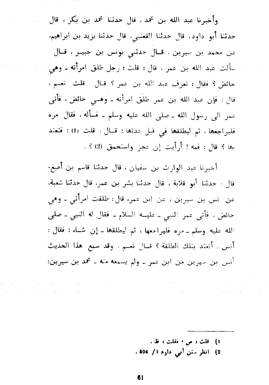 وَأَخْبَرَنَا عَبْدُ اللَّهِ بْنُ مُحَمَّدٍ قَالَ حَدَّثَنَا مُحَمَّدُ بْنُ بَكْرٍ قَالَ حَدَّثَنَا أَبُو دَاوُدَ قَالَ حَدَّثَنَا الْقَعْنَبِيُّ قَالَ حَدَّثَنَا يَزِيدُ بْنُ إِبْرَاهِيمَ عَنْ مُحَمَّدِ بن سِيرِينَ قَالَ حَدَّثَنِي يُونُسُ بْنُ جُبَيْرٍ قَالَ سَأَلْتُ عَبْدَ اللَّهِ بْنَ عُمَرَ قَالَ قُلْتُ رجل طلق امرأته وهي حائض فقال تعرف عَبْدَ اللَّهِ بْنَ عُمَرَ قَالَ قُلْتُ نَعَمْ قَالَ فَإِنَّ عَبْدَ اللَّهِ بْنَ عُمَرَ طَلَّقَ امْرَأَتَهُ وَهِيَ حَائِضٌ فَأَتَى عُمَرُ إِلَى رَسُولِ اللَّهِ صَلَّى اللَّهُ عَلَيْهِ وَسَلَّمَ فَسَأَلَهُ فَقَالَ مُرْهُ فَلْيُرَاجِعْهَا ثُمَّ لْيُطْلِّقْهَا فِي قَبْلِ عِدَّتِهَا قَالَ قُلْتُ فَتَعْتَدُّ بِهَا قَالَ فَمَهْ أَرَأَيْتَ إِنْ عَجَزَ وَاسْتَحْمَقَ أَخْبَرَنَا عَبْدُ الْوَارِثِ بْنُ سُفْيَانَ قَالَ حَدَّثَنَا قَاسِمُ بْنُ أَصْبَغَ قَالَ حَدَّثَنَا أَبُو قِلَابَةَ قَالَ حَدَّثَنَا بِشْرُ بْنُ عُمَرَ قَالَ حَدَّثَنَا شعبة عن أنس بن سِيرِينَ عَنِ ابْنِ عُمَرَ قَالَ طَلَّقْتُ امْرَأَتِي وَهِيَ حَائِضٌ فَأَتَى عُمَرُ النَّبِيَّ عَلَيْهِ السَّلَامُ فَقَالَ لَهُ النَّبِيُّ صَلَّى اللَّهُ عَلَيْهِ وَسَلَّمَ مُرْهُ فَلْيُرَاجِعْهَا ثُمَّ لْيُطَلِّقْهَا إِنْ شَاءَ فَقَالَ أنس أتعتد بتلك الطَّلْقَةُ قَالَ نَعَمْ وَقَدْ سَمِعَ هَذَا الْحَدِيثَ أنس بن سيرين من ابن عمر ولم يسمعه منه محمد بن سيرين