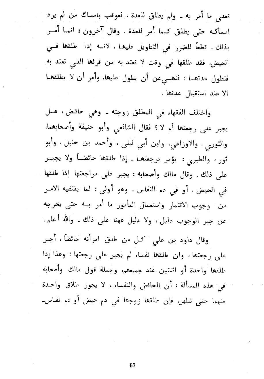 تَعَدَّى مَا أُمِرَ بِهِ وَلَمْ يُطَلِّقْ لِلْعِدَّةِ فَعُوقِبَ بِإِمْسَاكِ مَنْ لَمْ يُرِدْ إِمْسَاكَهُ حَتَّى يُطَلِّقَ كَمَا أُمِرَ لِلْعِدَّةِ وَقَالَ آخَرُونَ إِنَّمَا أُمِرَ بِذَلِكَ قَطْعًا لِلضَّرَرِ فِي التَّطْوِيلِ عَلَيْهَا لِأَنَّهُ إِذَا طَلَّقَهَا فِي الْحَيْضِ فَقَدْ طَلَّقَهَا فِي وَقْتٍ لَا تَعْتَدُّ بِهِ مِنْ قُرْئِهَا الَّذِي تَعْتَدُّ بِهِ فَتَطُولُ عِدَّتُهَا فَنُهِيَ عَنْ أَنْ يُطَوِّلَ عَلَيْهَا وَأُمِرَ أَنْ لَا يُطَلِّقَهَا إِلَّا عِنْدَ اسْتِقْبَالِ عَدَّتِهَا وَاخْتَلَفَ الْفُقَهَاءُ فِي الْمُطَلِّقِ زَوْجَتَهُ وَهِيَ حَائِضٌ هَلْ يُجْبَرُ عَلَى رَجَعَتِهَا أَمْ لَا فَقَالَ الشَّافِعِيُّ وَأَبُو حَنِيفَةَ وَأَصْحَابُهُمَا وَالثَّوْرِيُّ وَالْأَوْزَاعِيُّ وَابْنُ أَبِي لَيْلَى وَأَحْمَدُ بْنُ حَنْبَلٍ وَأَبُو ثَوْرٍ وَالطَّبَرِيُّ يُؤْمَرُ بِرَجْعَتِهَا إِذَا طَلَّقَهَا حَائِضًا وَلَا يُجْبَرُ عَلَى ذَلِكَ وَقَالَ مَالِكٌ وَأَصْحَابُهُ يُجْبَرُ عَلَى مُرَاجَعَتِهَا إِذَا طَلَّقَهَا فِي الْحَيْضِ أَوْ فِي دَمِ النِّفَاسِ وَهُوَ أَوْلَى لِمَا يَقْتَضِيهِ الْأَمْرُ مِنْ وُجُوبِ الِائْتِمَارِ وَاسْتِعْمَالُ الْمَأْمُورِ مَا أُمِرَ بِهِ حَتَّى يُخْرِجَهُ عَنْ جَبْرِ الْوُجُوبِ دَلِيلٌ وَلَا دَلِيلَ ههنا عَلَى ذَلِكَ وَاللَّهُ أَعْلَمُ وَقَالَ دَاوُدُ بْنُ عَلِيٍّ كُلُّ مَنْ طَلَّقَ امْرَأَتَهُ حَائِضًا أُجْبِرَ عَلَى رَجَعَتِهَا وَإِنْ طَلَّقَهَا نُفَسَاءَ لَمْ يُجْبَرْ عَلَى رَجَعَتِهَا وَهَذَا إِذَا طَلَّقَهَا وَاحِدَةً أَوِ اثْنَتَيْنِ عِنْدَ جَمِيعِهِمْ وَجُمْلَةُ قَوْلِ مَالِكٍ وَأَصْحَابِهِ فِي هَذِهِ الْمَسْأَلَةِ أَنَّ الْحَائِضَ وَالنُّفَسَاءَ لَا يَجُوزُ طَلَاقُ وَاحِدَةٍ مِنْهُمَا حَتَّى تَطْهُرَ فَإِنْ طَلَّقَهَا زَوْجُهَا فِي دَمِ حَيْضٍ أَوْ دَمِ نفاس