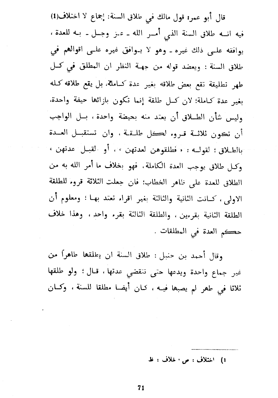 قَالَ أَبُو عُمَرَ قَوْلُ مَالِكٍ فِي طَلَاقِ السُّنَّةِ إِجْمَاعٌ لَا اخْتِلَافَ فِيهِ أَنَّهُ طَلَاقُ السُّنَّةِ الَّذِي أَمَرَ اللَّهُ عَزَّ وَجَلَّ بِهِ لِلْعِدَّةِ يُوَافِقُهُ عَلَى ذَلِكَ غَيْرُهُ وَهُوَ لَا يُوَافِقُ غَيْرَهُ عَلَى أَقْوَالِهِمْ فِي طَلَاقِ السُّنَّةِ وَيُعَضِّدُ قَوْلَهُ مِنْ جِهَةِ النَّظَرِ أَنَّ الْمُطَلِّقَ فِي كُلِّ طُهْرٍ تَطْلِيقَةً تَقَعُ بَعْضُ طَلَاقِهِ بِغَيْرِ عِدَّةٍ كَامِلَةٍ بَلْ يَقَعُ طَلَاقُهُ كُلُّهُ بِغَيْرِ عِدَّةٍ كَامِلَةٍ لِأَنَّ كُلَّ طَلْقَةٍ إِنَّمَا تكون بأزائها حيضة وَاحِدَةً وَلَيْسَ شَأْنُ الطَّلَاقِ أَنْ يُعْتَدَّ مِنْهُ بِحَيْضَةٍ وَاحِدَةٍ بَلِ الْوَاجِبُ أَنْ تَكُونَ ثَلَاثَةَ قُرُوءٍ لِكُلِّ طَلْقَةٍ وَأَنْ تُسْتَقْبَلَ الْعِدَّةُ بِالطَّلَاقِ لِقَوْلِهِ فَطَلِّقُوهُنَّ لِعِدَّتِهِنَّ أَوْ لِقُبُلِ عِدَّتِهِنَّ وَكُلُّ طَلَاقٍ يُوجِبُ الْعِدَّةَ الْكَامِلَةَ فَهُوَ بِخِلَافِ مَا أَمَرَ اللَّهُ بِهِ مِنَ الطَّلَاقِ لِلْعِدَّةِ عَلَى ظَاهِرِ الْخِطَابِ فَإِنْ جَعَلْتَ الثَّلَاثَةَ قُرُوءٍ لِلطَّلْقَةِ الْأُولَى كَانَتِ الثَّانِيَةُ وَالثَّالِثَةُ بِغَيْرِ أَقْرَاءٍ تَعْتَدُّ بِهَا وَمَعْلُومٌ أَنَّ الطَّلْقَةَ الثَّانِيَةَ بِقُرْءَيْنِ وَالطَّلْقَةَ الثَّالِثَةَ بِقُرْءٍ وَاحِدٍ وَهَذَا خِلَافُ حُكْمِ الْعِدَّةِ فِي الْمُطَلَّقَاتِ وَقَالَ أَحْمَدُ بْنُ حَنْبَلٍ طَلَاقُ السُّنَّةِ أَنْ يُطَلِّقَهَا طَاهِرًا مِنْ غَيْرِ جِمَاعٍ وَاحِدَةً وَيَدَعُهَا حَتَّى تَنْقَضِيَ عِدَّتُهَا قَالَ وَلَوْ طَلَّقَهَا ثَلَاثًا فِي طُهْرٍ لَمْ يُصِبْهَا فِيهِ كَانَ أَيْضًا مُطَلِّقًا لِلسُّنَّةِ وَكَانَ