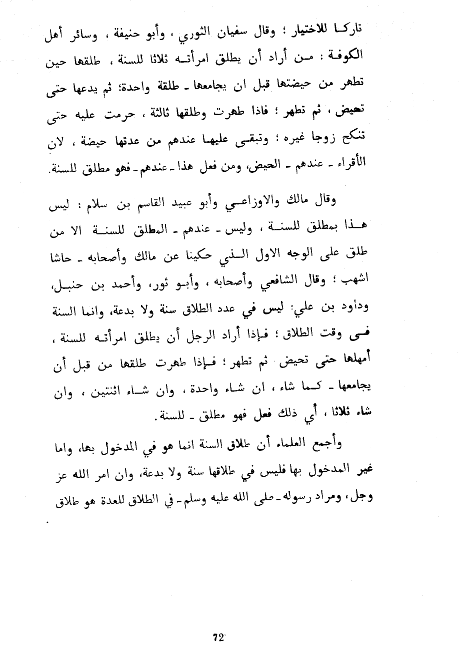 تَارِكًا لِلِاخْتِيَارِ وَقَالَ سُفْيَانُ الثَّوْرِيُّ وَأَبُو حَنِيفَةَ وَسَائِرُ أَهْلِ الْكُوفَةِ مَنْ أَرَادَ أَنْ يُطَلِّقَ امْرَأَتَهُ ثَلَاثًا لِلسُّنَّةِ طَلَّقَهَا حِينَ تَطْهُرُ مِنْ حَيْضَتِهَا قَبْلَ أَنْ يُجَامِعَهَا طَلْقَةً وَاحِدَةً ثُمَّ يَدَعُهَا حَتَّى تَحِيضَ ثُمَّ تَطْهُرَ فَإِذَا طَهُرَتْ وطلقها ثالثة حرمن عَلَيْهِ حَتَّى تَنْكِحَ زَوْجًا غَيْرَهُ وَتَبْقَى عَلَيْهَا عِنْدَهُمْ مِنْ عِدَّتِهَا حَيْضَةٌ لِأَنَّ الْأَقْرَاءَ عِنْدَهُمُ الْحِيَضُ وَمَنْ فَعَلَ هَذَا عِنْدَهُمْ فَهُوَ مُطَلِّقٌ لِلسُّنَّةِ وَقَالَ مَالِكٌ وَالْأَوْزَاعِيُّ وَأَبُو عُبَيْدٍ الْقَاسِمُ بْنُ سَلَّامٍ لَيْسَ هَذَا بِمُطَلِّقٍ لِلسُّنَّةِ وَلَيْسَ عِنْدَهُمُ الْمُطَلِّقُ لِلسُّنَّةِ إِلَّا مَنْ طَلَّقَ عَلَى الْوَجْهِ الْأَوَّلِ الَّذِي حَكَيْنَا عَنْ مَالِكٍ وَأَصْحَابِهِ حَاشَا أَشْهَبَ وَقَالَ الشَّافِعِيُّ وَأَصْحَابُهُ وَأَبُو ثَوْرٍ وَأَحْمَدُ بْنُ حَنْبَلٍ وَدَاوُدُ بْنُ عَلِيٍّ لَيْسَ فِي عَدَدِ الطَّلَاقِ سُنَّةٌ وَلَا بِدْعَةٌ وَإِنَّمَا السُّنَّةُ فِي وَقْتِ الطَّلَاقِ فَإِذَا أَرَادَ الرَّجُلُ أَنْ يُطَلِّقَ امْرَأَتَهُ لِلسُّنَّةِ أَمْهَلَهَا حَتَّى تَحِيضَ ثُمَّ تَطْهُرَ فَإِذَا طَهُرَتْ طَلَّقَهَا مِنْ قَبْلِ أَنْ يُجَامِعَهَا كَمَا شَاءَ إِنْ شَاءَ وَاحِدَةً وَإِنْ شَاءَ اثْنَتَيْنِ وَإِنْ شَاءَ ثَلَاثًا أَيَّ ذَلِكَ فَعَلَ فَهُوَ مُطَلِّقٌ لِلسُّنَّةِ وَأَجْمَعَ الْعُلَمَاءُ أَنَّ طَلَاقَ السُّنَّةِ إِنَّمَا هُوَ فِي الْمَدْخُولِ بِهَا وَأَمَّا غَيْرُ الْمَدْخُولِ بِهَا فَلَيْسَ فِي طَلَاقِهَا سُنَّةٌ وَلَا بِدْعَةٌ وَإِنَّ أَمْرَ اللَّهِ عَزَّ وَجَلَّ وَمُرَادَ رَسُولِهِ صَلَّى اللَّهُ عَلَيْهِ وَسَلَّمَ فِي الطَّلَاقِ لِلْعِدَّةِ هُوَ طَلَاقُ
