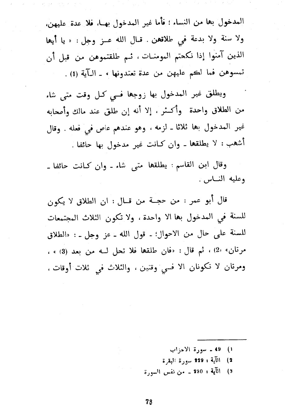 الْمَدْخُولِ بِهَا مِنَ النِّسَاءِ فَأَمَّا غَيْرُ الْمَدْخُولِ بِهَا فَلَا عِدَّةَ عَلَيْهِنَّ وَلَا سُنَّةَ وَلَا بِدْعَةَ فِي طَلَاقِهِنَّ قَالَ اللَّهُ عَزَّ وَجَلَّ يَا أَيُّهَا الَّذِينَ آمَنُوا إِذَا نَكَحْتُمُ الْمُؤْمِنَاتِ ثُمَّ طَلَّقْتُمُوهُنَّ مِنْ قَبْلِ أَنْ تَمَسُّوهُنَّ فَمَا لَكُمْ عَلَيْهِنَّ مِنْ عِدَّةٍ تَعْتَدُّونَهَا الْآيَةَ وَيُطَلِّقُ غَيْرَ الْمَدْخُولِ بِهَا زَوُجُهَا فِي كُلِّ وَقْتٍ مَتَى شَاءَ مِنَ الطَّلَاقِ وَاحِدَةً وَأَكْثَرَ إِلَّا أَنَّهُ إِنْ طَلَّقَ عِنْدَ مَالِكٍ وَأَصْحَابِهِ غَيْرَ الْمَدْخُولِ بِهَا ثَلَاثًا لَزِمَهُ وَهُوَ عِنْدَهُمْ عَاصٍ فِي فِعْلِهِ وَقَالَ أَشْهَبُ لَا يُطَلِّقُهَا وَإِنْ كَانَتْ غَيْرَ مَدْخُولٍ بِهَا حَائِضًا وَقَالَ ابْنُ الْقَاسِمِ يُطَلِّقُهَا مَتَى شَاءَ وَإِنْ كَانَتْ حَائِضًا وَعَلَيْهِ النَّاسُ قَالَ أَبُو عُمَرَ مِنْ حُجَّةِ مَنْ قَالَ إِنَّ الطَّلَاقَ لَا يَكُونُ لِلسُّنَّةِ فِي الْمَدْخُولِ بِهَا إِلَّا وَاحِدَةً وَلَا تَكُونُ الثَّلَاثُ الْمُجْتَمِعَاتُ لِلسُّنَّةِ عَلَى حَالٍ مِنَ الْأَحْوَالِ قَوْلَ اللَّهِ عَزَّ وَجَلَّ الطَّلَاقُ مَرَّتَانِ ثُمَّ قَالَ فَإِنْ طَلَّقَهَا فَلَا تَحِلُّ لَهُ مِنْ بَعْدُ وَمَرَّتَانِ لَا تَكُونَانِ إِلَّا فِي وَقْتَيْنِ وَالثَّلَاثُ فِي ثلاث أوقات