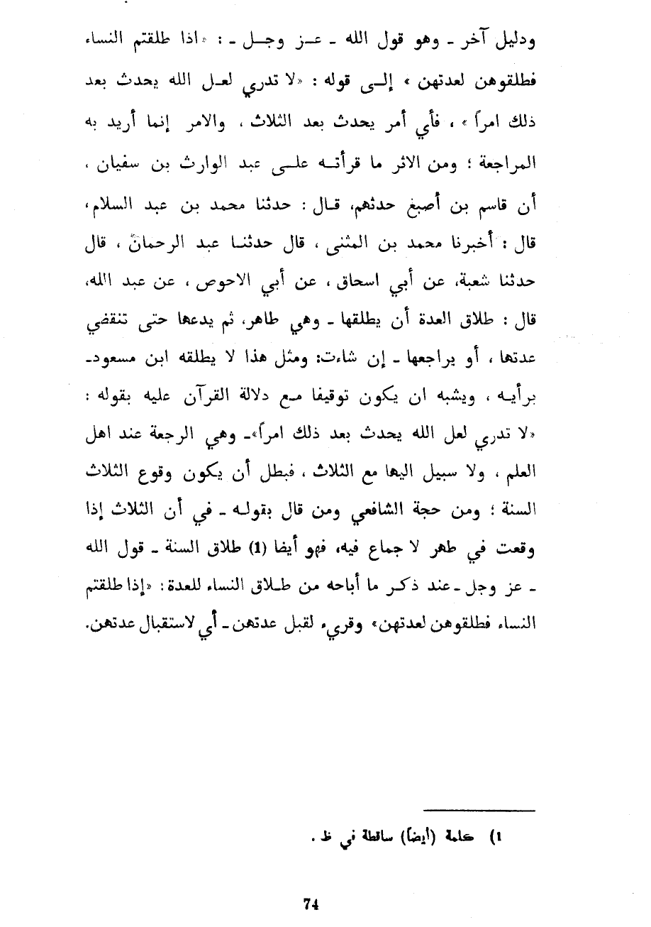 وَدَلِيلٌ آخَرُ وَهُوَ قَوْلُ اللَّهِ عَزَّ وَجَلَّ إِذَا طَلَّقْتُمُ النِّسَاءَ فَطَلِّقُوهُنَّ لِعِدَّتِهِنَّ إِلَى قَوْلِهِ لَا تَدْرِي لَعَلَّ اللَّهَ يُحْدِثُ بَعْدَ ذَلِكَ أَمْرًا فَأَيُّ أَمْرٍ يَحْدُثُ بَعْدَ الثَّلَاثِ وَالْأَمْرُ إِنَّمَا أُرِيدَ بِهِ الْمُرَاجَعَةُ وَمِنَ الْأَثَرِ مَا قَرَأْتُهُ عَلَى عَبْدِ الْوَارِثِ بْنِ سُفْيَانَ أَنَّ قَاسِمَ بْنَ أَصْبَغَ حَدَّثَهُمْ قَالَ حَدَّثَنَا مُحَمَّدُ بْنُ عَبْدِ السَّلَامِ قَالَ أَخْبَرَنَا مُحَمَّدُ بْنُ الْمُثَنَّى قَالَ حَدَّثَنَا عبد الرحمان قَالَ حَدَّثَنَا شُعْبَةُ عَنْ أَبِي إِسْحَاقَ عَنْ أَبِي الْأَحْوَصِ عَنِ عَبْدِ اللَّهِ قَالَ طَلَاقُ الْعِدَّةِ أَنْ يُطَلِّقَهَا وَهِيَ طَاهِرٌ ثُمَّ يَدَعَهَا حَتَّى تَنْقَضِيَ عِدَّتُهَا أَوْ يُرَاجِعَهَا إِنْ شَاءَتْ وَمِثْلُ هَذَا لَا يُطَلِّقُهُ ابْنُ مَسْعُودٍ بِرَأْيِهِ وَيُشْبِهُ أَنْ يَكُونَ تَوْقِيفًا مَعَ دَلَالَةِ الْقُرْآنِ عَلَيْهِ بِقَوْلِهِ لَا تَدْرِي لَعَلَّ اللَّهَ يُحْدِثُ بَعْدَ ذَلِكَ أَمْرًا وَهِيَ الرَّجْعَةُ عِنْدَ أَهْلِ الْعِلْمِ وَلَا سَبِيلَ إِلَيْهَا مَعَ الثَّلَاثِ فَبَطَلَ أَنْ يَكُونَ وُقُوعُ الثَّلَاثِ السُّنَّةَ وَمِنْ حُجَّةِ الشَّافِعِيِّ وَمَنْ قَالَ بِقَوْلِهِ فِي أَنَّ الثَّلَاثَ إِذَا وَقَعَتْ فِي طُهْرٍ لَا جِمَاعَ فِيهِ فَهُوَ أَيْضًا طَلَاقُ السُّنَّةِ قَوْلُ اللَّهِ عَزَّ وَجَلَّ عِنْدَ ذِكْرِ مَا أَبَاحَهُ مِنْ طَلَاقِ النِّسَاءِ لِلْعِدَّةِ إِذَا طَلَّقْتُمُ النِّسَاءَ فَطَلِّقُوهُنَّ لِعِدَّتِهِنَّ وَقُرِئَ لِقَبْلِ عِدَّتِهِنَّ أَيْ لِاسْتِقْبَالِ عِدَّتِهِنَّ