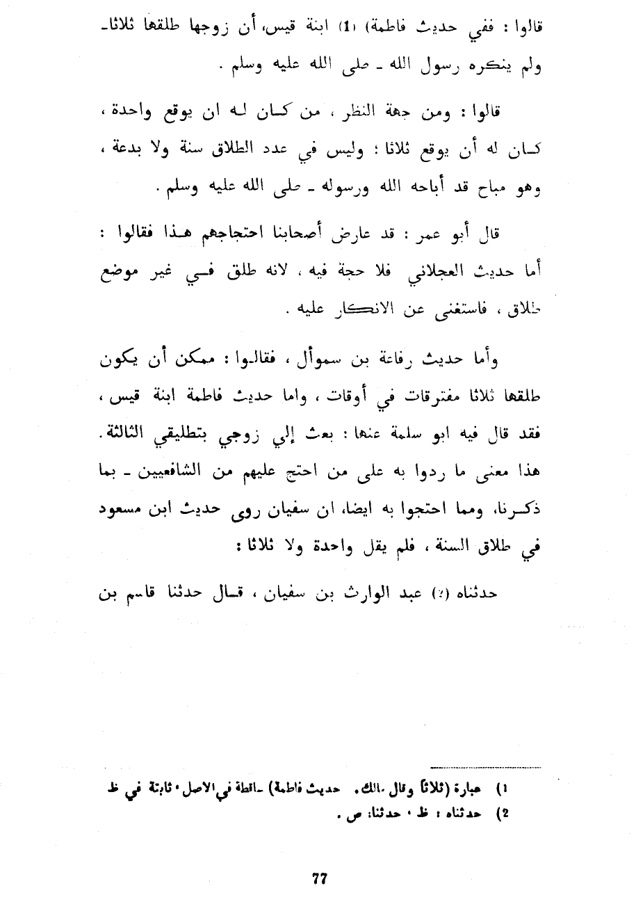 قَالُوا فَفِي حَدِيثِ فَاطِمَةَ) ابْنَةِ قَيْسٍ أَنَّ زَوْجَهَا طَلَّقَهَا ثَلَاثًا وَلَمْ يُنْكِرْهُ رَسُولِ اللَّهِ صَلَّى اللَّهُ عَلَيْهِ وَسَلَّمَ قَالُوا وَمِنْ جِهَةِ النَّظَرِ مَنْ كَانَ لَهُ أَنْ يُوقِعَ وَاحِدَةً كَانَ لَهُ أَنْ يُوقِعَ ثَلَاثًا وَلَيْسَ فِي عَدَدِ الطَّلَاقِ سُنَّةٌ وَلَا بِدْعَةٌ وَهُوَ مُبَاحٌ قَدْ أَبَاحَهُ اللَّهَ وَرَسُولَهُ صَلَّى اللَّهُ عَلَيْهِ وَسَلَّمَ قَالَ أَبُو عُمَرَ قَدْ عَارَضَ أَصْحَابُنَا احْتِجَاجَهُمْ هَذَا فَقَالُوا أَمَّا حَدِيثُ الْعَجْلَانِيِّ فَلَا حُجَّةَ فِيهِ لِأَنَّهُ طَلَّقَ فِي غَيْرِ مَوْضِعِ طَلَاقٍ فَاسْتَغْنَى عَنِ الْإِنْكَارِ عَلَيْهِ وَأَمَّا حَدِيثُ رِفَاعَةَ بْنِ سَمَوْأَلٍ فَقَالُوا مُمْكِنٌ أَنْ يَكُونَ طَلَّقَهَا ثَلَاثًا مُفْتَرِقَاتٍ فِي أَوْقَاتٍ وَأَمَّا حَدِيثُ فَاطِمَةَ ابْنَةِ قَيْسٍ فَقَدْ قَالَ فِيهِ أَبُو سَلَمَةَ عَنْهَا بَعَثَ إِلَيَّ زَوْجِي بِتَطْلِيقِي الثَّالِثَةَ هَذَا مَعْنَى مَا رَدُّوا بِهِ عَلَى مَنِ احْتَجَّ عَلَيْهِمْ مِنَ الشَّافِعِيِّينَ بِمَا ذَكَرْنَا وَمِمَّا احْتَجُّوا بِهِ أَيْضًا أَنَّ سُفْيَانَ رَوَى حَدِيثَ ابْنِ مَسْعُودٍ فِي طَلَاقِ السُّنَّةِ فَلَمْ يَقُلْ وَاحِدَةً وَلَا ثَلَاثًا حَدَّثَنَا عَبْدُ الْوَارِثِ بْنُ سُفْيَانَ قَالَ حَدَّثَنَا قَاسِمُ بْنُ