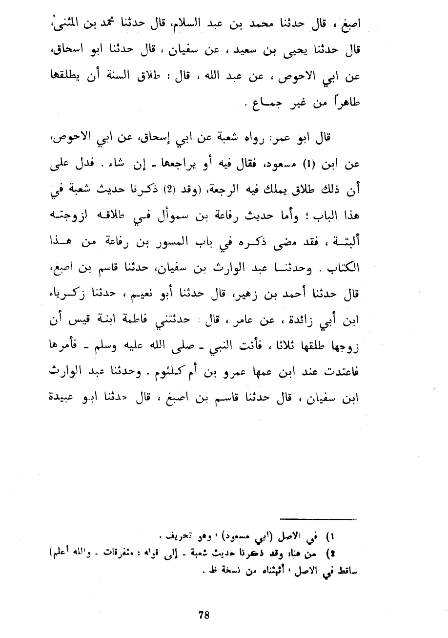 أَصْبَغَ قَالَ حَدَّثَنَا مُحَمَّدُ بْنُ عَبْدِ السَّلَامِ قَالَ حَدَّثَنَا مُحَمَّدُ بْنُ الْمُثَنَّى قَالَ حَدَّثَنَا يَحْيَى بْنُ سَعِيدٍ عَنْ سُفْيَانَ قَالَ حَدَّثَنَا أَبُو إِسْحَاقَ عَنْ أَبِي الْأَحْوَصِ عَنْ عَبْدِ اللَّهِ قَالَ طَلَاقُ السُّنَّةِ أَنْ يُطَلِّقَهَا طَاهِرًا مِنْ غَيْرِ جِمَاعٍ قَالَ أَبُو عُمَرَ رَوَاهُ شُعْبَةُ عَنْ أَبِي إِسْحَاقَ عَنْ أَبِي الْأَحْوَصِ عَنِ ابْنِ مَسْعُودٍ فَقَالَ فِيهِ أَوْ يُرَاجِعُهَا إِنْ شَاءَ فَدَلَّ عَلَى أَنَّ ذَلِكَ طَلَاقٌ يَمْلِكُ فِيهِ الرَّجْعَةَ (وَقَدْ (2) ذَكَرْنَا حَدِيثَ شُعْبَةَ فِي هَذَا الْبَابِ وَأَمَّا حَدِيثُ رِفَاعَةَ بْنِ سَمَوْأَلٍ فِي طَلَاقِهِ لِزَوْجَتِهِ الْبَتَّةَ فَقَدْ مَضَى ذِكْرُهُ فِي بَابِ الْمِسْوَرِ بْنِ رِفَاعَةَ مِنْ هَذَا الْكِتَابِ وَحَدَّثَنَا عَبْدُ الْوَارِثِ بْنُ سُفْيَانَ حَدَّثَنَا قَاسِمُ بْنُ أَصْبَغَ قَالَ حَدَّثَنَا أَحْمَدُ بْنُ زُهَيْرٍ قَالَ حَدَّثَنَا أَبُو نُعَيْمٍ حَدَّثَنَا زَكَرِيَّاءُ بْنُ أَبِي زَائِدَةَ عَنْ عَامِرٍ قَالَ حَدَّثَتْنِي فَاطِمَةُ ابْنَةُ قَيْسٍ أَنَّ زَوْجَهَا طَلَّقَهَا ثَلَاثًا فَأَتَتِ النَّبِيَّ صَلَّى اللَّهُ عَلَيْهِ وَسَلَّمَ فَأَمَرَهَا فَاعْتَدَّتْ عِنْدَ ابْنِ عَمِّهَا عَمْرِو بْنِ أُمِّ كُلْثُومٍ وَحَدَّثَنَا عَبْدُ الْوَارِثِ بْنُ سُفْيَانَ قَالَ حَدَّثَنَا قَاسِمُ بْنُ أَصْبَغَ قَالَ حَدَّثَنَا أَبُو عُبَيْدَةَ