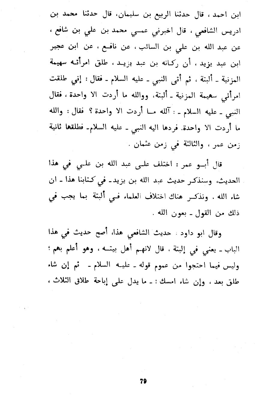 ابن أَحْمَدَ قَالَ حَدَّثَنَا الرَّبِيعُ بْنُ سُلَيْمَانَ قَالَ حَدَّثَنَا مُحَمَّدُ بْنُ إِدْرِيسَ الشَّافِعِيُّ قَالَ أَخْبَرَنِي عَمِّي مُحَمَّدُ بْنُ عَلِيِّ بْنِ شَافِعٍ عَنْ عَبْدِ اللَّهِ بْنِ عَلِيِّ بْنِ السَّائِبِ عَنْ نَافِعٍ عَنِ ابْنِ عُجَيْرِ بْنِ عَبْدِ يَزِيدَ أَنَّ رُكَانَةَ بْنَ عَبْدِ يَزِيدَ طَلَّقَ امْرَأَتَهُ سُهَيْمَةَ الْمُزَنِيَّةَ الْبَتَّةَ ثُمَّ أَتَى النَّبِيَّ عَلَيْهِ السَّلَامُ فَقَالَ إِنِّي طَلَّقْتُ امْرَأَتِي سُهَيْمَةَ الْمُزَنِيَّةَ الْبَتَّةَ وَوَاللَّهِ مَا أَرَدْتُ إِلَّا وَاحِدَةً فَقَالَ النَّبِيُّ عَلَيْهِ السَّلَامُ آللَّهِ مَا أَرَدْتَ إِلَّا وَاحِدَةً فَقَالَ وَاللَّهِ مَا أَرَدْتُ إِلَّا وَاحِدَةً فَرَدَّهَا إِلَيْهِ النَّبِيُّ عَلَيْهِ السَّلَامُ فَطَلَّقَهَا ثَانِيَةً زَمَنَ عُمَرَ وَالثَّالِثَةَ فِي زَمَنِ عُثْمَانَ قَالَ أَبُو عُمَرَ اخْتُلِفَ عَلَى عَبْدِ اللَّهِ بْنِ عَلِيٍّ فِي هَذَا الْحَدِيثِ وَسَنَذْكُرُ حَدِيثَ عَبْدِ اللَّهِ بْنِ يَزِيدَ فِي كِتَابِنَا هَذَا إِنْ شَاءَ اللَّهُ وَنَذْكُرُ هُنَاكَ اخْتِلَافَ الْعُلَمَاءِ فِي الْبَتَّةَ بِمَا يَجِبُ فِي ذَلِكَ مِنَ الْقَوْلِ بِعَوْنِ اللَّهِ وَقَالَ أَبُو دَاوُدَ حَدِيثُ الشَّافِعِيِّ هَذَا أَصَحُّ حَدِيثٍ فِي هَذَا الْبَابِ يَعْنِي فِي الْبَتَّةَ قَالَ لِأَنَّهُمْ أَهْلُ بَيْتِهِ وَهُوَ أَعْلَمُ بِهِمْ وَلَيْسَ فِيمَا احْتَجُّوا مِنْ عُمُومِ قَوْلِهِ عَلَيْهِ السَّلَامُ ثُمَّ إِنْ شَاءَ طَلَّقَ بَعْدُ وَإِنْ شَاءَ أَمْسَكَ مَا يَدُلُّ عَلَى إِبَاحَةِ طَلَاقِ الثَّلَاثِ