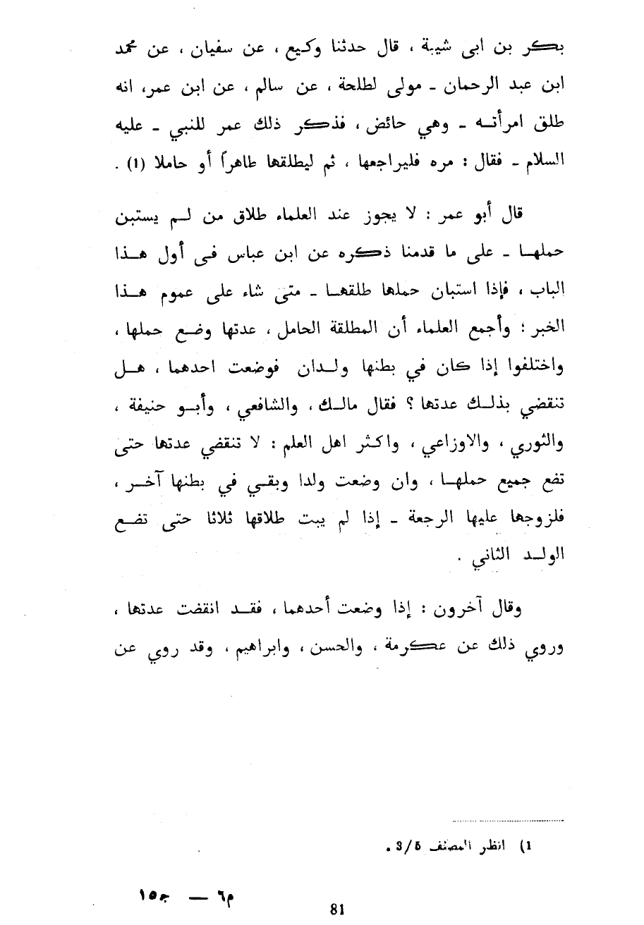 بَكْرِ بْنُ أَبِي شَيْبَةَ قَالَ حَدَّثَنَا وَكِيعٌ عن سفيان عن محمد بن عبد الرحمان مَوْلًى لِطَلْحَةَ عَنْ سَالِمٍ عَنِ ابْنِ عُمَرَ أَنَّهُ طَلَّقَ امْرَأَتَهُ وَهِيَ حَائِضٌ فَذَكَرَ ذَلِكَ عُمَرُ لِلنَّبِيِّ عَلَيْهِ السَّلَامُ فَقَالَ مُرْهُ فَلْيُرَاجِعْهَا ثُمَّ لْيُطَلِّقْهَا طَاهِرًا أَوْ حَامِلًا قَالَ أَبُو عُمَرَ لَا يَجُوزُ عِنْدَ الْعُلَمَاءِ طَلَاقُ مَنْ لَمْ يَسْتَبِنْ حَمْلَهَا عَلَى مَا قَدَّمْنَا ذِكْرَهُ عَنِ ابْنِ عَبَّاسٍ فِي أَوَّلِ هَذَا الْبَابِ فَإِذَا اسْتَبَانَ حَمْلَهَا طَلَّقَهَا مَتَى شَاءَ عَلَى عُمُومِ هَذَا الْخَبَرِ وَأَجْمَعَ الْعُلَمَاءُ أَنَّ الْمُطَلَّقَةَ الْحَامِلَ عِدَّتُهَا وَضْعُ حَمْلِهَا وَاخْتَلَفُوا إِذَا كَانَ فِي بَطْنِهَا وَلَدَانِ فَوَضَعَتْ أَحَدَهُمَا هَلْ تَنْقَضِي بِذَلِكَ عِدَّتُهَا فَقَالَ مَالِكٌ وَالشَّافِعِيُّ وَأَبُو حَنِيفَةَ وَالثَّوْرِيُّ وَالْأَوْزَاعِيُّ وَأَكْثَرُ أَهْلِ الْعِلْمِ لَا تَنْقَضِي عِدَّتُهَا حَتَّى تَضَعَ جَمِيعَ حَمْلِهَا وَإِنْ وَضَعَتْ ولدا وبقي في بطنها آخَرُ فَلِزَوْجِهَا عَلَيْهَا الرَّجْعَةُ إِذَا لَمْ يَبُتَّ طَلَاقَهَا ثَلَاثًا حَتَّى تَضَعَ الْوَلَدَ الثَّانِيَ وَقَالَ آخَرُونَ إِذَا وَضَعَتْ أَحَدَهُمَا فَقَدِ انْقَضَتْ عِدَّتُهَا وَرُوِيَ ذَلِكَ عَنْ عِكْرِمَةَ وَالْحَسَنِ وَإِبْرَاهِيمَ وَقَدْ روي عن
