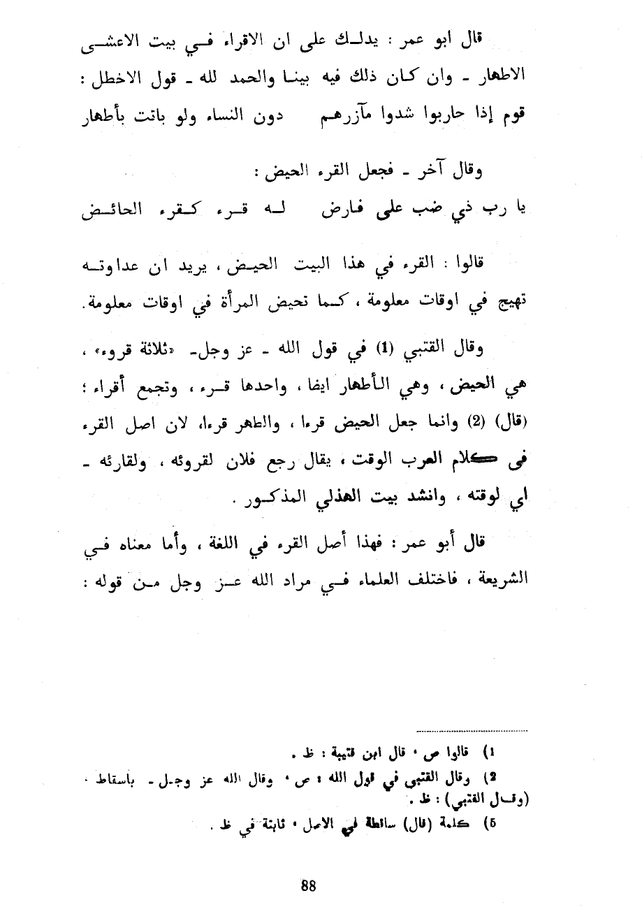 قَالَ أَبُو عُمَرَ يَدُلُّكَ عَلَى أَنَّ الْأَقْرَاءَ فِي بَيْتِ الْأَعْشَى الْأَطْهَارُ وَإِنْ كَانَ ذَلِكَ فِيهِ بَيِّنًا وَالْحَمْدُ لِلَّهِ قَوْلُ الْأَخْطَلِ ... قَوْمٌ إِذَا حَارَبُوا شَدُّوا مَآزِرَهُمْ ... دُونَ النِّسَاءِ وَلَوْ بَاتَتْ بِأَطْهَارِ ... وَقَالَ آخَرُ فَجَعَلَ الْقُرْءَ الْحَيْضَ ... يَا رُبَّ ذِي ضَبٍّ عَلَى فَارِضِ ... لَهُ قُرْءٌ كَقُرْءِ الْحَائِضِ ... قَالُوا الْقُرْءُ فِي هَذَا الْبَيْتِ الْحَيْضُ يُرِيدُ أَنَّ عَدَاوَتَهُ تَهِيجُ فِي أَوْقَاتٍ مَعْلُومَةٍ كَمَا تَحِيضُ الْمَرْأَةُ فِي أَوْقَاتٍ مَعْلُومَةٍ وَقَالَ الْقُتَبِيُّ فِي قَوْلِ اللَّهِ عَزَّ وَجَلَّ ثَلَاثَةَ قُرُوءٍ هِيَ الْحِيَضُ وَهِيَ الْأَطْهَارُ أَيْضًا وَاحِدُهَا قُرْءٌ وَتُجْمَعُ أَقْرَاءٌ (قَالَ) وَإِنَّمَا جَعَلَ الْحَيْضَ قُرْءًا وَالطُّهْرَ قُرْءًا لِأَنَّ أَصْلَ الْقُرْءِ فِي كَلَامِ الْعَرَبِ الْوَقْتُ يُقَالُ رَجَعَ فُلَانٌ لِقُرُوئِهِ وَلِقَارِئِهِ أَيْ لِوَقْتِهِ وَأَنْشَدَ بَيْتَ الْهُذَلِيِّ الْمَذْكُورَ قَالَ أَبُو عُمَرَ فَهَذَا أَصْلُ الْقُرْءِ فِي اللُّغَةِ وَأَمَّا مَعْنَاهُ فِي الشَّرِيعَةِ فَاخْتَلَفَ الْعُلَمَاءُ فِي مُرَادِ اللَّهِ عَزَّ وَجَلَّ من قوله