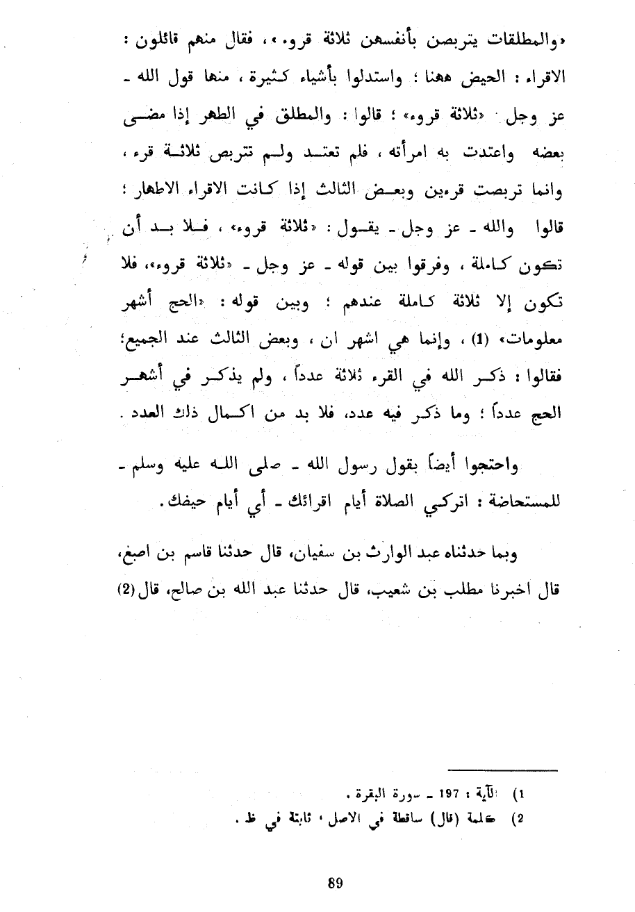 وَالْمُطَلَّقَاتُ يَتَرَبَّصْنَ بِأَنْفُسِهِنَّ ثَلَاثَةَ قُرُوءٍ فَقَالَ مِنْهُمْ قائلون الأقراء الحيض ههنا وَاسْتَدَلُّوا بِأَشْيَاءَ كَثِيرَةٍ مِنْهَا قَوْلُ اللَّهِ عَزَّ وَجَلَّ ثَلَاثَةَ قُرُوءٍ قَالُوا وَالْمُطَلِّقُ فِي الطُّهْرِ إِذَا مَضَى بَعْضُهُ وَاعْتَدَّتْ بِهِ امْرَأَتُهُ فَلَمْ تَعْتَدَّ وَلَمْ تَتَرَبَّصْ ثَلَاثَةَ قُرُوءٍ وَإِنَّمَا تَرَبَّصَتْ قُرْءَيْنِ وَبَعْضَ الثَّالِثِ إِذَا كَانَتِ الْأَقْرَاءُ الْأَطْهَارَ قَالُوا وَاللَّهُ عَزَّ وَجَلَّ يَقُولُ ثَلَاثَةَ قُرُوءٍ فَلَا بُدَّ أَنْ تَكُونَ كَامِلَةً وَفَرَّقُوا بَيْنَ قَوْلِهِ عَزَّ وَجَلَّ ثَلَاثَةَ قُرُوءٍ فَلَا تَكُونُ إِلَّا ثَلَاثَةً كَامِلَةً عِنْدَهُمْ وَبَيْنَ قَوْلِهِ الْحَجُّ أَشْهُرٌ مَعْلُومَاتٌ وَإِنَّمَا هِيَ شَهْرَانِ وَبَعْضُ الثَّالِثِ عِنْدَ الْجَمِيعِ فَقَالُوا ذَكَرَ اللَّهُ فِي الْقُرْءِ ثَلَاثَةً عَدَدًا وَلَمْ يَذْكُرْ فِي أَشْهُرِ الْحَجِّ عَدَدًا وَمَا ذُكِرَ فِيهِ عَدَدٌ فَلَا بُدَّ مِنْ إِكْمَالِ ذَلِكَ الْعَدَدِ وَاحْتَجُّوا أَيْضًا بِقَوْلِ رَسُولِ اللَّهِ صَلَّى اللَّهُ عَلَيْهِ وَسَلَّمَ لِلْمُسْتَحَاضَةِ اتْرُكِي الصَّلَاةَ أَيَّامَ أَقْرَائِكِ أَيْ أَيَّامَ حَيْضِكِ وَبِمَا حَدَّثَنَاهُ عَبْدُ الْوَارِثِ بْنُ سُفْيَانَ قَالَ حَدَّثَنَا قَاسِمُ بْنُ أَصْبَغَ قَالَ أَخْبَرَنَا مُطَّلِبُ بن شعيب ققال حَدَّثَنَا عَبْدُ اللَّهِ بْنُ صَالِحٍ قَالَ