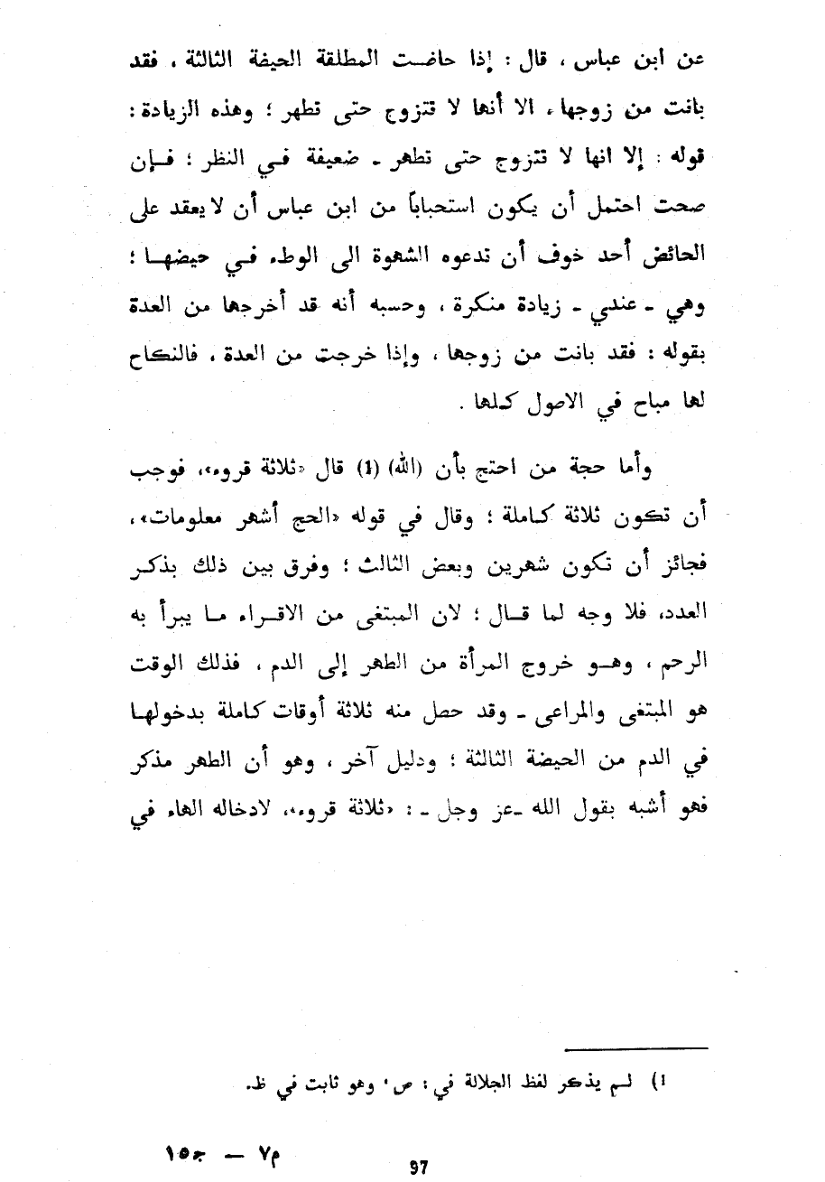 عَنِ ابْنِ عَبَّاسٍ قَالَ إِذَا حَاضَتِ الْمُطَلَّقَةُ الْحَيْضَةَ الثَّالِثَةَ فَقَدْ بَانَتْ مِنْ زَوْجِهَا إِلَّا أَنَّهَا لَا تَتَزَوَّجُ حَتَّى تَطْهُرَ وَهَذِهِ الزِّيَادَةُ قَوْلُهُ إِلَّا أَنَّهَا لَا تَتَزَوَّجُ حَتَّى تَطْهُرَ ضَعِيفَةٌ فِي النَّظَرِ فَإِنْ صَحَّتِ احْتَمَلَ أَنْ يَكُونَ اسْتِحْبَابًا مِنِ ابْنِ عَبَّاسٍ أَنْ لَا يَعْقِدَ عَلَى الْحَائِضِ أَحَدٌ خَوْفَ أَنْ تَدْعُوَهُ الشَّهْوَةُ إِلَى الْوَطْءِ فِي حَيْضِهَا وَهِيَ عِنْدِي زِيَادَةٌ مُنْكَرَةٌ وَحَسْبُهُ أَنَّهُ قَدْ أَخْرَجَهَا مِنَ الْعِدَّةِ بِقَوْلِهِ فَقَدْ بَانَتْ مِنْ زَوْجِهَا وَإِذَا خَرَجَتْ مِنَ الْعِدَّةِ فَالنِّكَاحُ لَهَا مُبَاحٌ فِي الْأُصُولِ كُلِّهَا وَأَمَّا حُجَّةُ مَنِ احْتَجَّ بِأَنَّ (اللَّهَ) قَالَ ثَلَاثَةَ قُرُوءٍ فَوَجَبَ أَنْ تَكُونَ ثَلَاثَةً كَامِلَةً وَقَالَ فِي قَوْلِهِ الْحَجُّ أَشْهُرٌ مَعْلُومَاتٌ فَجَائِزٌ أَنْ تَكُونَ شَهْرَيْنِ وَبَعْضَ الثَّالِثِ وَفَرَّقَ بَيْنَ ذَلِكَ بِذِكْرِ الْعَدَدِ فَلَا وَجْهَ لِمَا قَالَ لِأَنَّ الْمُبْتَغَى مِنَ الْأَقْرَاءِ مَا يَبْرَأُ بِهِ الرَّحِمُ وَهُوَ خُرُوجُ الْمَرْأَةِ مِنَ الطُّهْرِ إِلَى الدَّمِ فَذَلِكَ الْوَقْتُ هُوَ الْمُبْتَغَى وَالْمُرَاعَى وَقَدْ حَصَلَ مِنْهُ ثَلَاثَةُ أَوْقَاتٍ كَامِلَةٍ بِدُخُولِهَا فِي الدَّمِ مِنَ الْحَيْضَةِ الثَّالِثَةِ وَدَلِيلٌ آخَرُ وَهُوَ أَنَّ الطُّهْرَ مُذَكَّرٌ فَهُوَ أَشْبَهُ بِقَوْلِ اللَّهِ عَزَّ وَجَلَّ ثَلَاثَةَ قُرُوءٍ لِإِدْخَالِهِ الهاء في