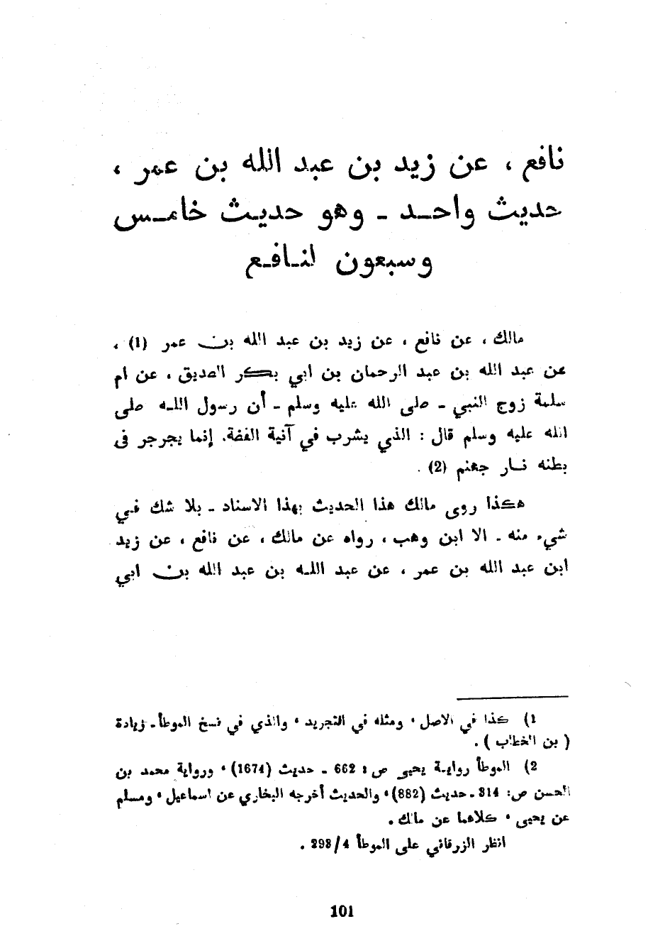 نافع عن زيد بْنِ عَبْدِ اللَّهِ بْنِ عُمَرَ حَدِيثٌ وَاحِدٌ وَهُوَ حَدِيثٌ خَامِسٌ وَسَبْعُونَ لِنَافِعٍ مَالِكٌ عَنْ نَافِعٍ عَنْ زَيْدِ بْنِ عَبْدِ اللَّهِ بْنِ عُمَرَ عَنْ عَبْدِ اللَّهِ بن عبد الرحمان بْنِ أَبِي بَكْرٍ الصِّدِّيقِ عَنْ أُمِّ سَلَمَةَ زَوْجِ النَّبِيِّ صَلَّى اللَّهُ عَلَيْهِ وَسَلَّمَ أَنَّ رَسُولَ اللَّهِ صَلَّى اللَّهُ عَلَيْهِ وسلم قال الَّذِي يَشْرَبُ فِي آنِيَةِ الْفِضَّةِ إِنَّمَا يُجَرْجِرُ فِي بَطْنِهِ نَارَ جَهَنَّمَ هَكَذَا رَوَى مَالِكٌ هَذَا الْحَدِيثَ بِهَذَا الْإِسْنَادِ بِلَا شَكٍّ فِي شَيْءٍ مِنْهُ إِلَّا ابْنُ وَهْبٍ رَوَاهُ عَنْ مالك عن نافع عن زيد بْنِ عَبْدِ اللَّهِ بْنِ عُمَرَ عَنْ عَبْدِ اللَّهِ بْنِ عَبْدِ اللَّهِ بْنِ أَبِي