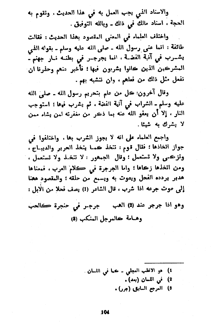 والإسند الَّذِي يَجِبُ الْعَمَلُ بِهِ فِي هَذَا الْحَدِيثِ وَتَقُومُ بِهِ الْحُجَّةُ إِسْنَادُ مَالِكٍ فِي ذَلِكَ وَبِاللَّهِ التَّوْفِيقُ وَاخْتَلَفَ الْعُلَمَاءُ فِي الْمَعْنَى الْمَقْصُودِ بِهَذَا الْحَدِيثِ فَقَالَتْ طَائِفَةٌ إِنَّمَا عُنِيَ رَسُولُ اللَّهِ صَلَّى اللَّهُ عَلَيْهِ وَسَلَّمَ بِقَوْلِهِ الَّذِي يَشْرَبُ فِي آنِيَةِ الْفِضَّةِ إِنَّمَا يُجَرْجِرُ فِي بَطْنِهِ نَارَ جَهَنَّمَ الْمُشْرِكِينَ الَّذِينَ كَانُوا يَشْرَبُونَ فِيهَا فَأَخْبَرَ عَنْهُمْ وَحَذَّرَنَا أَنْ نَفْعَلَ مِثْلَ ذَلِكَ مِنْ فِعْلِهِمْ وَأَنْ نَتَشَبَّهَ بِهِمْ وَقَالَ آخَرُونَ كُلُّ مَنْ عَلِمَ بِتَحْرِيمِ رَسُولِ اللَّهِ صَلَّى اللَّهُ عَلَيْهِ وَسَلَّمَ الشَّرَابَ فِي آنِيَةِ الْفِضَّةِ ثُمَّ يَشْرَبُ فِيهَا اسْتَوْجَبَ النَّارَ إِلَّا أَنْ يَعْفُوَ اللَّهُ عَنْهُ بِمَا ذَكَرَ مِنْ مغفرته لمن يشاء من لَا يُشْرِكُ بِهِ شَيْئًا وَأَجْمَعَ الْعُلَمَاءُ عَلَى أَنَّهُ لَا يَجُوزُ الشُّرْبُ بِهَا وَاخْتَلَفُوا فِي جَوَازِ اتِّخَاذِهَا فَقَالَ قَوْمٌ تُتَّخَذُ كَمَا يُتَّخَذُ الْحَرِيرُ وَالدِّيبَاجُ وَتُزَكَّى وَلَا تُسْتَعْمَلُ وَقَالَ الْجُمْهُورُ لَا تُتَّخَذُ وَلَا تُسْتَعْمَلُ وَمَنِ اتَّخَذَهَا زَكَّاهَا وَأَمَّا الْجَرْجَرَةُ فِي كَلَامِ الْعَرَبِ فَمَعْنَاهَا هَدِيرٌ يُرَدِّدُهُ الْفَحْلُ وَيُصَوِّتُ بِهِ وَيُسْمَعُ مِنْ حَلْقِهِ والمقصود ههنا إلى صوت جَرْعُهُ إِذَا شَرِبَ قَالَ الشَّاعِرُ يَصِفُ فَحْلًا مِنَ الْإِبِلِ ... وَهُوَ إِذَا جَرْجَرَ عِنْدَ الْهَبِّ ... جرجر في حنجرةكالحب ... ... وَهَامَةٍ كَالْمِرْجَلِ الْمُنْكَبِّ