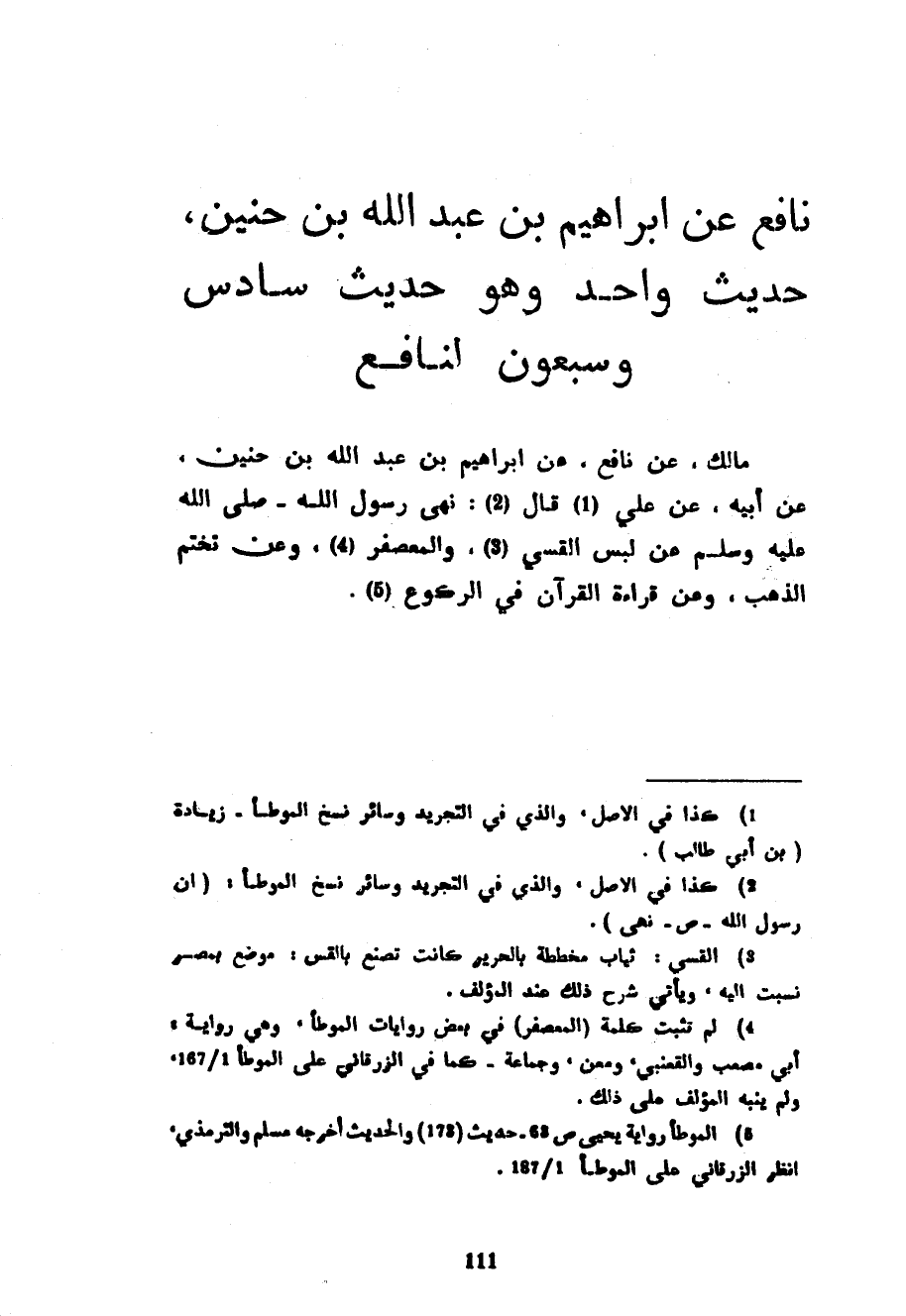 نَافِعٍ عَنْ إِبْرَاهِيمَ بْنِ عَبْدِ اللَّهِ بْنِ حُنَيْنٍ حَدِيثٌ وَاحِدٌ وَهُوَ حَدِيثٌ سَادِسٌ وَسَبْعُونَ لِنَافِعٍ مَالِكٌ عَنْ نَافِعٍ عَنْ إِبْرَاهِيمَ بْنِ عَبْدِ اللَّهِ بن حنين عَنْ أَبِيهِ عَنْ عَلِيٍّ قَالَ نَهَى رَسُولُ اللَّهِ صَلَّى اللَّهُ عَلَيْهِ وَسَلَّمَ عَنْ لُبْسِ الْقَسِّيِّ وَالْمُعَصْفَرِ وَعَنْ تَخَتُّمِ الذَّهَبِ وَعَنْ قِرَاءَةِ الْقُرْآنِ فِي الرُّكُوعِ