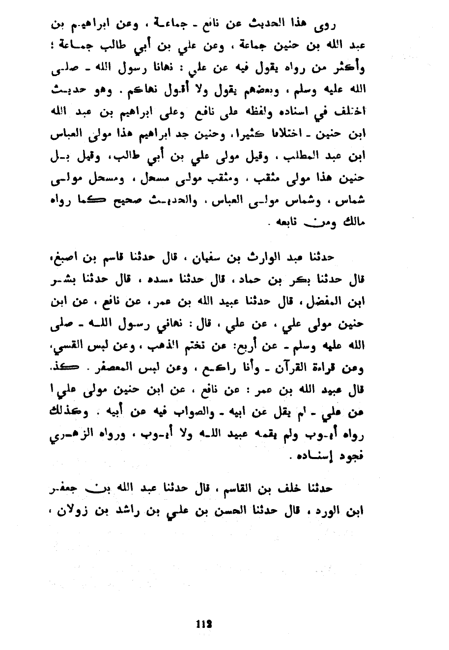 رَوَى هَذَا الْحَدِيثَ عَنْ نَافِعٍ جَمَاعَةٌ وَعَنْ إِبْرَاهِيمَ بْنِ عَبْدِ اللَّهِ بْنِ حُنَيْنٍ جَمَاعَةٌ وَعَنْ عَلِيِّ بْنِ أَبِي طَالِبٍ جَمَاعَةٌ وَأَكْثَرُ مَنْ رَوَاهُ يَقُولُ فِيهِ عَنْ عَلِيٍّ نَهَانَا رَسُولُ اللَّهِ صَلَّى اللَّهُ عَلَيْهِ وَسَلَّمَ وَبَعْضُهُمْ يَقُولُ وَلَا أَقُولُ نَهَاكُمْ وَهُوَ حَدِيثٌ اخْتُلِفَ فِي إِسْنَادِهِ وَلَفْظِهِ عَلَى نَافِعٍ وَعَلَى إِبْرَاهِيمَ بْنِ عَبْدِ اللَّهِ بْنِ حُنَيْنٍ اخْتِلَافًا كَثِيرًا وَحُنَيْنٌ جَدُّ إِبْرَاهِيمَ هَذَا مَوْلَى الْعَبَّاسِ بْنِ عَبْدِ الْمُطَّلِبِ وَقِيلَ مَوْلَى عَلِيِّ بْنِ أَبِي طَالِبٍ وَقِيلَ بَلْ حُنَيْنٌ هَذَا مَوْلَى مُثَقِّبٍ ومثقب مولى مسحل ومسحل مولى شماس شماس مَوْلَى الْعَبَّاسِ وَالْحَدِيثُ صَحِيحٌ كَمَا رَوَاهُ مَالِكٌ وَمَنْ تَابَعَهُ حَدَّثَنَا عَبْدُ الْوَارِثِ بْنُ سُفْيَانَ قَالَ حَدَّثَنَا قَاسِمُ بْنُ أَصْبَغَ قَالَ حَدَّثَنَا بَكْرُ بْنُ حماد قال حدثنا مسدد قل حَدَّثَنَا بِشْرُ بْنُ الْمُفَضَّلِ قَالَ حَدَّثَنَا عُبَيْدُ اللَّهِ بْنُ عُمَرَ عَنْ نافع عن ابن حُنَيْنٍ مَوْلَى عَلِيٍّ عَنْ عَلِيٍّ قَالَ نَهَانِي رَسُولُ اللَّهِ صَلَّى اللَّهُ عَلَيْهِ وَسَلَّمَ عن أَرْبَعٍ عَنْ تَخَتُّمِ الذَّهَبِ وَعَنْ لُبْسِ الْقَسِّيِّ وَعَنْ قِرَاءَةِ الْقُرْآنِ وَأَنَا رَاكِعٌ وَعَنْ لُبْسِ الْمُعَصْفَرِ كَذَا قَالَ عُبَيْدُ اللَّهِ بْنُ عُمَرَ عَنْ نَافِعٍ عَنِ ابْنِ حُنَيْنٍ مَوْلَى عَلِيٍّ عَنْ عَلِيٍّ لَمْ يَقُلْ عَنْ أَبِيهِ وَالصَّوَابُ فِيهِ عَنْ أَبِيهِ وَكَذَلِكَ رَوَاهُ أَيُّوبُ وَلَمْ يُقِمْهُ عُبَيْدُ اللَّهِ وَلَا أَيُّوبُ وَرَوَاهُ الزُّهْرِيُّ فَجَوَّدَ إِسْنَادَهُ حَدَّثَنَا خَلَفُ بْنُ الْقَاسِمِ قَالَ حَدَّثَنَا عَبْدُ اللَّهِ بْنُ جَعْفَرِ بْنِ الْوَرْدِ قَالَ حَدَّثَنَا الْحَسَنُ بْنُ عَلِيِّ بْنِ رَاشِدِ بن زولان