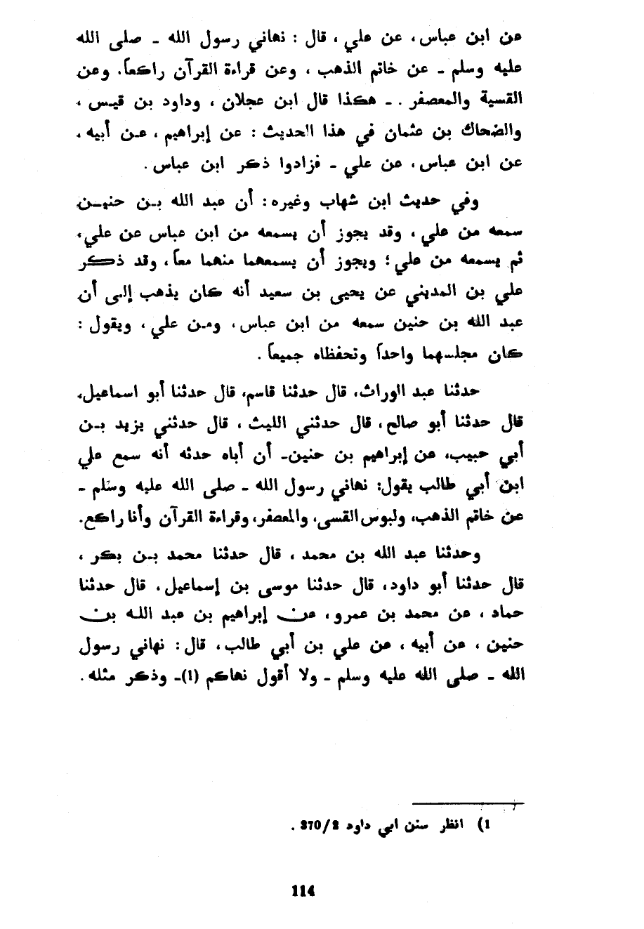 عَنِ ابْنِ عَبَّاسٍ عَنْ عَلِيٍّ قَالَ نَهَانِي رَسُولُ اللَّهِ صَلَّى اللَّهُ عَلَيْهِ وَسَلَّمَ عن خَاتَمِ الذَّهَبِ وَعَنْ قِرَاءَةِ الْقُرْآنِ رَاكِعًا وَعَنِ الْقَسِّيَّةِ وَالْمُعَصْفَرِ هَكَذَا قَالَ ابْنُ عَجْلَانَ وَدَاوُدُ بْنُ قَيْسٍ وَالضَّحَاكُ بْنُ عُثْمَانَ فِي هَذَا الْحَدِيثِ عَنْ إِبْرَاهِيمَ عَنْ أَبِيهِ عَنِ ابْنِ عَبَّاسٍ عَنْ عَلِيٍّ فَزَادُوا ذِكْرَ ابْنِ عَبَّاسٍ وَفِي حَدِيثِ ابْنِ شِهَابٍ وَغَيْرِهِ أَنَّ عَبْدَ اللَّهِ بْنَ حُنَيْنٍ سَمِعَهُ مِنْ عَلِيٍّ وَقَدْ يَجُوزُ أَنْ يَسْمَعَهُ مِنَ ابْنِ عَبَّاسٍ عَنْ عَلِيٍّ ثُمَّ يَسْمَعُهُ مِنْ عَلِيٍّ وَيَجُوزُ أَنْ يَسْمَعَهُمَا مِنْهُمَا مَعًا وَقَدْ ذَكَرَ عَلِيُّ بْنُ الْمَدِينِيِّ عَنْ يَحْيَى بْنِ سَعِيدٍ أَنَّهُ كَانَ يَذْهَبُ إِلَى أَنَّ عَبْدَ اللَّهِ بْنَ حُنَيْنٍ سَمِعَهُ مِنَ ابْنِ عَبَّاسٍ وَمِنْ عَلِيٍّ وَيَقُولُ كَانَ مَجْلِسُهُمَا وَاحِدًا وَتَحْفَظَاهُ جَمِيعًا حَدَّثَنَا عَبْدُ الْوَارِثِ قَالَ حَدَّثَنَا قَاسِمٌ قَالَ حَدَّثَنَا أَبُو إِسْمَاعِيلَ قَالَ حَدَّثَنَا أَبُو صَالِحٍ قَالَ حَدَّثَنِيَ اللَّيْثُ قَالَ حَدَّثَنِي يَزِيدُ بْنُ أَبِي حَبِيبٍ عَنْ إِبْرَاهِيمَ بْنِ حُنَيْنٍ أَنَّ أَبَاهُ حَدَّثَهُ أَنَّهُ سَمِعَ عَلِيَّ بْنَ أَبِي طَالِبٍ يَقُولُ نَهَانِي رَسُولُ اللَّهِ صَلَّى اللَّهُ عَلَيْهِ وَسَلَّمَ عَنْ خَاتَمِ الذَّهَبِ وَلَبُوسِ الْقَسِّيِّ وَالْمُعَصْفَرِ وَقِرَاءَةِ الْقُرْآنِ وَأَنَا رَاكِعٌ وَحَدَّثَنَا عَبْدُ اللَّهِ بْنُ مُحَمَّدٍ قَالَ حَدَّثَنَا مُحَمَّدُ بْنُ بَكْرٍ قَالَ حَدَّثَنَا أَبُو دَاوُدَ قَالَ حَدَّثَنَا مُوسَى بْنُ إِسْمَاعِيلَ قَالَ حَدَّثَنَا حَمَّادٌ عَنْ مُحَمَّدِ بْنِ عَمْرٍو عَنْ إِبْرَاهِيمَ بْنِ عَبْدِ اللَّهِ بْنِ حُنَيْنٍ عَنْ أَبِيهِ عَنْ عَلِيِّ بْنِ أَبِي طَالِبٍ قَالَ نَهَانِي رَسُولُ اللَّهِ صَلَّى اللَّهُ عَلَيْهِ وَسَلَّمَ وَلَا أَقُولُ نَهَاكُمْ وَذَكَرَ مِثْلَهُ