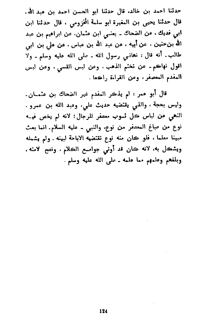 حَدَّثَنَا أَحْمَدُ بْنُ خَالِدٍ قَالَ حَدَّثَنَا أَبُو الْحَسَنِ أَحْمَدُ بْنُ عَبْدِ اللَّهِ قَالَ حَدَّثَنَا يَحْيَى بْنُ الْمُغِيرَةِ أَبُو سَلَمَةَ الْمَخْزُومِيُّ قَالَ حَدَّثَنَا ابْنُ أَبِي فُدَيْكٍ عَنِ الضَّحَّاكِ يَعْنِي ابْنَ عُثْمَانَ عَنْ إِبْرَاهِيمَ بْنِ عَبْدِ اللَّهِ بْنِ حُنَيْنٍ عَنْ أَبِيهِ عَنْ عَبْدِ اللَّهِ بْنِ عَبَّاسٍ عَنْ عَلِيِّ بْنِ أَبِي طَالِبٍ أَنَّهُ قَالَ نَهَانِي رَسُولُ اللَّهِ صَلَّى اللَّهُ عَلَيْهِ وَسَلَّمَ وَلَا أَقُولُ نَهَاكُمْ عَنْ تَخَتُّمِ الذَّهَبِ وَعَنْ لُبْسِ الْقَسِّيِّ وَعَنْ لُبْسِ الْمُفَدَّمِ الْمُعَصْفَرِ وَعَنِ الْقِرَاءَةِ رَاكِعًا قَالَ أَبُو عُمَرَ لَمْ يَذْكُرِ الْمُفَدَّمَ غَيْرُ الضَّحَّاكِ بْنِ عُثْمَانَ وَلَيْسَ بِحُجَّةٍ وَالَّذِي يَقْتَضِيهِ حَدِيثُ عَلِيٍّ وَعَبْدِ اللَّهِ بْنِ عَمْرٍو النَّهْيُ عَنْ لِبَاسِ كُلِّ ثَوْبٍ مُعَصْفَرٍ لِلرِّجَالِ لِأَنَّهُ لَمْ يُخَصَّ فِيهِ نَوْعٌ مِنْ صِبَاغِ الْمُعَصْفَرِ مِنْ نَوْعٍ وَالنَّبِيُّ عَلَيْهِ السَّلَامُ إِنَّمَا بُعِثَ مُبَيِّنًا مُعَلِّمًا فَلَوْ كَانَ مِنْهُ نَوْعٌ تَقْتَضِيهِ الْإِبَاحَةُ لَبَيَّنَهُ وَلَمْ يَشْمَلْهُ وَيُشْكِلْ بِهِ لِأَنَّهُ كَانَ قَدْ أُوتِيَ جَوَامِعَ الْكَلَامِ وَنَصَحَ لِأُمَّتِهِ وَبَلَّغَهُمْ وَعَلَّمَهُمْ مِمَّا عَلِمَهُ صَلَّى اللَّهُ عَلَيْهِ وَسَلَّمَ