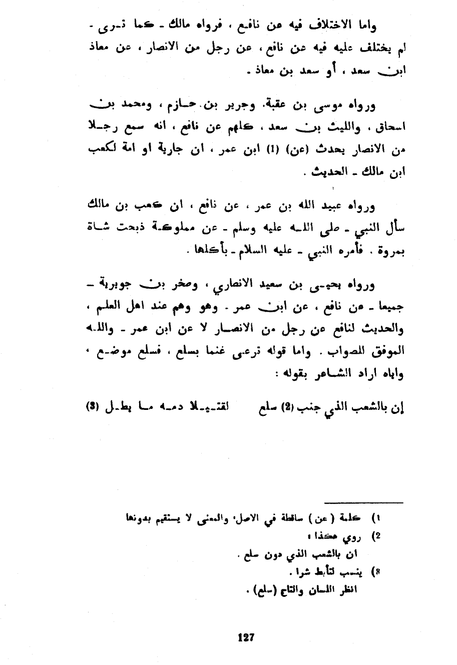 وَأَمَّا الِاخْتِلَافُ فِيهِ عَنْ نَافِعٍ فَرَوَاهُ مَالِكٌ كَمَا تَرَى لَمْ يُخْتَلَفْ عَلَيْهِ فِيهِ عَنْ نَافِعٍ عَنْ رَجُلٍ مِنَ الْأَنْصَارِ عَنْ مُعَاذِ بْنِ سَعْدٍ أَوْ سَعْدِ بْنِ مُعَاذٍ وَرَوَاهُ مُوسَى بْنُ عُقْبَةَ وَجَرِيرُ بْنُ حَازِمٍ وَمُحَمَّدُ بْنُ إِسْحَاقَ وَاللَّيْثُ بْنُ سَعْدٍ كُلُّهُمْ عَنْ أَنَّهُ سَمِعَ رَجُلًا مِنَ الْأَنْصَارِ يُحَدِّثُ (عَنِ) ابْنِ عُمَرَ أَنَّ جَارِيَةً أَوْ أَمَةً لِكَعْبِ بْنِ مَالِكٍ الْحَدِيثَ وَرَوَاهُ عُبَيْدُ اللَّهِ بْنُ عُمَرَ عَنْ نَافِعٍ أَنَّ كَعْبَ بْنَ مَالِكٍ سَأَلَ النَّبِيَّ صَلَّى اللَّهُ عَلَيْهِ وَسَلَّمَ عَنْ مملوكة ذبحت شاءة بِمَرْوَةٍ فَأَمَرَهُ النَّبِيُّ عَلَيْهِ السَّلَامُ بِأَكْلِهَا وَرَوَاهُ يَحْيَى بْنُ سَعِيدٍ الْأَنْصَارِيُّ وَصَخْرُ بْنُ جُوَيْرِيَّةَ جَمِيعًا عَنْ
