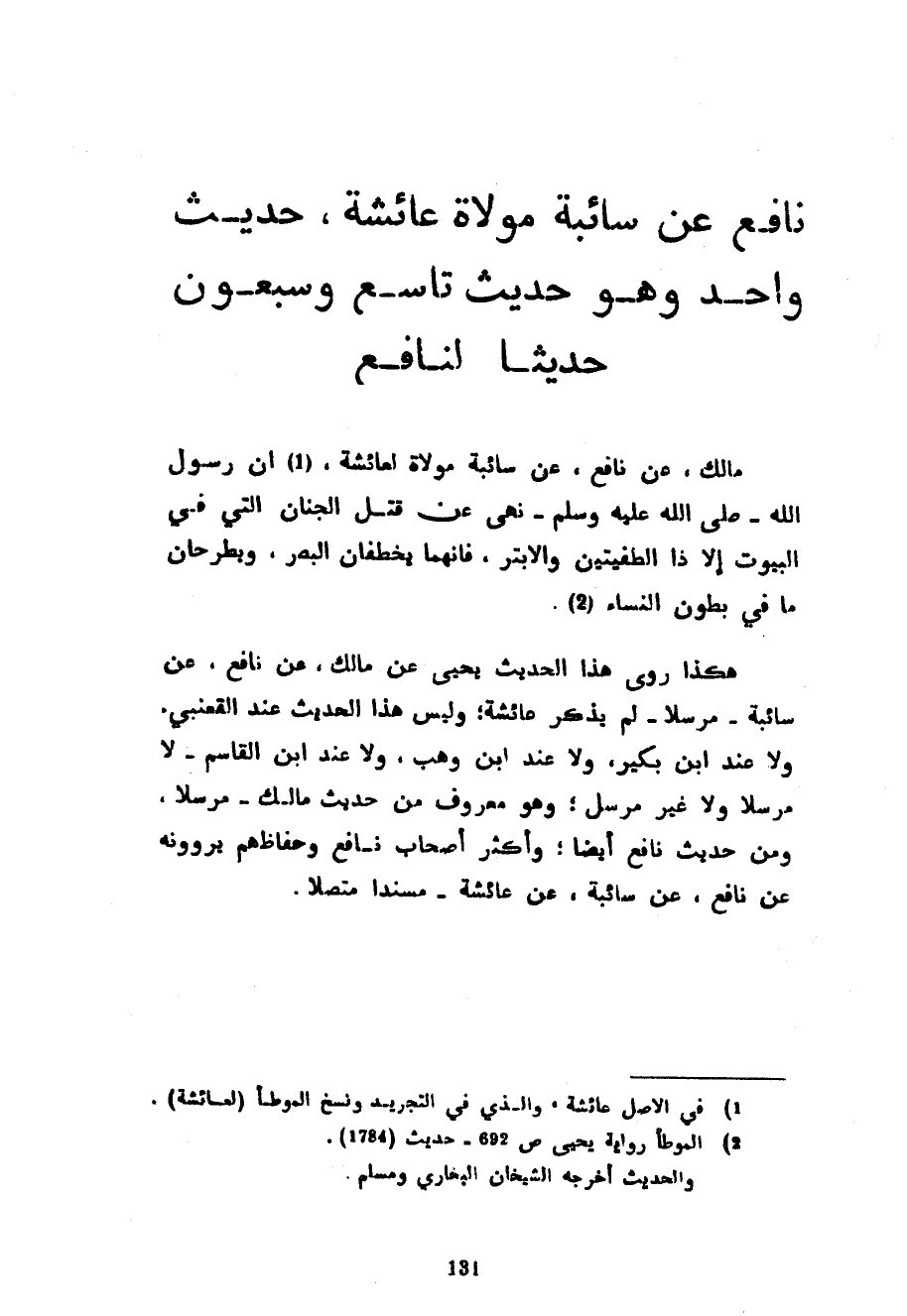 نَافِعٌ عَنْ سَائِبَةَ مَوْلَاةِ عَائِشَةَ حَدِيثٌ وَاحِدٌ وَهُوَ حَدِيثٌ تَاسِعٌ وَسَبْعُونَ حَدِيثًا لِنَافِعٍ مَالِكٌ عَنْ نَافِعٍ عَنْ سَائِبَةَ مَوْلَاةٍ لِعَائِشَةَ أَنَّ رَسُولَ اللَّهِ صَلَّى اللَّهُ عَلَيْهِ وَسَلَّمَ نَهَى عَنْ قَتْلِ الْجِنَّانِ الَّتِي فِي الْبُيُوتِ إِلَّا ذَا الطُّفْيَتَيْنِ وَالْأَبْتَرَ فَإِنَّهُمَا يَخْطِفَانِ الْبَصَرَ وَيَطْرَحَانِ مَا فِي بُطُونِ النِّسَاءِ هَكَذَا رَوَى هَذَا الْحَدِيثَ يَحْيَى عَنْ مَالِكٍ عَنْ نَافِعٍ عَنْ سَائِبَةَ مُرْسَلًا لَمْ يَذْكُرْ عَائِشَةَ وَلَيْسَ هَذَا الْحَدِيثُ عِنْدَ الْقَعْنَبِيِّ وَلَا عِنْدَ ابْنِ بُكَيْرٍ وَلَا عِنْدَ ابْنِ وَهْبٍ وَلَا عِنْدَ ابْنِ الْقَاسِمِ لَا مُرْسَلًا وَلَا غَيْرَ مُرْسَلٍ وَهُوَ مَعْرُوفٌ مِنْ حَدِيثِ مَالِكٍ مُرْسَلًا وَمِنْ حَدِيثِ نَافِعٍ أَيْضًا وَأَكْثَرُ أَصْحَابِ نَافِعٍ وَحُفَّاظُهُمْ يَرْوُونَهُ عَنْ نَافِعٍ عَنْ سَائِبَةَ عَنْ عَائِشَةَ مُسْنَدًا متصلا