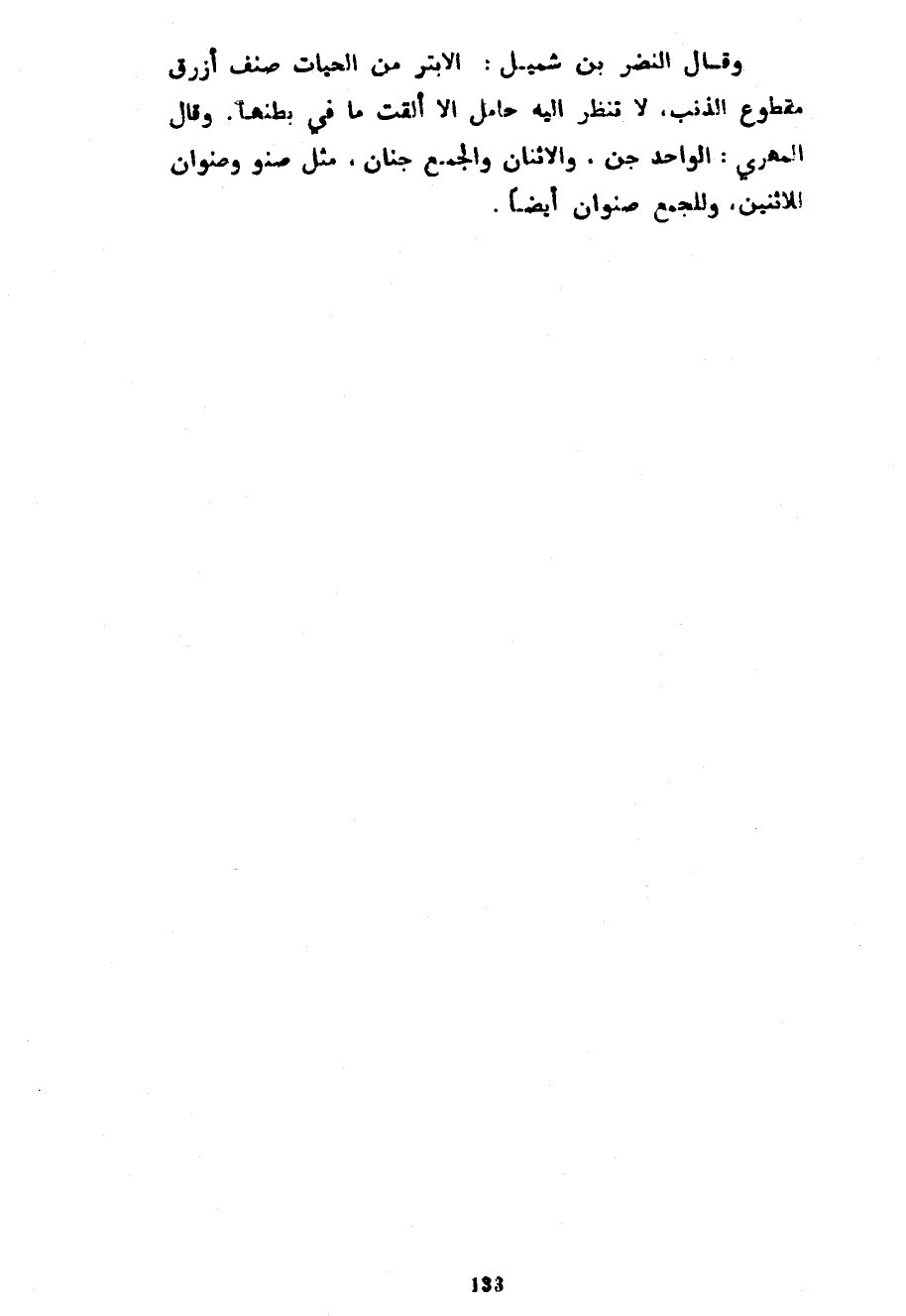 وَقَالَ النَّضْرُ بْنُ شُمَيْلٍ الْأَبْتَرُ مِنَ الْحَيَّاتِ صِنْفٌ أَزْرَقُ مَقْطُوعُ الذَّنَبِ لَا تَنْظُرُ إِلَيْهِ حَامِلٌ إِلَّا أَلْقَتْ مَا فِي بَطْنِهَا وَقَالَ الْمَهْرِيُّ الْوَاحِدُ جِنُّ وَالِاثْنَانِ وَالْجَمْعُ جِنَّانٌ مِثْلَ صنو وصنوان للاثنين وللجمع صنوان أيضا