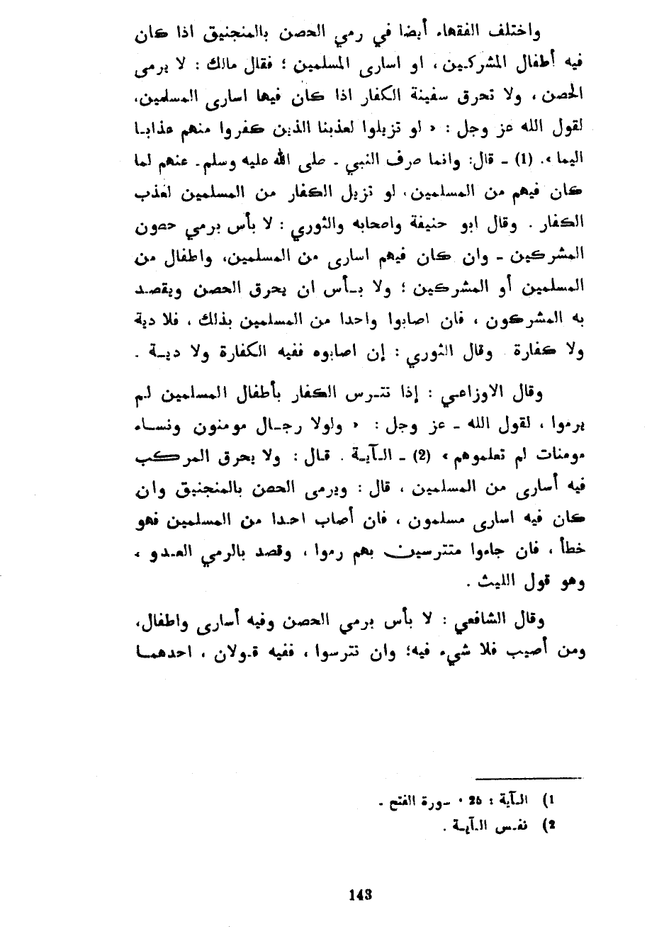 وَاخْتَلَفَ الْفُقَهَاءُ أَيْضًا فِي رَمْيِ الْحِصْنِ بِالْمَنْجَنِيقِ إِذَا كَانَ فِيهِ أَطْفَالُ الْمُشْرِكِينَ أَوْ أُسَارَى الْمُسْلِمِينَ فَقَالَ مَالِكٌ لَا يُرْمَى الْحِصْنُ وَلَا تُحْرَقُ سَفِينَةُ الْكُفَّارِ إِذَا كَانَ فِيهَا أُسَارَى الْمُسْلِمِينَ لِقَوْلِ اللَّهِ عَزَّ وَجَلَّ لَوْ تَزَيَّلُوا لَعَذَّبْنَا الَّذِينَ كَفَرُوا مِنْهُمْ عَذَابًا أَلِيمًا قَالَ وَإِنَّمَا صُرِفَ النَّبِيُّ صَلَّى اللَّهُ عَلَيْهِ وَسَلَّمَ عَنْهُمْ لِمَا كَانَ فِيهِمْ مِنَ الْمُسْلِمِينَ لَوْ تَزَيَّلَ الْكُفَّارُ مِنَ الْمُسْلِمِينَ لَعَذَّبَ الْكُفَّارَ وَقَالَ أَبُو حَنِيفَةَ وَأَصْحَابُهُ وَالثَّوْرِيُّ لَا بَأْسَ بِرَمْيِ حُصُونِ الْمُشْرِكِينَ وَإِنْ كَانَ فِيهِمْ أُسَارَى مِنَ الْمُسْلِمِينَ وَأَطْفَالٌ مِنَ الْمُسْلِمِينَ أَوِ الْمُشْرِكِينَ وَلَا بَأْسَ أَنْ يُحْرَقَ الْحِصْنُ وَيُقْصَدَ بِهِ الْمُشْرِكُونَ فَإِنْ أَصَابُوا وَاحِدًا مِنَ الْمُسْلِمِينَ بِذَلِكَ فَلَا دِيَةَ وَلَا كَفَّارَةَ وَقَالَ الثَّوْرِيُّ إِنْ أَصَابُوهُ فَفِيهِ الْكَفَّارَةُ وَلَا دِيَةَ وَقَالَ الْأَوْزَاعِيُّ إِذَا تَتَرَّسَ الْكُفَّارُ بِأَطْفَالِ الْمُسْلِمِينَ لَمْ يُرْمَوْا لِقَوْلِ اللَّهِ عَزَّ وَجَلَّ وَلَوْلَا رِجَالٌ مُؤْمِنُونَ وَنِسَاءٌ مُؤْمِنَاتٌ لَمْ تَعْلَمُوهُمْ الْآيَةَ قَالَ وَلَا يُحْرَقُ الْمَرْكَبُ فِيهِ أُسَارَى مِنَ الْمُسْلِمِينَ قَالَ وَيُرْمَى الْحِصْنُ بِالْمَنْجَنِيقِ وَإِنْ كَانَ فِيهِ أُسَارَى مُسْلِمُونَ فَإِنْ أَصَابَ وَاحِدًا مِنَ الْمُسْلِمِينَ فَهُوَ خَطَأٌ فَإِنْ جَاءُوا مُتَتَرِّسِينَ بِهِمْ رُمُوا وَقُصِدَ بِالرَّمْيِ الْعَدُوُّ وَهُوَ قَوْلُ اللَّيْثِ وَقَالَ الشَّافِعِيُّ لَا بَأْسَ بِرَمْيِ الْحِصْنِ وَفِيهِ أُسَارَى وَأَطْفَالٌ وَمَنْ أُصِيبَ فَلَا شَيْءَ فِيهِ وَإِنْ تَتَرَّسُوا فَفِيهِ قولان أحدهما
