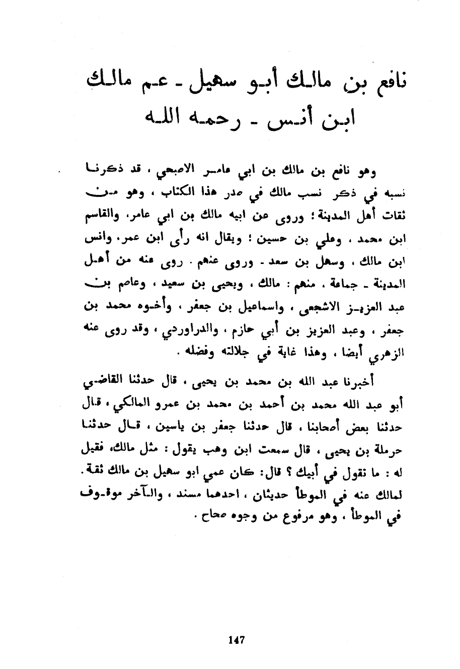 نَافِعُ بْنُ مَالِكٍ أَبُو سُهَيْلٍ عَمُّ مَالِكِ بْنِ أَنَسٍ رَحِمَهُ اللَّهُ وَهُوَ نَافِعُ بْنُ مَالِكِ بْنِ أَبِي عَامِرٍ الْأَصْبَحِيُّ قَدْ ذَكَرْنَا نَسَبَهُ فِي ذِكْرِ نَسَبِ مَالِكٍ فِي صَدْرِ هَذَا الْكِتَابِ وَهُوَ مِنْ ثِقَاتِ أَهْلِ الْمَدِينَةِ وَرَوَى عَنْ أَبِيهِ مَالِكِ بْنِ أَبِي عَامِرٍ وَالْقَاسِمِ بْنِ مُحَمَّدٍ وَعَلِيِّ بْنِ حُسَيْنٍ وَيُقَالُ إِنَّهُ رَأَى ابْنَ عُمَرَ وَأَنَسَ بْنَ مَالِكٍ وَسَهْلَ بْنَ سَعْدٍ وَرَوَى عَنْهُمْ رَوَى عَنْهُ مِنْ أَهْلِ الْمَدِينَةِ جَمَاعَةٌ مِنْهُمْ مَالِكٌ وَيَحْيَى بْنُ سَعِيدٍ وَعَاصِمُ بْنُ عَبْدِ الْعَزِيزِ الْأَشْجَعِيُّ وَإِسْمَاعِيلُ بْنُ جَعْفَرٍ وَأَخُوهُ مُحَمَّدُ بْنُ جَعْفَرٍ وَعَبْدُ الْعَزِيزِ بْنُ أَبِي حَازِمٍ وَالدَّرَاوَرْدِيُّ وَقَدْ رَوَى عَنْهُ الزُّهْرِيُّ أَيْضًا وَهَذَا غَايَةٌ فِي جَلَالَتِهِ وَفَضْلِهِ أَخْبَرَنَا عَبْدُ اللَّهِ بْنُ مُحَمَّدِ بْنِ يَحْيَى قَالَ حَدَّثَنَا الْقَاضِي أَبُو عَبْدِ اللَّهِ مُحَمَّدُ بْنُ أَحْمَدَ بْنِ مُحَمَّدِ بْنِ عَمْرٍو الْمَالِكِيُّ قَالَ حَدَّثَنَا بَعْضُ أَصْحَابِنَا قَالَ حَدَّثَنَا جَعْفَرُ بْنُ يَاسِينَ قَالَ حَدَّثَنَا حَرْمَلَةُ بْنُ يَحْيَى قَالَ سَمِعْتُ ابْنَ وَهْبٍ يَقُولُ مِثْلَ مَالِكٍ فَقِيلَ لَهُ مَا تَقُولُ فِي أَبِيكَ قَالَ كَانَ عَمِّي أَبُو سُهَيْلِ بْنُ مَالِكٍ ثِقَةً لِمَالِكٍ عَنْهُ فِي الْمُوَطَّأِ حَدِيثَانِ أَحَدُهُمَا مُسْنَدٌ وَالْآخَرُ مَوْقُوفٌ فِي الْمُوَطَّأِ وَهُوَ مرفوع من وجوه صحاح