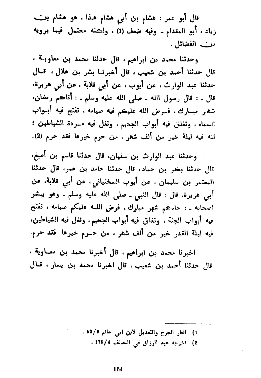 قَالَ أَبُو عُمَرَ هِشَامُ بْنُ أَبِي هِشَامٍ هَذَا هُوَ هِشَامُ بْنُ زِيَادٍ أَبُو الْمِقْدَامِ وَفِيهِ ضَعْفٌ وَلَكِنَّهُ مُحْتَمَلٌ فِيمَا يَرْوِيهِ مِنَ الْفَضَائِلِ وَحَدَّثَنَا مُحَمَّدُ بْنُ إِبْرَاهِيمَ قَالَ حَدَّثَنَا مُحَمَّدُ بْنُ مُعَاوِيَةَ قَالَ حَدَّثَنَا أَحْمَدُ بْنُ شُعَيْبٍ قَالَ أَخْبَرَنَا بِشْرُ بْنُ هِلَالٍ قَالَ حَدَّثَنَا عَبْدُ الْوَارِثِ عَنْ أَيُّوبَ عَنْ أَبِي قِلَابَةَ عَنْ أَبِي هُرَيْرَةَ قَالَ قَالَ رَسُولُ اللَّهِ صَلَّى اللَّهُ عَلَيْهِ وَسَلَّمَ أَتَاكُمْ رَمَضَانُ شَهْرٌ مُبَارَكٌ فَرَضَ اللَّهُ عَلَيْكُمْ فِيهِ صِيَامَهُ تُفَتَّحُ فِيهِ أَبْوَابُ السَّمَاءِ وَتُغَلَّقُ فِيهِ أَبْوَابُ الْجَحِيمِ وَتُغَلُّ فِيهِ مَرَدَةُ الشَّيَاطِينِ لِلَّهِ فِيهِ لَيْلَةٌ خَيْرٌ مِنْ أَلْفِ شَهْرٍ مَنْ حُرِمَ خَيْرَهَا فَقَدْ حُرِمَ وَحَدَّثَنَا عَبْدُ الْوَارِثِ بْنُ سُفْيَانَ قَالَ حَدَّثَنَا قَاسِمُ بْنُ أَصْبَغَ قَالَ حَدَّثَنَا بَكْرُ بْنُ حَمَّادٍ قَالَ حَدَّثَنَا حَامِدُ بْنُ عُمَرَ قَالَ حَدَّثَنَا الْمُعْتَمِرُ بْنُ سُلَيْمَانَ عَنْ أَيُّوبَ السَّخْتِيَانِيِّ عَنْ أَبِي قِلَابَةَ عَنِ أَبِي هُرَيْرَةَ قَالَ قَالَ النَّبِيُّ صَلَّى اللَّهُ عَلَيْهِ وَسَلَّمَ وَهُوَ يُبَشِّرُ أَصْحَابَهُ جَاءَكُمْ شَهْرٌ مُبَارَكٌ فَرَضَ اللَّهُ عَلَيْكُمْ صِيَامَهُ تُفَتَّحُ فِيهِ أَبْوَابُ الْجَنَّةِ وَتُغَلَّقُ فِيهِ أَبْوَابُ الْجَحِيمِ وَتُغَلُّ فِيهِ الشَّيَاطِينُ فِيهِ لَيْلَةُ الْقَدْرِ خَيْرٌ مِنْ أَلْفِ شَهْرٍ مَنْ حُرِمَ خَيْرَهَا فَقَدْ حُرِمَ أَخْبَرَنَا مُحَمَّدُ بْنُ إِبْرَاهِيمَ قَالَ أَخْبَرَنَا مُحَمَّدُ بْنُ مُعَاوِيَةَ قَالَ حَدَّثَنَا أَحْمَدُ بْنُ شُعَيْبٍ قَالَ أَخْبَرَنَا مُحَمَّدُ بْنُ يَسَارٍ قَالَ
