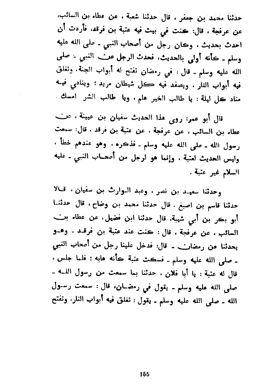 حَدَّثَنَا مُحَمَّدُ بْنُ جَعْفَرٍ قَالَ حَدَّثَنَا شُعْبَةُ عَنْ عَطَاءِ بْنِ السَّائِبِ عَنْ عَرْفَجَةَ قَالَ كُنْتُ فِي بَيْتٍ فِيهِ عُتْبَةُ بْنُ فَرْقَدٍ فَأَرَدْتُ أَنْ أُحَدِّثَ بِحَدِيثٍ وَكَانَ رَجُلٌ مِنْ أَصْحَابِ النَّبِيِّ صَلَّى اللَّهُ عَلَيْهِ وَسَلَّمَ كَأَنَّهُ أَوْلَى بِالْحَدِيثِ فَحَدَّثَ الرَّجُلُ عَنِ النَّبِيِّ صَلَّى اللَّهُ عَلَيْهِ وَسَلَّمَ قَالَ فِي رَمَضَانَ تُفَتَّحُ لَهُ أَبْوَابُ الْجَنَّةِ وَتُغَلَّقُ فِيهِ أَبْوَابُ النَّارِ وَيُصَفَّدُ فِيهِ كُلُّ شَيْطَانٍ مَرِيدٍ وَيُنَادِي فِيهِ مُنَادٍ كُلَّ لَيْلَةٍ يَا طَالِبَ الْخَيْرِ هَلُمَّ وَيَا طَالِبَ الشَّرِّ أَمْسِكْ قَالَ أَبُو عُمَرَ رَوَى هَذَا الْحَدِيثَ سُفْيَانُ بْنُ عُيَيْنَةَ عَنْ عَطَاءِ بْنِ السَّائِبِ عَنْ عَرْفَجَةَ عَنْ عُتْبَةَ بْنِ فَرْقَدٍ قَالَ سَمِعْتُ رَسُولَ اللَّهِ صَلَّى اللَّهُ عَلَيْهِ وَسَلَّمَ فَذَكَرَهُ وَهُوَ عِنْدَهُمْ خَطَأٌ وَلَيْسَ الْحَدِيثُ لِعُتْبَةَ وَإِنَّمَا هُوَ لِرَجُلٍ مِنْ أَصْحَابِ النَّبِيِّ عَلَيْهِ السَّلَامُ غَيْرِ عُتْبَةَ وَحَدَّثَنَا سَعِيدُ بْنُ نَصْرٍ وَعَبْدُ الْوَارِثِ بْنُ سُفْيَانَ قَالَا حَدَّثَنَا قَاسِمُ بْنُ أَصْبَغَ قَالَ حَدَّثَنَا مُحَمَّدُ بْنُ وَضَّاحٍ قَالَ حَدَّثَنَا أَبُو بَكْرِ بْنُ أَبِي شَيْبَةَ قَالَ حَدَّثَنَا ابْنُ فُضَيْلٍ عَنْ عَطَاءِ بْنِ السَّائِبِ عَنْ عَرْفَجَةَ قَالَ كُنْتُ عِنْدَ عُتْبَةَ بْنِ فَرْقَدٍ وَهُوَ يُحَدِّثُنَا عَنْ رَمَضَانَ قَالَ فَدَخَلَ عَلَيْنَا رَجُلٌ مِنْ أَصْحَابِ النَّبِيِّ صَلَّى اللَّهُ عَلَيْهِ وَسَلَّمَ فَسَكَتَ عُتْبَةُ كَأَنَّهُ هَابَهُ فَلَمَّا جَلَسَ قَالَ لَهُ عُتْبَةُ يَا أَبَا فُلَانٍ حَدِّثْنَا بِمَا سَمِعْتُ مِنْ رَسُولِ اللَّهِ صَلَّى اللَّهُ عَلَيْهِ وَسَلَّمَ يَقُولُ فِي رَمَضَانَ قَالَ سَمِعْتُ رَسُولَ اللَّهِ صَلَّى اللَّهُ عَلَيْهِ وَسَلَّمَ يَقُولُ تُغَلَّقُ فِيهِ أَبْوَابُ النَّارِ وَتُفَتَّحُ