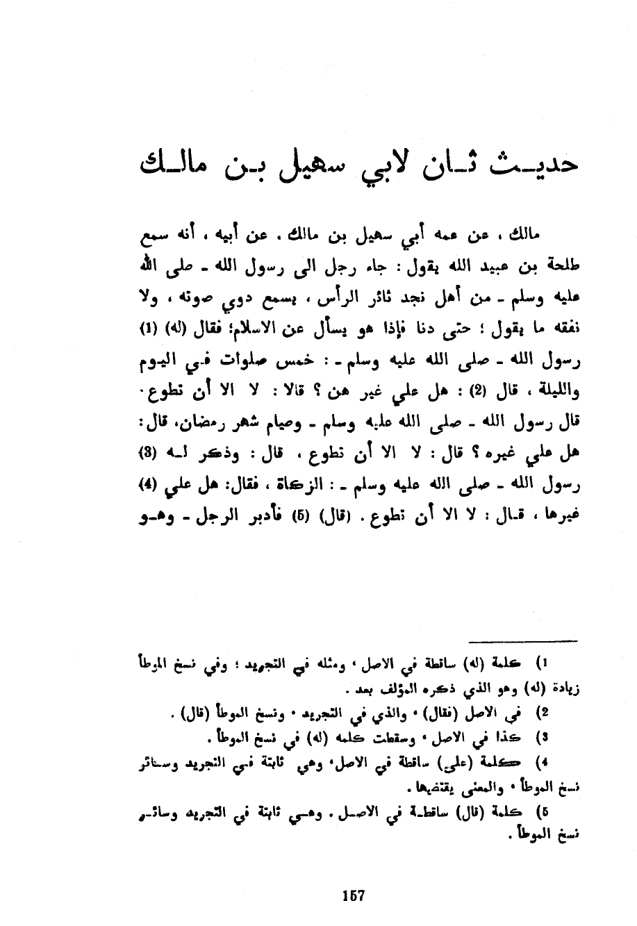 حَدِيثٌ ثَانٍ لِأَبِي سُهَيْلِ بْنِ مَالِكٍ مَالِكٌ عَنْ عَمِّهِ أَبِي سُهَيْلِ بْنِ مَالِكٍ عَنْ أَبِيهِ أَنَّهُ سَمِعَ طَلْحَةَ بْنَ عُبَيْدِ اللَّهِ يَقُولُ جَاءَ رَجُلٌ إِلَى رَسُولِ اللَّهِ صَلَّى اللَّهُ عَلَيْهِ وَسَلَّمَ مِنْ أَهْلِ نَجْدٍ ثَائِرَ الرَّأْسِ يُسْمَعُ دَوِيُّ صَوْتِهِ وَلَا نَفْقَهُ مَا يَقُولُ حَتَّى دَنَا فَإِذَا هُوَ يَسْأَلُ عَنِ الْإِسْلَامِ فَقَالَ (لَهُ) رَسُولُ اللَّهِ صَلَّى اللَّهُ عَلَيْهِ وَسَلَّمَ خَمْسُ صَلَوَاتٍ فِي الْيَوْمِ وَاللَّيْلَةِ قَالَ هَلْ عَلَيَّ غَيْرُهُنَّ قَالَا لَا إِلَّا أَنْ تَطَّوَّعَ قَالَ رَسُولُ اللَّهِ صَلَّى اللَّهُ عَلَيْهِ وَسَلَّمَ وَصِيَامُ شَهْرِ رَمَضَانَ قَالَ هَلْ عَلَيَّ غَيْرُهُ قَالَ لَا إِلَّا أَنْ تَطَّوَّعَ قَالَ وَذَكَرَ لَهُ رَسُولُ اللَّهِ صَلَّى اللَّهُ عَلَيْهِ وَسَلَّمَ الزَّكَاةَ فَقَالَ هَلْ عَلَيَّ غَيْرُهَا قَالَ لَا إِلَّا أَنْ تَطَّوَّعَ (قَالَ) فَأَدْبَرَ الرجل وهو
