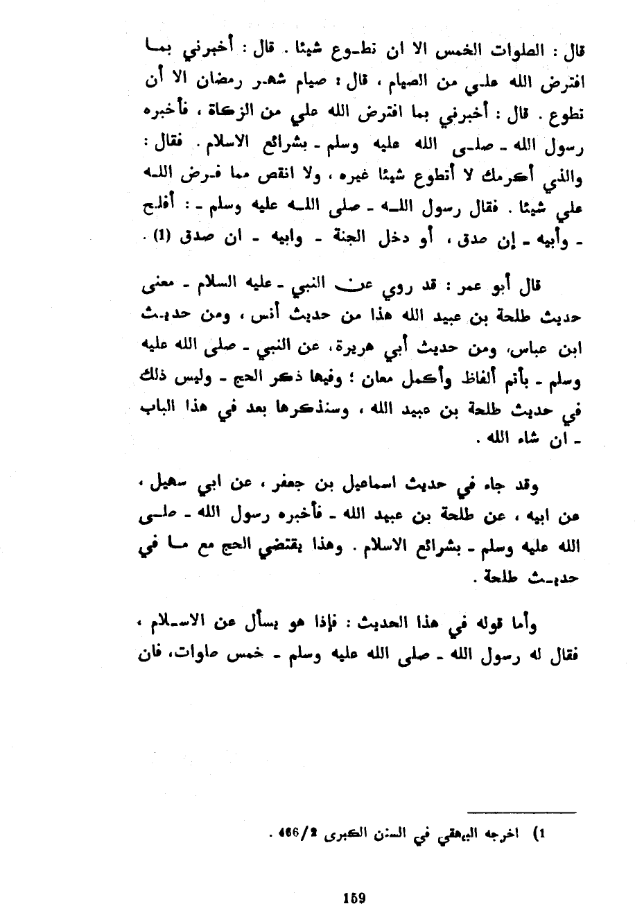 قَالَ الصَّلَوَاتُ الْخَمْسُ إِلَّا أَنْ تَطَّوَّعَ شَيْئًا قَالَ أَخْبِرْنِي بِمَا افْتَرَضَ اللَّهُ عَلَيَّ مِنَ الصِّيَامِ قَالَ صِيَامُ شَهْرِ رَمَضَانَ إِلَّا أَنْ تَطَّوَّعَ قَالَ أَخْبِرْنِي بِمَا افْتَرَضَ اللَّهُ عَلَيَّ مِنَ الزَّكَاةِ فَأَخْبَرَهُ رَسُولُ اللَّهِ صَلَّى اللَّهُ عَلَيْهِ وَسَلَّمَ بِشَرَائِعِ الْإِسْلَامِ فَقَالَ وَالَّذِي أَكْرَمَكَ لَا أَتَطَوَّعُ شَيْئًا غَيْرَهُ وَلَا أَنْقُصُ مِمَّا فَرَضَ اللَّهُ عَلَيَّ شَيْئًا فَقَالَ رَسُولُ اللَّهِ صَلَّى اللَّهُ عَلَيْهِ وَسَلَّمَ أَفْلَحَ وَأَبِيهِ إِنْ صَدَقَ أَوْ دَخَلَ الْجَنَّةَ وَأَبِيهِ إِنْ صَدَقَ قَالَ أَبُو عُمَرَ قَدْ رُوِيَ عَنِ النَّبِيِّ عَلَيْهِ السَّلَامُ مَعْنَى حَدِيثِ طَلْحَةَ بْنِ عُبَيْدِ اللَّهِ هَذَا مِنْ حَدِيثِ أَنَسٍ وَمِنْ حَدِيثِ ابْنِ عَبَّاسٍ وَمِنْ حَدِيثِ أَبِي هُرَيْرَةَ عَنِ النَّبِيِّ صَلَّى اللَّهُ عَلَيْهِ وَسَلَّمَ بِأَتَمِّ أَلْفَاظٍ وَأَكْمَلِ مَعَانٍ وَفِيهَا ذِكْرُ الْحَجِّ وَلَيْسَ ذَلِكَ فِي حَدِيثِ طَلْحَةَ بْنِ عُبَيْدِ اللَّهِ وَسَنَذْكُرُهَا بَعْدُ فِي هَذَا الْبَابِ إِنْ شَاءَ اللَّهُ وَقَدْ جَاءَ فِي حَدِيثِ إِسْمَاعِيلَ بْنِ جَعْفَرٍ عَنْ أَبِي سُهَيْلٍ عَنْ أَبِيهِ عَنْ طَلْحَةَ بْنِ عُبَيْدِ اللَّهِ فَأَخْبَرَهُ رَسُولُ اللَّهِ صَلَّى اللَّهُ عَلَيْهِ وَسَلَّمَ بِشَرَائِعِ الْإِسْلَامِ وَهَذَا يَقْتَضِي الْحَجَّ مَعَ مَا فِي حَدِيثِ طَلْحَةَ وَأَمَّا قَوْلُهُ فِي هَذَا الْحَدِيثِ فَإِذَا هُوَ يَسْأَلُ عَنِ الْإِسْلَامِ فَقَالَ لَهُ رَسُولُ اللَّهِ صَلَّى اللَّهُ عَلَيْهِ وَسَلَّمَ خَمْسُ صَلَوَاتٍ فَإِنَّ