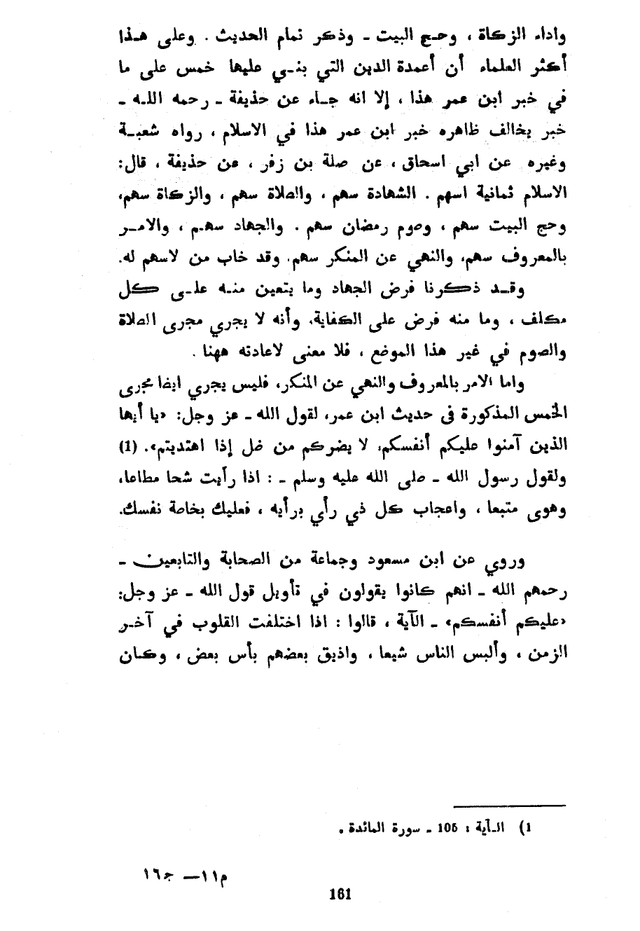 وَأَدَاءُ الزَّكَاةِ وَحَجُّ الْبَيْتِ وَذَكَرَ تَمَامَ الْحَدِيثِ وَعَلَى هَذَا أَكْثَرُ الْعُلَمَاءِ أَنَّ أَعْمُدَ الدِّينِ الَّتِي بُنِيَ عَلَيْهَا خَمْسٌ عَلَى مَا فِي خَبَرِ ابْنِ عُمَرَ هَذَا إِلَّا أَنَّهُ جَاءَ عَنْ حُذَيْفَةَ رَحِمَهُ اللَّهُ خَبَرٌ يُخَالِفُ ظَاهِرُهُ خَبَرَ ابْنِ عُمَرَ هَذَا فِي الْإِسْلَامِ رَوَاهُ شُعْبَةُ وَغَيْرُهُ عَنْ أَبِي إِسْحَاقَ عَنْ صِلَةَ بْنِ زُفَرَ عَنْ حُذَيْفَةَ قَالَ الْإِسْلَامُ ثَمَانِيَةُ أَسْهُمٍ الشَّهَادَةُ سَهْمٌ وَالصَّلَاةُ سَهْمٌ وَالزَّكَاةُ سَهْمٌ وَحَجُّ الْبَيْتِ سَهْمٌ وَصَوْمُ رَمَضَانَ سَهْمٌ وَالْجِهَادُ سَهْمٌ وَالْأَمْرُ بِالْمَعْرُوفِ سَهْمٌ وَالنَّهْيُ عَنِ الْمُنْكَرِ سَهْمٌ وَقَدْ خَابَ مَنْ لَا سَهْمَ لَهُ وَقَدْ ذَكَرْنَا فَرْضَ الْجِهَادِ وَمَا يَتَعَيَّنُ مِنْهُ عَلَى كُلِّ مُكَلَّفٍ وَمَا مِنْهُ فَرْضٌ عَلَى الْكِفَايَةِ وَأَنَّهُ لَا يَجْرِي مَجْرَى الصَّلَاةِ وَالصَّوْمِ فِي غَيْرِ هَذَا الْمَوْضِعِ فَلَا مَعْنَى لِإِعَادَتِهِ ههنا وَأَمَّا الْأَمْرُ بِالْمَعْرُوفِ وَالنَّهْيُ عَنِ الْمُنْكَرِ فَلَيْسَ يَجْرِي أَيْضًا مَجْرَى الْخَمْسِ الْمَذْكُورَةِ فِي حَدِيثِ ابن عمر لقول الله عز وجل يا أيها الَّذِينَ آمَنُوا عَلَيْكُمْ أَنْفُسَكُمْ لَا يَضُرُّكُمْ مَنْ ضَلَّ إِذَا اهْتَدَيْتُمْ وَلِقَوْلِ رَسُولِ اللَّهِ صَلَّى اللَّهُ عَلَيْهِ وَسَلَّمَ إِذَا رَأَيْتَ شُحًّا مُطَاعًا وَهَوًى مُتَّبَعًا وَإِعْجَابَ كُلِّ ذِي رَأْيٍ بِرَأْيهِ فَعَلَيْكَ بِخَاصَّةِ نَفْسِكَ وَرُوِيَ عَنِ ابْنِ مَسْعُودٍ وَجَمَاعَةٍ مِنَ الصَّحَابَةِ وَالتَّابِعِينَ رَحِمَهُمُ اللَّهُ أَنَّهُمْ كَانُوا يَقُولُونَ فِي تَأْوِيلِ قَوْلِ اللَّهِ عَزَّ وَجَلَّ عَلَيْكُمْ أَنْفُسَكُمْ الْآيَةَ قَالُوا إِذَا اخْتَلَفَتِ الْقُلُوبُ فِي آخِرِ الزَّمَنِ وَأُلْبِسَ النَّاسُ شِيَعًا وَأُذِيقَ بَعْضُهُمْ بَأْسَ بَعْضٍ وَكَانَ
