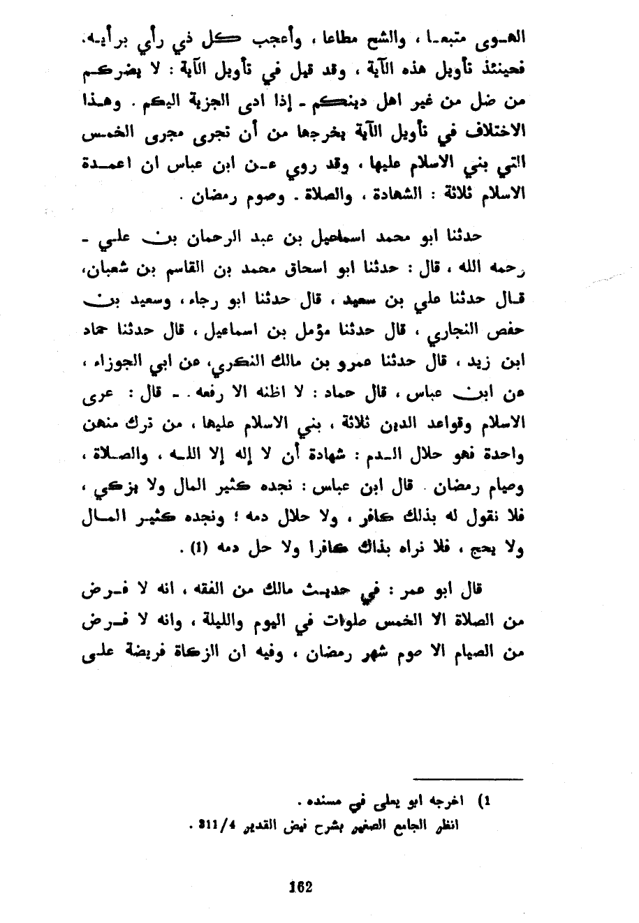 الْهَوَى مُتَّبَعًا وَالشُّحُّ مُطَاعًا وَأُعْجِبَ كُلُّ ذِي رَأْيٍ بِرَأْيِهِ فَحِينَئِذٍ تَأْوِيلُ هَذِهِ الْآيَةِ وَقَدْ قِيلَ فِي تَأْوِيلِ الْآيَةِ لَا يَضُرُّكُمْ مَنْ ضَلَّ مِنْ غَيْرِ أَهْلِ دِينِكُمْ إِذَا أَدَّى الْجِزْيَةَ إِلَيْكُمْ وَهَذَا الِاخْتِلَافُ فِي تَأْوِيلِ الْآيَةِ يُخْرِجُهَا مِنْ أَنْ تُجْرَى مَجْرَى الْخَمْسِ الَّتِي بُنِيَ الْإِسْلَامُ عَلَيْهَا وَقَدْ رُوِيَ عَنِ ابْنِ عَبَّاسٍ أَنَّ أَعْمِدَةَ الْإِسْلَامِ ثَلَاثَةٌ الشَّهَادَةُ وَالصَّلَاةُ وَصَوْمُ رَمَضَانَ حَدَّثَنَا أَبُو مُحَمَّدٍ إِسْمَاعِيلُ بْنُ عبد الرحمان بْنِ عَلِيٍّ رَحِمَهُ اللَّهُ قَالَ حَدَّثَنَا أَبُو إِسْحَاقَ مُحَمَّدُ بْنُ الْقَاسِمِ بْنِ شَعْبَانَ قَالَ حَدَّثَنَا عَلِيُّ بْنُ سَعِيدٍ قَالَ حَدَّثَنَا أَبُو رَجَاءٍ وَسَعِيدُ بْنُ حَفْصٍ النَّجَّارِيُّ قَالَ حَدَّثَنَا مُؤَمَّلُ بْنُ إِسْمَاعِيلَ قَالَ حَدَّثَنَا حَمَّادُ بْنُ زَيْدٍ قَالَ حَدَّثَنَا عَمْرِو بْنِ مَالِكٍ النُّكْرِيِّ عَنْ أَبِي الْجَوْزَاءِ عَنِ ابْنِ عَبَّاسٍ قَالَ حَمَّادٌ لَا أَظُنُّهُ إِلَّا رَفَعَهُ قَالَ عُرَى الْإِسْلَامِ وَقَوَاعِدُ الدِّينِ ثَلَاثَةٌ بُنِيَ الْإِسْلَامُ عَلَيْهَا مَنْ تَرَكَ مِنْهُنَّ وَاحِدَةً فَهُوَ حَلَالُ الدَّمِ شهادة أأن لَا إِلَهَ إِلَّا اللَّهُ وَالصَّلَاةُ وَصِيَامُ رَمَضَانَ قال ابن عباس نجده كثير المال لا يُزَكِّي فَلَا نَقُولُ لَهُ بِذَلِكَ كَافِرٌ وَلَا حَلَالٌ دَمُهُ وَنَجِدُهُ كَثِيرَ الْمَالِ وَلَا يَحُجُّ فلا نراه بذاك كافرا ولا حل دَمُهُ قَالَ أَبُو عُمَرَ فِي حَدِيثِ مَالِكٍ مِنَ الْفِقْهِ أَنَّهُ لَا فَرْضَ مِنَ الصَّلَاةِ إلا الخمس صلوات فِي الْيَوْمِ وَاللَّيْلَةِ وَأَنَّهُ لَا فَرْضَ مِنَ الصِّيَامِ إِلَّا صَوْمُ شَهْرِ رَمَضَانَ وَفِيهِ أَنَّ الزَّكَاةَ فَرِيضَةٌ عَلَى