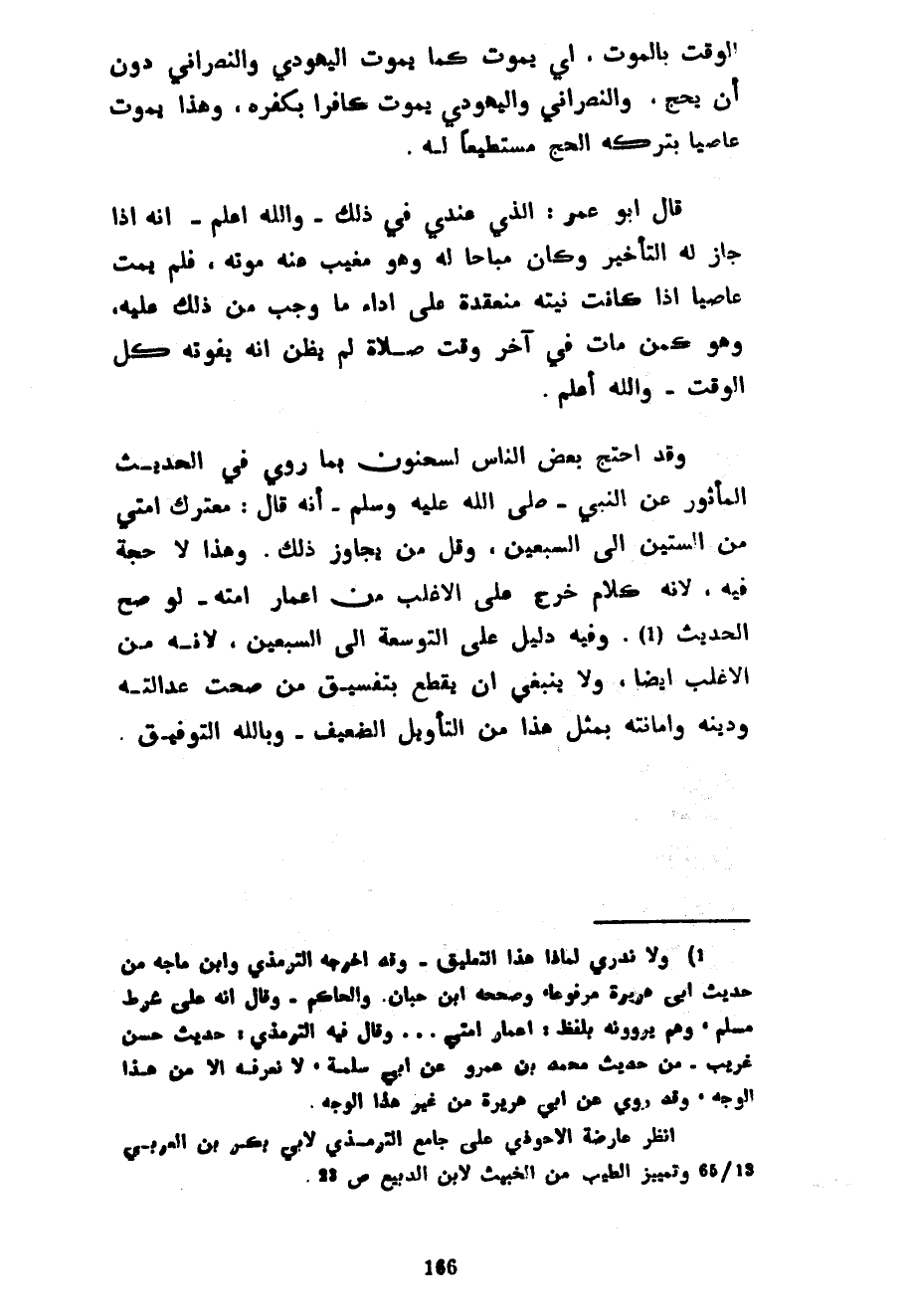 الْوَقْتَ بِالْمَوْتِ أَيْ يَمُوتُ كَمَا يَمُوتُ الْيَهُودِيُّ وَالنَّصْرَانِيُّ دُونَ أَنْ يَحُجَّ وَالنَّصْرَانِيُّ وَالْيَهُودِيُّ يَمُوتُ كَافِرًا بِكُفْرِهِ وَهَذَا يَمُوتُ عَاصِيًا بِتَرْكِهِ الْحَجَّ مُسْتَطِيعًا لَهُ قَالَ أَبُو عُمَرَ الَّذِي عِنْدِي فِي ذَلِكَ وَاللَّهُ أَعْلَمُ أَنَّهُ إِذَا جَازَ لَهُ التَّأْخِيرُ وَكَانَ مُبَاحًا لَهُ وَهُوَ مَغِيبٌ عَنْهُ مَوْتُهُ فَلَمْ يَمُتْ عَاصِيًا إِذَا كَانَتْ نِيَّتُهُ مُنْعَقِدَةً عَلَى أَدَاءِ مَا وَجَبَ مِنْ ذَلِكَ عَلَيْهِ وَهُوَ كَمَنْ مَاتَ فِي آخِرِ وَقْتِ صَلَاةٍ لَمْ يَظُنَّ أَنَّهُ يَفُوتُهُ كُلُّ الْوَقْتِ وَاللَّهُ أَعْلَمُ وَقَدِ احْتَجَّ بَعْضُ النَّاسِ لِسَحْنُونٍ بِمَا رَوَى فِي الْحَدِيثِ الْمَأْثُورِ عَنِ النَّبِيِّ صَلَّى اللَّهُ عَلَيْهِ وَسَلَّمَ أَنَّهُ قَالَ مُعْتَرَكُ أُمَّتِي مِنَ السِّتِّينَ إِلَى السَّبْعِينَ وَقَلَّ مَنْ يُجَاوِزُ ذَلِكَ وَهَذَا لَا حُجَّةَ فِيهِ لِأَنَّهُ كَلَامٌ خَرَجَ عَلَى الْأَغْلَبِ مِنْ أَعْمَارِ أُمَّتِهِ لَوْ صَحَّ الْحَدِيثُ وَفِيهِ دَلِيلٌ عَلَى التَّوْسِعَةِ إِلَى السَّبْعِينَ لِأَنَّهُ مِنَ الْأَغْلَبِ أَيْضًا وَلَا يَنْبَغِي أَنْ يُقْطَعَ بِتَفْسِيقِ مَنْ صَحَّتْ عَدَالَتُهُ وَدِينُهُ وَأَمَانَتُهُ بِمِثْلِ هَذَا مِنَ التَّأْوِيلِ الضَّعِيفِ وَبِاللَّهِ التَّوْفِيقُ