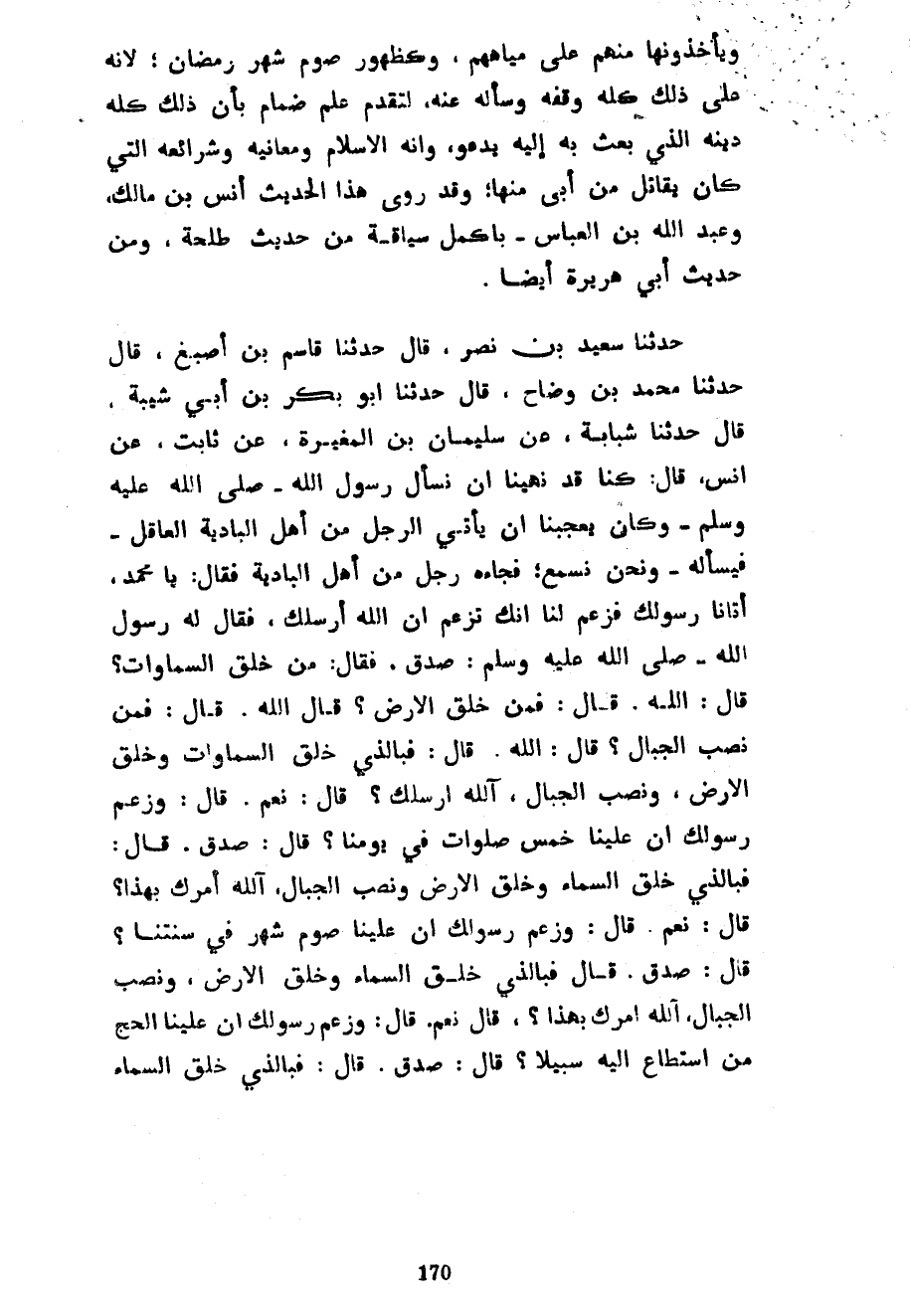 وَيَأْخُذُونَهَا مِنْهُمْ عَلَى مِيَاهِهِمْ وَكَظُهُورِ صَوْمِ شَهْرِ رَمَضَانَ لِأَنَّهُ عَلَى ذَلِكَ كُلِّهِ وَقَفَهُ وَسَأَلَهُ عَنْهُ لِتَقَدُّمِ عِلْمِ ضِمَامٍ بِأَنَّ ذَلِكَ كُلَّهُ دِينُهُ الَّذِي بُعِثَ بِهِ إِلَيْهِ يَدْعُو وَأَنَّهُ الْإِسْلَامُ وَمَعَانِيهِ وَشَرَائِعُهُ الَّتِي كَانَ يُقَاتِلُ مَنْ أَبَى مِنْهَا وَقَدْ رَوَى هَذَا الْحَدِيثَ أَنَسُ بن مالك وعبد الله بن العباس بِأَكْمَلِ سِيَاقِهِ مِنْ حَدِيثِ طَلْحَةَ وَمِنْ حَدِيثِ أَبِي هُرَيْرَةَ أَيْضًا حَدَّثَنَا سَعِيدُ بْنُ نَصْرٍ قَالَ حَدَّثَنَا قَاسِمُ بْنُ أَصْبَغَ قَالَ حَدَّثَنَا مُحَمَّدُ بْنُ وَضَّاحٍ قَالَ حَدَّثَنَا أَبُو بَكْرِ بْنُ أَبِي شَيْبَةَ قَالَ حَدَّثَنَا شَبَابَةُ عَنْ سُلَيْمَانُ بْنُ الْمُغِيرَةِ عَنْ ثَابِتٍ عَنْ أَنَسٍ قَالَ كُنَّا قَدْ نُهِينَا أَنْ نَسْأَلَ رَسُولِ اللَّهِ صَلَّى اللَّهُ عَلَيْهِ وَسَلَّمَ وَكَانَ يُعْجِبُنَا أَنْ يَأْتِيَ الرَّجُلُ مِنْ أَهْلِ الْبَادِيَةِ الْعَاقِلُ فَيَسْأَلَهُ وَنَحْنُ نَسْمَعُ فَجَاءَهُ رَجُلٌ مَنْ أَهْلِ الْبَادِيَةِ فَقَالَ يَا مُحَمَّدُ أَتَانَا رَسُولُكَ فَزَعَمَ لَنَا أَنَّكَ تَزْعُمُ أَنَّ اللَّهَ أَرْسَلَكَ فَقَالَ لَهُ رَسُولُ اللَّهِ صَلَّى اللَّهُ عَلَيْهِ وَسَلَّمَ صَدَقَ فَقَالَ مَنْ خَلَقَ السَّمَاوَاتِ قَالَ اللَّهُ قَالَ فَمَنْ خَلَقَ الْأَرْضَ قَالَ اللَّهُ قَالَ فَمَنْ نَصَبَ الْجِبَالَ قَالَ اللَّهُ قَالَ فَبِالَّذِي خَلَقَ السَّمَاوَاتِ وَخَلَقَ الْأَرْضَ وَنَصَبَ الْجِبَالَ آللَّهُ أَرْسَلَكَ قَالَ نَعَمْ قَالَ وَزَعَمَ رَسُولُكَ أَنَّ عَلَيْنَا خَمْسَ صَلَوَاتٍ فِي يَوْمِنَا قَالَ صَدَقَ قَالَ فَبِالَّذِي خَلَقَ السَّمَاءَ وَخَلَقَ الْأَرْضَ وَنَصَبَ الْجِبَالَ آللَّهُ أَمَرَكَ بِهَذَا قَالَ نَعَمْ قَالَ وزعم رسولك أن علينا صوم ضهر فِي سَنَتِنَا قَالَ صَدَقَ قَالَ فَبِالَّذِي خَلَقَ السَّمَاءَ وَخَلَقَ الْأَرْضَ وَنَصَبَ الْجِبَالَ آللَّهُ أَمَرَكَ بِهَذَا قَالَ نَعَمْ قَالَ وَزَعَمَ رَسُولُكَ أَنَّ عَلَيْنَا الْحَجَّ مَنِ اسْتَطَاعَ إِلَيْهِ سَبِيلًا قَالَ صَدَقَ قَالَ فَبِالَّذِي خَلَقَ السَّمَاءَ