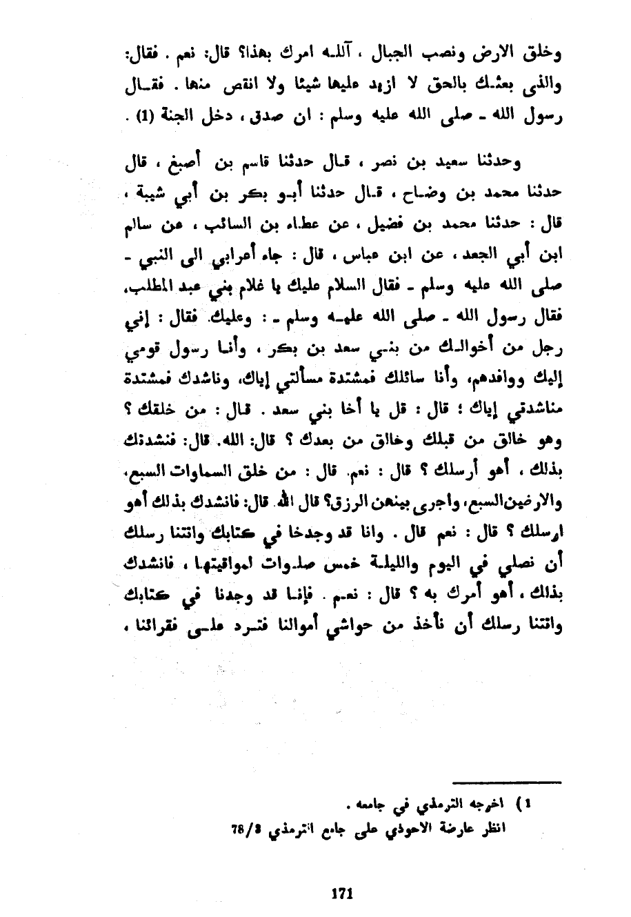 وَخَلَقَ الْأَرْضَ وَنَصَبَ الْجِبَالَ آللَّهُ أَمَرَكَ بِهَذَا قَالَ نَعَمْ فَقَالَ وَالَّذِي بَعَثَكَ بِالْحَقِّ لَا أَزِيدُ عَلَيْهَا شَيْئًا وَلَا أَنْقُصُ مِنْهَا فَقَالَ رَسُولُ اللَّهِ صَلَّى اللَّهُ عَلَيْهِ وَسَلَّمَ أن صَدَقَ دَخَلَ الْجَنَّةَ وَحَدَّثَنَا سَعِيدُ بْنُ نَصْرٍ قَالَ حَدَّثَنَا قَاسِمُ بْنُ أَصْبَغَ قَالَ حَدَّثَنَا مُحَمَّدُ بْنُ وَضَّاحٍ قَالَ حَدَّثَنَا أَبُو بَكْرِ بْنُ أَبِي شَيْبَةَ قَالَ حَدَّثَنَا مُحَمَّدُ بْنُ فُضَيْلٍ عَنْ عَطَاءِ بْنِ السَّائِبِ عَنْ سَالِمِ بْنِ أَبِي الْجَعْدِ عَنِ ابْنِ عَبَّاسٍ قَالَ جَاءَ أَعْرَابِيٌّ إِلَى النَّبِيِّ صَلَّى اللَّهُ عَلَيْهِ وَسَلَّمَ فَقَالَ السَّلَامُ عَلَيْكَ يَا غُلَامَ بَنِي عَبْدِ الْمُطَّلِبِ فَقَالَ رَسُولُ اللَّهِ صَلَّى اللَّهُ عَلَيْهِ وَسَلَّمَ وَعَلَيْكَ فَقَالَ إِنِّي رَجُلٌ مِنْ أَخْوَالِكَ مِنْ بَنِي سَعْدِ بْنِ بَكْرٍ وَأَنَا رَسُولُ قَوْمِي إِلَيْكَ وَوَافِدُهُمْ وَأَنَا سَائِلُكَ فَمُشْتَدَّةٌ مَسْأَلَتِي إِيَّاكَ وَنَاشِدُكَ فَمُشْتَدَّةٌ مُنَاشَدَتِي إِيَّاكَ قَالَ قُلْ يَا أَخَا بَنِي سَعْدٍ قَالَ مَنْ خَلَقَكَ وَهُوَ خَالِقُ مَنْ قَبْلَكَ وَخَالِقُ مَنْ بَعْدَكَ قَالَ اللَّهُ قَالَ فَنَشَدْتُكَ بِذَلِكَ أَهْوَ أَرْسَلَكَ قَالَ نَعَمْ قَالَ مَنْ خَلَقَ السَّمَاوَاتِ السَّبْعَ وَالْأَرْضِينَ السَّبْعَ وَأَجْرَى بَيْنَهُنَّ الرِّزْقَ قَالَ اللَّهُ قَالَ فَأَنْشُدُكَ بِذَلِكَ أَهْوَ أَرْسَلَكَ قَالَ نَعَمْ قَالَ وَإِنَّا قَدْ وَجَدْنَا فِي كِتَابِكَ وَأَتَتْنَا رُسُلُكَ أَنْ نُصَلِّيَ فِي الْيَوْمِ وَاللَّيْلَةِ خَمْسَ صَلَوَاتٍ لِمَوَاقِيتِهَا فَأَنْشُدُكَ بِذَلِكَ أَهُوَ أَمَرَكَ بِهِ قَالَ نَعَمْ فَإِنَّا قَدْ وَجَدْنَا فِي كِتَابِكَ وَأَتَتْنَا رُسُلُكَ أَنْ نَأْخُذَ مِنْ حَوَاشِي أَمْوَالِنَا فَتُرَدَّ عَلَى فُقَرَائِنَا