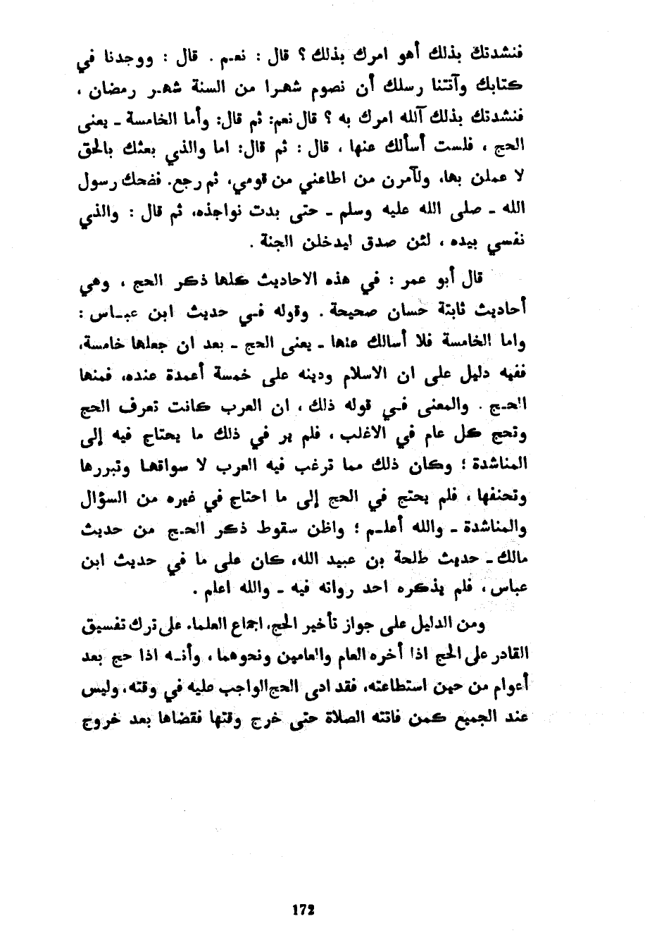 فَنَشَدْتُكَ بِذَلِكَ أَهْوَ أَمَرَكَ بِذَلِكَ قَالَ نَعَمْ قَالَ وَوَجَدْنَا فِي كِتَابِكَ وَآتَتْنَا رُسُلُكَ أَنْ نَصُومَ شَهْرًا مِنَ السَّنَةِ شَهْرَ رَمَضَانَ فَنَشَدْتُكَ بِذَلِكَ آللَّهُ أَمَرَكَ بِهِ قَالَ نَعَمْ ثُمَّ قَالَ وَأَمَّا الْخَامِسَةُ يَعْنِي الْحَجَّ فَلَسْتُ أَسْأَلُكَ عَنْهَا قَالَ ثُمَّ قَالَ أَمَا وَالَّذِي بَعَثَكَ بِالْحَقِّ لَأَعْمَلَنَّ بِهَا وَلِآمُرَنَّ مَنْ أَطَاعَنِي مِنْ قَوْمِي ثُمَّ رَجَعَ فَضَحِكَ رَسُولُ اللَّهِ صَلَّى اللَّهُ عَلَيْهِ وَسَلَّمَ حَتَّى بَدَتْ نَوَاجِذُهُ ثُمَّ قَالَ وَالَّذِي نَفْسِي بِيَدِهِ لَئِنْ صَدَقَ لِيَدْخُلَنَّ الْجَنَّةَ قَالَ أَبُو عُمَرَ فِي هَذِهِ الْأَحَادِيثِ كُلِّهَا ذِكْرُ الْحَجِّ وَهِيَ أَحَادِيثُ ثَابِتَةٌ حِسَانٌ صَحِيحَةٌ وَقَوْلُهُ فِي حَدِيثِ ابْنِ عَبَّاسٍ وَأَمَّا الْخَامِسَةُ فَلَا أَسْأَلُكَ عَنْهَا يَعْنِي الْحَجَّ بَعْدَ أَنْ جَعَلَهَا خَامِسَةً فَفِيهِ دَلِيلٌ عَلَى أَنَّ الْإِسْلَامَ وَدِينَهُ عَلَى خَمْسَةِ أَعْمِدَةٍ عِنْدَهُ فَمِنْهَا الْحَجُّ وَالْمَعْنَى فِي قَوْلِهِ ذَلِكَ أَنَّ الْعَرَبَ كَانَتْ تَعْرِفُ الْحَجَّ وَتَحُجُّ كُلَّ عَامٍ فِي الْأَغْلَبِ فَلَمْ يَرَ فِي ذَلِكَ مَا يَحْتَاجُ فِيهِ إِلَى الْمُنَاشَدَةِ وَكَانَ ذَلِكَ مِمَّا تَرْغَبُ فيه العرب لا سواقها وَتُبَرِّرُهَا وَتُحَنِّفُهَا فَلَمْ يَحْتَجْ فِي الْحَجِّ إِلَى مَا احْتَاجَ فِي غَيْرِهِ مِنَ السُّؤَالِ وَالْمُنَاشَدَةِ وَاللَّهُ أَعْلَمُ وَأَظُنُّ سُقُوطَ ذِكْرِ الْحَجِّ مِنْ حَدِيثِ مَالِكٍ حَدِيثَ طَلْحَةَ بْنِ عُبَيْدِ اللَّهِ كَانَ عَلَى مَا فِي حَدِيثِ ابْنِ عَبَّاسٍ فَلَمْ يَذْكُرْهُ أَحَدُ رُوَاتِهِ فِيهِ وَاللَّهُ أَعْلَمُ وَمِنَ الدَّلِيلِ عَلَى جَوَازِ تَأْخِيرِ الْحَجِّ إِجْمَاعُ الْعُلَمَاءِ عَلَى تَرْكِ تَفْسِيقِ الْقَادِرِ عَلَى الْحَجِّ إِذَا أَخَّرَهُ الْعَامَ وَالْعَامَيْنِ وَنَحْوَهُمَا وَأَنَّهُ إِذَا حَجَّ بَعْدَ أَعْوَامٍ مِنْ حِينِ اسْتِطَاعَتِهِ فَقَدْ أَدَّى الْحَجَّ الْوَاجِبَ عَلَيْهِ فِي وَقْتِهِ وَلَيْسَ عِنْدَ الْجَمِيعِ كَمَنْ فَاتَتْهُ الصَّلَاةُ حَتَّى خَرَجَ وَقْتُهَا فَقَضَاهَا بَعْدَ خُرُوجِ