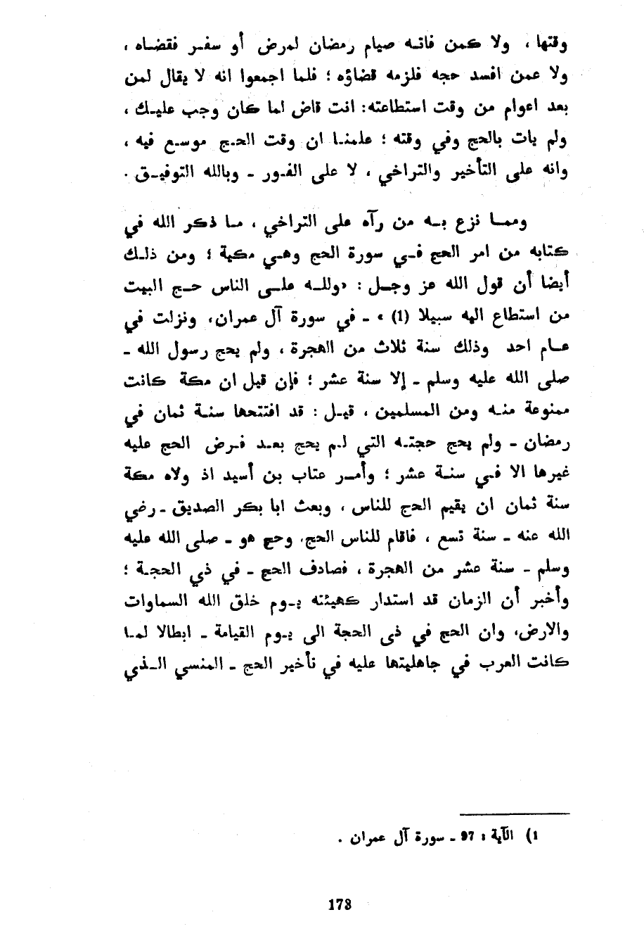 وَقْتِهَا وَلَا كَمَنْ فَاتَهُ صِيَامُ رَمَضَانَ لِمَرَضٍ أَوْ سَفَرٍ فَقَضَاهُ وَلَا عَمَّنْ أَفْسَدَ حَجَّهُ فَلَزِمَهُ قَضَاءَهُ فَلَمَّا أَجْمَعُوا أَنَّهُ لَا يُقَالُ لمن بَعْدَ أَعْوَامٍ مِنْ وَقْتِ اسْتِطَاعَتِهِ أَنْتَ قَاضٍ لِمَا كَانَ وَجَبَ عَلَيْكَ وَلَمْ يَأْتِ بِالْحَجِّ وَفِي وَقْتِهِ عَلِمْنَا أَنَّ وَقْتَ الْحَجِّ مُوَسَّعٌ فِيهِ وَأَنَّهُ عَلَى التَّأْخِيرِ وَالتَّرَاخِي لَا عَلَى الْفَوْرِ وَبِاللَّهِ التَّوْفِيقُ وَمِمَّا نَزَعَ بِهِ مَنْ رَآهُ عَلَى التَّرَاخِي مَا ذَكَرَ اللَّهُ فِي كِتَابِهِ مِنْ أَمْرِ الْحَجِّ فِي سُورَةِ الْحَجِّ وَهِيَ مَكِّيَّةٌ وَمِنْ ذَلِكَ أَيْضًا أَنَّ قَوْلَ اللَّهِ عَزَّ وَجَلَّ وَلِلَّهِ عَلَى النَّاسِ حِجُّ الْبَيْتِ مَنِ اسْتَطَاعَ إِلَيْهِ سَبِيلًا فِي سُورَةِ آلِ عِمْرَانَ وَنَزَلَتْ فِي عَامِ أُحُدٍ وَذَلِكَ سَنَةَ ثَلَاثٍ مِنَ الْهِجْرَةِ وَلَمْ يَحُجَّ رَسُولُ اللَّهِ صَلَّى اللَّهُ عَلَيْهِ وَسَلَّمَ إِلَّا سَنَةَ عَشْرٍ فَإِنْ قِيلَ إِنَّ مَكَّةَ كَانَتْ مَمْنُوعَةً مِنْهُ وَمِنَ الْمُسْلِمِينَ قِيلَ قَدِ افْتَتَحَهَا سَنَةَ ثَمَانٍ فِي رَمَضَانَ وَلَمْ يَحُجَّ حَجَّتَهُ الَّتِي لَمْ يَحُجَّ بَعْدَ فَرْضِ الْحَجِّ عَلَيْهِ غَيْرَهَا إِلَّا فِي سَنَةِ عَشْرٍ وَأَمَرَ عَتَّابَ بْنَ أُسَيْدٍ إِذْ وَلَّاهُ مَكَّةَ سَنَةَ ثَمَانٍ أَنْ يُقِيمَ الْحَجَّ لِلنَّاسِ وَبَعَثَ أَبَا بَكْرٍ الصِّدِّيقَ رَضِيَ اللَّهُ عَنْهُ سَنَةَ تِسْعٍ فَأَقَامَ لِلنَّاسِ الْحَجَّ وَحَجَّ هُوَ صَلَّى اللَّهُ عَلَيْهِ وَسَلَّمَ سَنَةَ عَشْرٍ مِنَ الْهِجْرَةِ فَصَادَفَ الْحَجَّ فِي ذِي الْحِجَّةِ وَأَخْبَرَ أَنَّ الزَّمَانَ قَدِ اسْتَدَارَ كَهَيْئَتِهِ يَوْمَ خَلَقَ اللَّهُ السَّمَاوَاتِ وَالْأَرْضَ وَأَنَّ الْحَجَّ فِي ذِي الْحِجَّةِ إِلَى يَوْمِ الْقِيَامَةِ إِبْطَالًا لِمَا كَانَتِ الْعَرَبُ فِي جَاهِلِيَّتِهَا عَلَيْهِ في تأخير الحج المنسي الذي