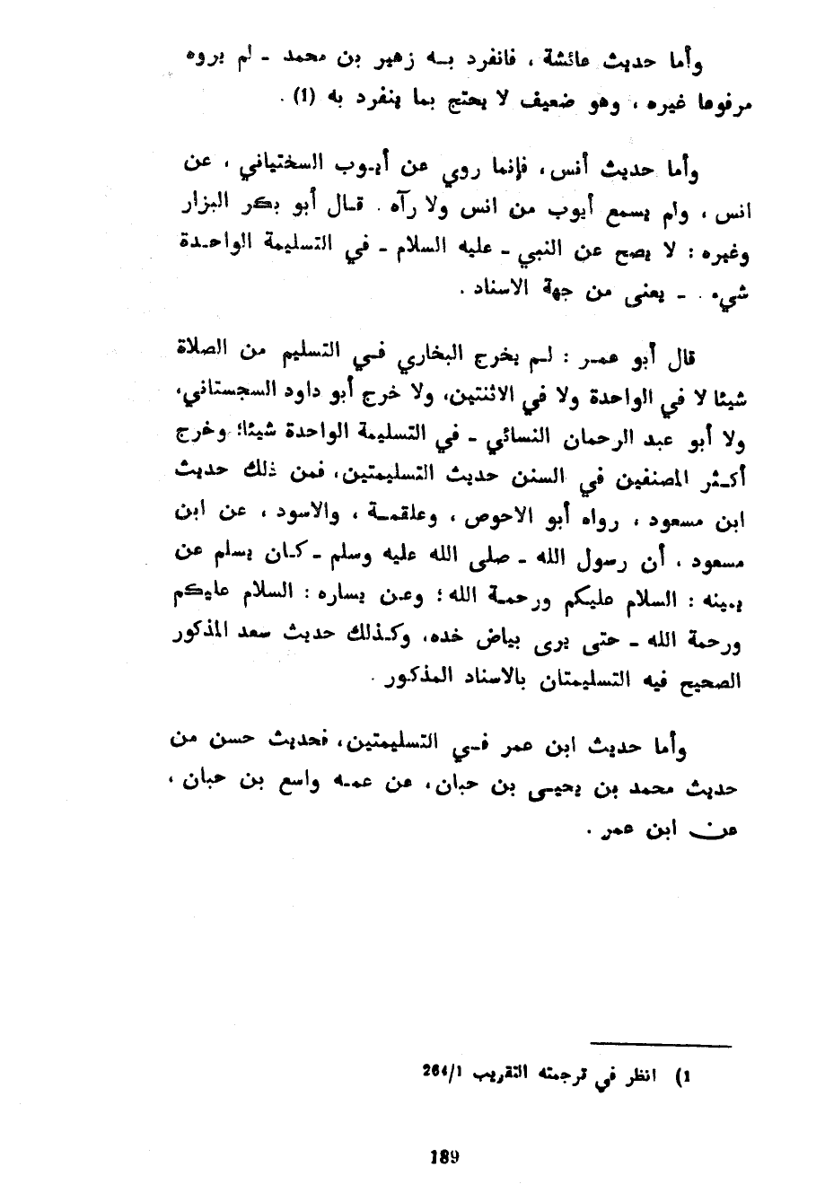 وَأَمَّا حَدِيثُ عَائِشَةَ فَانْفَرَدَ بِهِ زُهَيْرُ بْنُ مُحَمَّدٍ لَمْ يَرْوِهِ مَرْفُوعًا غَيْرُهُ وَهُوَ ضَعِيفٌ لَا يُحْتَجُّ بِمَا يَنْفَرِدُ بِهِ وَأَمَّا حَدِيثُ أَنَسٍ فَإِنَّمَا رُوِيَ عَنْ أَيُّوبَ السَّخْتِيَانِيِّ عَنْ أَنَسٍ وَلَمْ يَسْمَعْ أَيُّوبُ مِنْ أَنَسٍ وَلَا رَآهُ قَالَ أَبُو بَكْرٍ الْبَزَّارُ وَغَيْرُهُ لَا يَصِحُّ عَنِ النَّبِيِّ عَلَيْهِ السَّلَامُ فِي التَّسْلِيمَةِ الْوَاحِدَةِ شَيْءٌ يَعْنِي مِنْ جِهَةِ الْإِسْنَادِ قَالَ أَبُو عُمَرَ لَمْ يُخَرِّجْ الْبُخَارِيُّ فِي التَّسْلِيمِ مِنَ الصَّلَاةِ شَيْئًا لَا فِي الْوَاحِدَةِ وَلَا فِي الِاثْنَتَيْنِ وَلَا خَرَّجَ أَبُو دَاوُدَ السِّجِسْتَانِيُّ ولا أبو عبد الرحمان النسائي في التسليمة الواحدة شيئا خرج أَكْثَرُ الْمُصَنِّفِينَ فِي السُّنَنِ حَدِيثَ التَّسْلِيمَتَيْنِ فَمِنْ ذَلِكَ حَدِيثُ ابْنِ مَسْعُودٍ رَوَاهُ أَبُو الْأَحْوَصِ وَعَلْقَمَةُ وَالْأَسْوَدُ عَنِ ابْنِ مَسْعُودٍ أَنَّ رَسُولَ اللَّهِ صَلَّى اللَّهُ عَلَيْهِ وَسَلَّمَ كَانَ يُسَلِّمُ عَنْ يَمِينِهِ السَّلَامُ عَلَيْكُمْ وَرَحْمَةُ اللَّهِ وَعَنْ يَسَارِهِ السَّلَامُ عَلَيْكُمْ وَرَحْمَةُ اللَّهِ حَتَّى يُرَى بَيَاضُ خَدِّهِ وَكَذَلِكَ حَدِيثُ سَعْدٍ الْمَذْكُورُ الصَّحِيحُ فِيهِ التَّسْلِيمَتَانِ بِالْإِسْنَادِ الْمَذْكُورِ وَأَمَّا حَدِيثُ ابْنِ عُمَرَ فِي التَّسْلِيمَتَيْنِ فَحَدِيثٌ حَسَنٌ مِنْ حَدِيثِ مُحَمَّدِ بْنِ يَحْيَى بْنِ حِبَّانَ عَنْ عَمِّهِ وَاسِعِ بْنِ حِبَّانَ عَنِ ابْنِ عُمَرَ