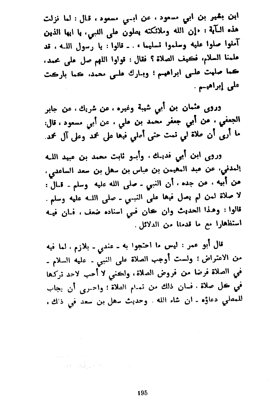 ابن بَشِيرِ بْنِ أَبِي مَسْعُودٍ عَنْ أَبِي مَسْعُودٍ قَالَ لَمَّا نَزَلَتْ هَذِهِ الْآيَةُ إِنَّ اللَّهَ وملائكته يصلون على النبي يا أيها الَّذِينَ آمَنُوا صَلُّوا عَلَيْهِ وَسَلِّمُوا تَسْلِيمًا قَالُوا يَا رَسُولَ اللَّهِ قَدْ عَلِمْنَا السَّلَامَ فَكَيْفَ الصَّلَاةُ فَقَالَ قُولُوا اللَّهُمَّ صَلِّ عَلَى مُحَمَّدٍ كَمَا صَلَّيْتَ عَلَى إِبْرَاهِيمَ وَبَارِكْ عَلَى مُحَمَّدٍ كَمَا بَارَكْتَ عَلَى إِبْرَاهِيمَ وَرَوَى عُثْمَانُ بْنُ أَبِي شَيْبَةَ وَغَيْرُهُ عَنْ شَرِيكٍ عَنْ جَابِرٍ الْجُعْفِيِّ عَنْ أَبِي جَعْفَرٍ مُحَمَّدِ بْنِ عَلِيٍّ عَنْ أَبِي مَسْعُودٍ قَالَ مَا أَرَى أَنَّ صَلَاةً لِي تَمَّتْ حَتَّى أُصَلِّيَ فِيهَا عَلَى مُحَمَّدٍ وَعَلَى آلِ مُحَمَّدٍ وَرَوَى ابْنُ أَبِي فُدَيْكٍ وَأَبُو ثَابِتٍ مُحَمَّدُ بْنُ عُبَيْدِ اللَّهِ الْمَدَنِيُّ عَنْ عَبْدِ الْمُهَيْمِنِ بْنِ عَبَّاسِ بْنِ سهل بن سعد الساعدي عَنْ أَبِيهِ عَنْ جَدِّهِ أَنَّ النَّبِيَّ صَلَّى اللَّهُ عَلَيْهِ وَسَلَّمَ قَالَ لَا صَلَاةَ لِمَنْ لَمْ يُصَلِّ فِيهَا عَلَى النَّبِيِّ صَلَّى اللَّهُ عَلَيْهِ وَسَلَّمَ قَالُوا وَهَذَا الْحَدِيثُ وَإِنْ كَانَ فِي إِسْنَادِهِ ضَعْفٌ فَإِنَّ فِيهِ اسْتِظْهَارًا مَعَ مَا قَدَّمْنَا مِنَ الدَّلَائِلِ قَالَ أَبُو عُمَرَ لَيْسَ مَا احْتَجُّوا بِهِ عِنْدِي بِلَازِمٍ لِمَا فِيهِ مِنَ الِاعْتِرَاضِ وَلَسْتُ أُوجِبُ الصَّلَاةَ عَلَى النَّبِيِّ عَلَيْهِ السَّلَامُ فِي الصَّلَاةِ فَرْضًا مِنْ فُرُوضِ الصَّلَاةِ وَلَكِنِّي لَا أُحِبُّ لِأَحَدٍ تَرْكَهَا فِي كُلِّ صَلَاةٍ فَإِنَّ ذَلِكَ مِنْ تَمَامِ الصَّلَاةِ وَأَحْرَى أَنْ يُجَابَ لِلْمُصَلِّي دُعَاؤُهُ إِنْ شَاءَ اللَّهُ وَحَدِيثُ سَهْلِ بْنِ سَعْدٍ فِي ذَلِكَ