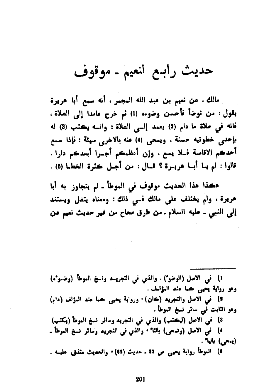 حَدِيثٌ رَابِعٌ لِنُعَيْمٍ مَوْقُوفٌ مَالِكٌ عَنْ نُعَيْمِ بْنِ عَبْدِ اللَّهِ الْمُجْمِرِ أَنَّهُ سَمِعَ أَبَا هريرة يقول مَنْ تَوَضَّأَ فَأَحْسَنَ وَضَوْءَهُ ثُمَّ خَرَجَ عَامِدًا إِلَى الصَّلَاةِ فَإِنَّهُ فِي صَلَاةٍ مَا دَامَ يَعْمِدُ إِلَى الصَّلَاةِ وَإِنَّهُ يُكْتَبُ لَهُ بِإِحْدَى خُطْوَتَيْهِ حَسَنَةٌ وَيُمْحَى عَنْهُ بِالْأُخْرَى سَيِّئَةٌ فَإِذَا سَمِعَ أَحَدُكُمُ الْإِقَامَةَ فَلَا يَسْعَ وَإِنَّ أَعْظَمَكُمْ أَجْرًا أَبْعَدُكُمْ دَارًا قَالُوا لِمَ يَا أَبَا هُرَيْرَةَ قَالَ مِنْ أَجْلِ كَثْرَةِ الْخُطَا هَكَذَا هَذَا الْحَدِيثُ مَوْقُوفٌ فِي الْمُوَطَّأِ لَمْ يَتَجَاوَزْ بِهِ أَبَا هُرَيْرَةَ وَلَمْ يُخْتَلَفْ عَلَى مَالِكٍ فِي ذَلِكَ وَمَعْنَاهُ يَتَّصِلُ وَيَسْتَنِدُ إِلَى النَّبِيِّ عَلَيْهِ السَّلَامُ مِنْ طُرُقٍ صِحَاحٍ مِنْ غَيْرِ حَدِيثِ نُعَيْمٍ عَنْ