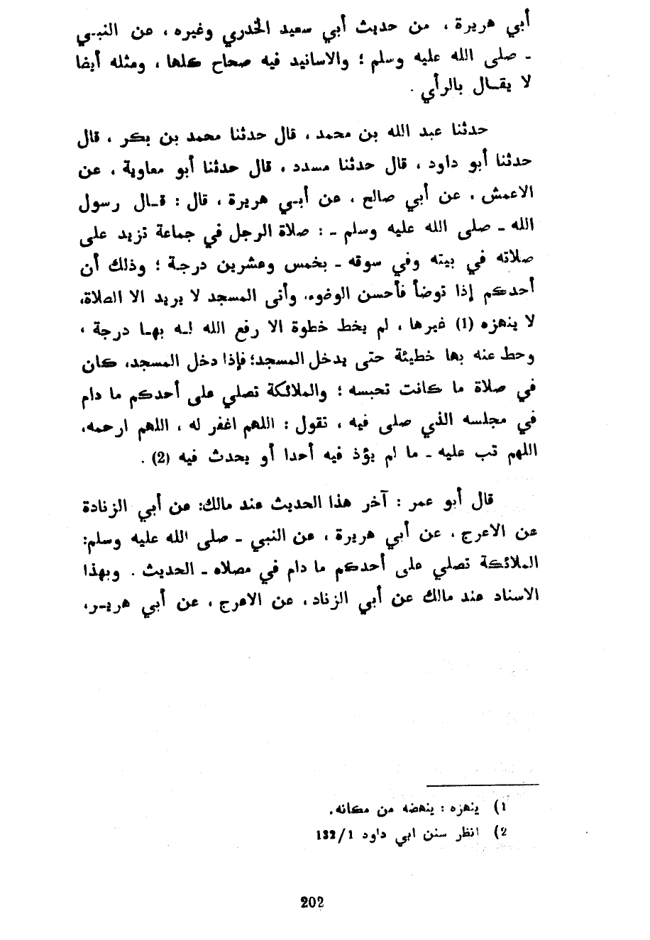 أَبِي هُرَيْرَةَ مِنْ حَدِيثِ أَبِي سَعِيدٍ الْخُدْرِيِّ وَغَيْرُهُ عَنِ النَّبِيِّ صَلَّى اللَّهُ عَلَيْهِ وَسَلَّمَ وَالْأَسَانِيدُ فِيهِ صِحَاحٌ كُلُّهَا وَمِثْلُهُ أَيْضًا لَا يُقَالُ بِالرَّأْيِ حَدَّثَنَا عَبْدُ اللَّهِ بْنُ مُحَمَّدٍ قَالَ حَدَّثَنَا مُحَمَّدُ بْنُ بَكْرٍ قَالَ حَدَّثَنَا أَبُو دَاوُدَ قَالَ حَدَّثَنَا مُسَدَّدٌ قَالَ حَدَّثَنَا أَبُو مُعَاوِيَةَ عَنِ الْأَعْمَشِ عَنْ أَبِي صَالِحٍ عَنْ أَبِي هُرَيْرَةَ قَالَ قَالَ رَسُولُ اللَّهِ صَلَّى اللَّهُ عَلَيْهِ وَسَلَّمَ صَلَاةُ الرَّجُلِ فِي جَمَاعَةٍ تَزِيدُ عَلَى صَلَاتِهِ فِي بَيْتِهِ وَفِي سُوقِهِ بِخَمْسٍ وَعِشْرِينَ دَرَجَةً وَذَلِكَ أَنَّ أَحَدَكُمْ إِذَا تَوَضَّأَ فَأَحْسَنَ الْوُضُوءَ وَأَتَى الْمَسْجِدَ لَا يُرِيدُ إِلَّا الصَّلَاةَ لَا يَنْهَزُهُ غَيْرُهَا لَمْ يَخْطُ خُطْوَةً إِلَّا رَفَعَ اللَّهُ لَهُ بِهَا دَرَجَةً وَحَطَّ عَنْهُ بِهَا خَطِيئَةً حَتَّى يَدْخُلَ الْمَسْجِدَ فَإِذَا دَخَلَ الْمَسْجِدَ كَانَ فِي صَلَاةٍ مَا كَانَتْ تَحْبِسُهُ وَالْمَلَائِكَةُ تُصَلِّي عَلَى أَحَدِكُمْ مَا دَامَ فِي مَجْلِسِهِ الَّذِي صَلَّى فِيهِ تَقُولُ اللَّهُمَّ اغْفِرْ لَهُ اللَّهُمَّ ارْحَمْهُ اللَّهُمَّ تُبْ عَلَيْهِ مَا لَمْ يُؤْذِ فِيهِ أَحَدًا أَوْ يُحْدِثْ فِيهِ قَالَ أَبُو عُمَرَ آخِرُ هَذَا الْحَدِيثِ عِنْدَ مَالِكٌ عَنْ أَبِي الزِّنَادِ عَنِ الْأَعْرَجِ عَنْ أَبِي هُرَيْرَةَ عَنِ النَّبِيِّ صَلَّى اللَّهُ عَلَيْهِ وَسَلَّمَ الْمَلَائِكَةُ تُصَلِّي عَلَى أَحَدِكُمْ مَا دَامَ فِي مُصَلَّاهُ الْحَدِيثَ وَبِهَذَا الْإِسْنَادِ عِنْدَ مَالِكٌ عَنْ أَبِي الزِّنَادِ عَنِ الْأَعْرَجِ عَنْ أَبِي هُرَيْرَةَ