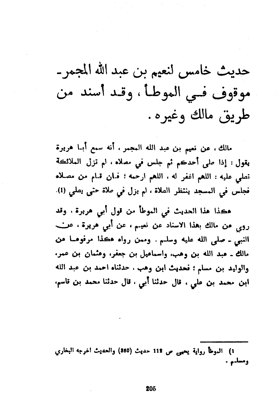 حَدِيثٌ خَامِسٌ لِنُعَيْمِ بْنِ عَبْدِ اللَّهِ الْمُجْمِرِ مَوْقُوفٌ فِي الْمُوَطَّأِ وَقَدْ أُسْنِدَ مِنْ طَرِيقِ مَالِكٍ وَغَيْرِهِ مَالِكٌ عَنْ نُعَيْمِ بْنِ عَبْدِ اللَّهِ الْمُجْمِرِ أَنَّهُ سَمِعَ أَبَا هُرَيْرَةَ يَقُولُ إِذَا صَلَّى أَحَدُكُمْ ثُمَّ جَلَسَ فِي مُصَلَّاهُ لَمْ تَزَلِ الْمَلَائِكَةُ تُصَلِّي عَلَيْهِ اللَّهُمَّ اغْفِرْ لَهُ اللَّهُمَّ ارْحَمْهُ فَإِنْ قَامَ مِنْ مُصَلَّاهُ فَجَلَسَ فِي الْمَسْجِدِ يَنْتَظِرُ الصَّلَاةَ لَمْ يَزَلْ فِي صَلَاةٍ حَتَّى يُصَلِّيَ هَكَذَا هَذَا الْحَدِيثُ فِي الْمُوَطَّأِ مِنْ قَوْلِ أَبِي هُرَيْرَةَ وَقَدْ رُوِيَ عَنْ مَالِكٍ بِهَذَا الْإِسْنَادِ عَنْ نُعَيْمٍ عَنْ أَبِي هُرَيْرَةَ عَنِ النَّبِيِّ صَلَّى اللَّهُ عَلَيْهِ وَسَلَّمَ وَمِمَّنْ رَوَاهُ هَكَذَا مَرْفُوعًا عَنْ مَالِكٍ عَبْدُ اللَّهِ بْنُ وَهْبٍ وَإِسْمَاعِيلُ بْنُ جَعْفَرٍ وَعُثْمَانُ بْنُ عُمَرَ وَالْوَلِيدُ بْنُ مُسْلِمٍ فَحَدِيثُ ابْنِ وَهْبٍ حَدَّثَنَاهُ أَحْمَدُ بْنُ عَبْدِ اللَّهِ بْنِ مُحَمَّدٍ بْنِ عَلِيٍّ قَالَ حَدَّثَنَا أَبِي قَالَ حَدَّثَنَا مُحَمَّدُ بْنُ قَاسِمٍ