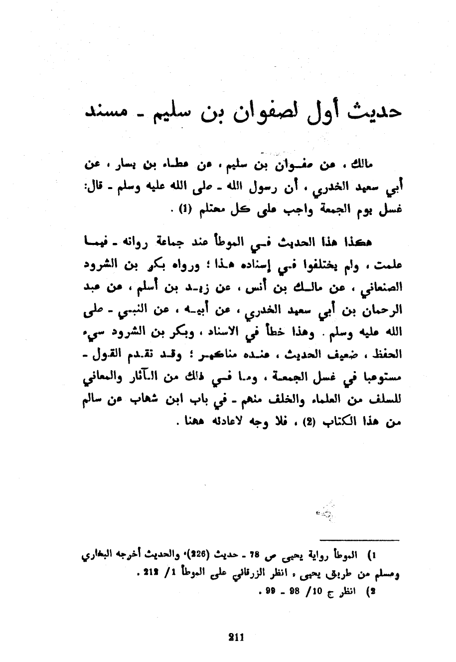 حَدِيثٌ أَوَّلٌ لِصَفْوَانَ بْنِ سُلَيْمٍ مُسْنَدٌ مَالِكٌ عَنْ صَفْوَانَ بْنِ سُلَيْمٍ عَنْ عَطَاءِ بْنِ يَسَارٍ عَنْ أَبِي سَعِيدٍ الْخُدْرِيِّ أَنَّ رَسُولَ اللَّهِ صَلَّى اللَّهُ عَلَيْهِ وَسَلَّمَ قَالَ غُسْلُ يَوْمِ الْجُمُعَةِ وَاجِبٌ عَلَى كُلِّ مُحْتَلِمٍ هَكَذَا هَذَا الْحَدِيثُ فِي الْمُوَطَّأِ عِنْدَ جَمَاعَةِ رُوَاتِهِ فِيمَا عَلِمْتُ وَلَمْ يَخْتَلِفُوا فِي إِسْنَادِهِ هَذَا وَرَوَاهُ بَكْرُ بْنُ الشَّرُودِ الصَّنْعَانِيُّ عَنْ مَالِكِ بْنِ أَنَسٍ عَنْ زَيْدِ بْنِ أَسْلَمَ عَنْ عبد الرحمان بْنِ أَبِي سَعِيدٍ الْخُدْرِيِّ عَنْ أَبِيهِ عَنِ النَّبِيِّ صَلَّى اللَّهُ عَلَيْهِ وَسَلَّمَ وَهَذَا خَطَأٌ في الإسناد وبكر بن الشرود سيء الْحِفْظِ ضَعِيفُ الْحَدِيثِ عِنْدَهُ مَنَاكِيرُ وَقَدْ تَقَدَّمَ الْقَوْلُ مُسْتَوْعِبًا فِي غُسْلِ الْجُمُعَةِ وَمَا فِي ذَلِكَ مِنَ الْآثَارِ وَالْمَعَانِي لِلسَّلَفِ مِنَ الْعُلَمَاءِ وَالْخَلْفِ مِنْهُمْ فِي بَابِ ابْنِ شِهَابٍ عَنْ سَالِمٍ مِنْ هَذَا الْكِتَابِ فَلَا وَجْهَ لِإِعَادَتِهِ ههنا