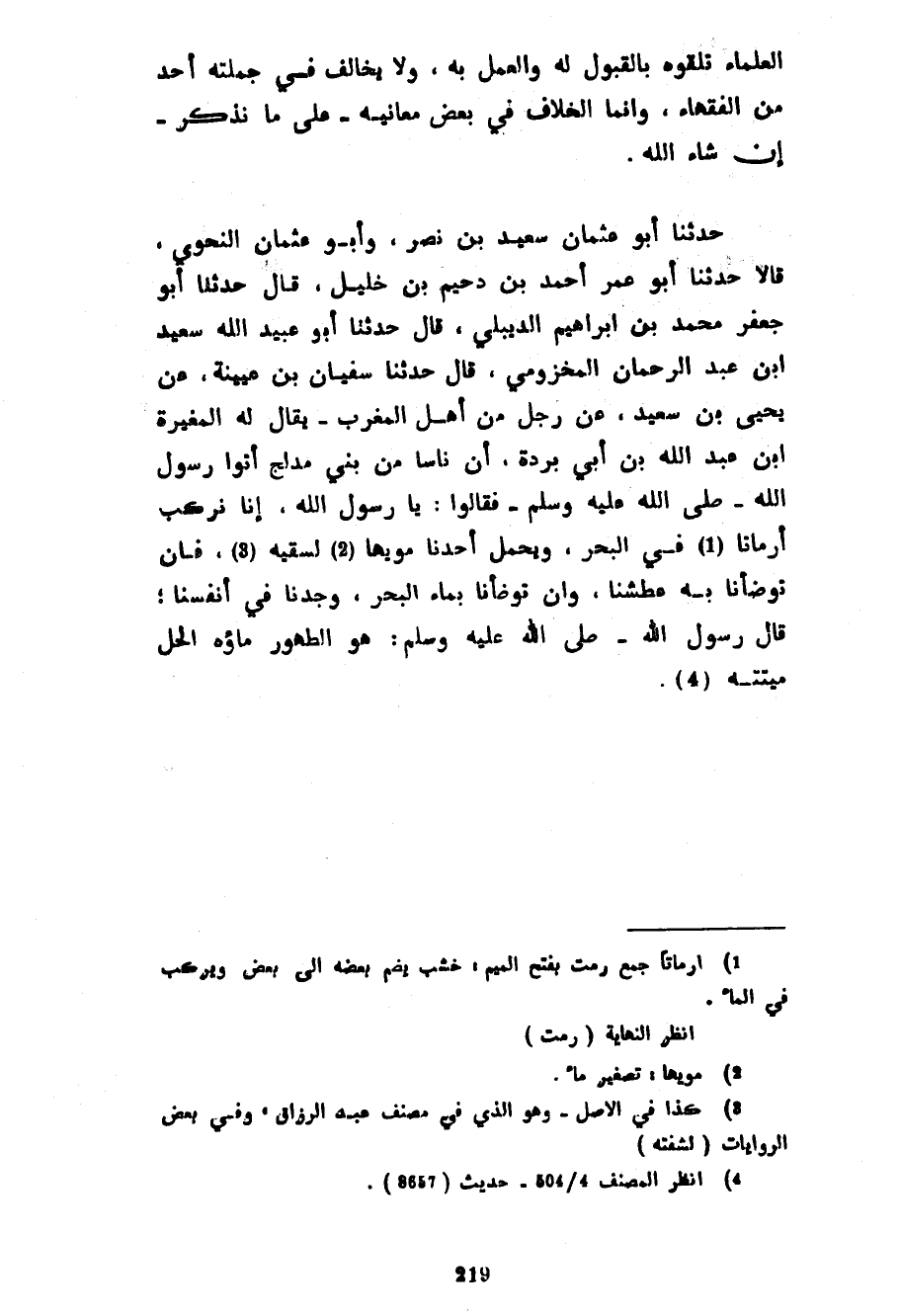 الْعُلَمَاءَ تَلَقَّوْهُ بِالْقَبُولِ لَهُ وَالْعَمَلِ بِهِ وَلَا يُخَالِفُ فِي جُمْلَتِهِ أَحَدٌ مِنَ الْفُقَهَاءِ وَإِنَّمَا الْخِلَافُ فِي بَعْضِ مَعَانِيهِ عَلَى مَا نَذْكُرُ إِنْ شَاءَ اللَّهُ حَدَّثَنَا أَبُو عُثْمَانَ سَعِيدُ بْنُ نَصْرٍ وَأَبُو عُثْمَانَ النَّحْوِيُّ قَالَا حَدَّثَنَا أَبُو عُمَرَ أَحْمَدُ بْنُ دُحَيْمِ بْنِ خَلِيلٍ قَالَ حَدَّثَنَا أَبُو جَعْفَرٍ مُحَمَّدُ بْنُ إِبْرَاهِيمَ الدَّيْبُلِيُّ قَالَ حَدَّثَنَا أَبُو عُبَيْدِ اللَّهِ سَعِيدُ بْنُ عبد الرحمان الْمَخْزُومِيُّ قَالَ حَدَّثَنَا سُفْيَانُ بْنُ عُيَيْنَةَ عَنْ يَحْيَى بْنِ سَعِيدٍ عَنْ رَجُلٍ مِنْ أَهْلِ الْمَغْرِبِ يُقَالُ لَهُ الْمُغِيرَةُ بْنُ عَبْدِ اللَّهِ بْنِ أَبِي بُرْدَةَ أَنَّ نَاسًا مِنْ بَنِي مُدْلِجٍ أَتَوْا رَسُولَ اللَّهِ صَلَّى اللَّهُ عَلَيْهِ وَسَلَّمَ فَقَالُوا يَا رَسُولَ اللَّهِ إِنَّا نَرْكَبُ أرماتا فِي الْبَحْرِ وَيَحْمِلُ أَحَدُنَا مُوَيْهًا لِسَقْيِهِ فَإِنْ تَوَضَّأْنَا بِهِ عَطِشْنَا وَإِنْ تَوَضَّأْنَا بِمَاءِ الْبَحْرِ وَجَدْنَا فِي أَنْفُسِنَا قَالَ رَسُولُ اللَّهِ صَلَّى اللَّهُ عَلَيْهِ وَسَلَّمَ هُوَ الطَّهُورُ مَاؤُهُ الْحِلُّ ميتته