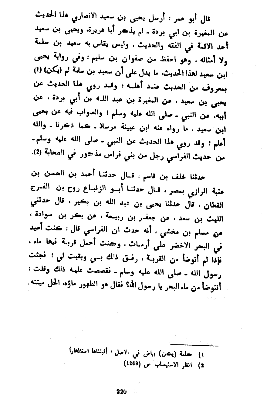 قَالَ أَبُو عُمَرَ أَرْسَلَ يَحْيَى بْنُ سَعِيدٍ الْأَنْصَارِيُّ هَذَا الْحَدِيثَ عَنِ الْمُغِيرَةِ بْنِ أَبِي بُرْدَةَ لَمْ يَذْكُرْ أَبَا هُرَيْرَةَ وَيَحْيَى بْنُ سَعِيدٍ أَحَدُ الْأَئِمَّةِ فِي الْفِقْهِ وَالْحَدِيثِ وَلَيْسَ يُقَاسُ بِهِ سَعِيدُ بْنُ سَلَمَةَ وَلَا أَمْثَالُهُ وَهُوَ أَحْفَظُ مِنْ صَفْوَانَ بْنِ سُلَيْمٍ وَفِي رِوَايَةِ يَحْيَى بْنِ سَعِيدٍ لِهَذَا الْحَدِيثِ مَا يَدُلُّ عَلَى أَنَّ سَعِيدَ بْنَ سَلَمَةَ لَمْ (يَكُنْ) بِمَعْرُوفٍ مِنَ الْحَدِيثِ عِنْدَ أَهْلِهِ وَقَدْ رُوِيَ هَذَا الْحَدِيثُ عَنْ يَحْيَى بْنِ سَعِيدٍ عَنِ الْمُغِيرَةِ بْنِ عَبْدِ اللَّهِ بْنِ أَبِي بُرْدَةَ عَنْ أَبِيهِ عَنِ النَّبِيِّ صَلَّى اللَّهُ عَلَيْهِ وَسَلَّمَ وَالصَّوَابُ فِيهِ عَنْ يَحْيَى بْنِ سَعِيدٍ مَا رَوَاهُ عَنْهُ ابْنُ عُيَيْنَةَ مُرْسَلًا كَمَا ذَكَرْنَا وَاللَّهُ أَعْلَمُ وَقَدْ رَوَى هَذَا الْحَدِيثَ عَنْ النَّبِيِّ صَلَّى اللَّهُ عَلَيْهِ وَسَلَّمَ مِنْ حَدِيثِ الْفِرَاسِيِّ رَجُلٍ مِنْ بَنِي فِرَاسٍ مَذْكُورٍ فِي الصَّحَابَةِ حَدَّثَنَا خَلَفُ بْنُ قَاسِمٍ قَالَ حَدَّثَنَا أَحْمَدُ بْنُ الْحَسَنِ بْنِ عُتْبَةَ الرَّازِيُّ بِمِصْرَ قَالَ حَدَّثَنَا أَبُو الزِّنْبَاعِ رُوحُ بْنُ الْفَرَجِ الْقَطَّانُ قَالَ حَدَّثَنَا يَحْيَى بْنُ عَبْدِ اللَّهِ بْنِ بُكَيْرٍ قَالَ حَدَّثَنِي اللَّيْثِ بْنِ سَعْدٍ عَنْ جَعْفَرِ بْنِ رَبِيعَةَ عَنْ بَكْرِ بْنِ سَوَادَةَ عَنْ مُسْلِمِ بْنِ مَخْشِيٍّ أَنَّهُ حُدِّثَ أَنَّ الْفِرَاسِيَّ قَالَ كُنْتُ أَصِيدُ فِي الْبَحْرِ الْأَخْضَرِ عَلَى أَرْمَاثٍ وَكُنْتُ أَحْمِلُ قِرْبَةً فِيهَا مَاءٌ فَإِذَا لَمْ أَتَوَضَّأْ مِنَ الْقِرْبَةِ رَفَقَ ذَلِكَ بِي وَبَقِيَتْ لِي فَجِئْتُ رَسُولَ اللَّهِ صَلَّى اللَّهُ عَلَيْهِ وَسَلَّمَ فَقَصَصْتُ عَلَيْهِ ذَلِكَ وَقُلْتُ أَنَتَوَضَّأُ مِنْ مَاءِ الْبَحْرِ يَا رَسُولَ اللَّهِ فَقَالَ هُوَ الطَّهُورُ مَاؤُهُ الحل ميتته