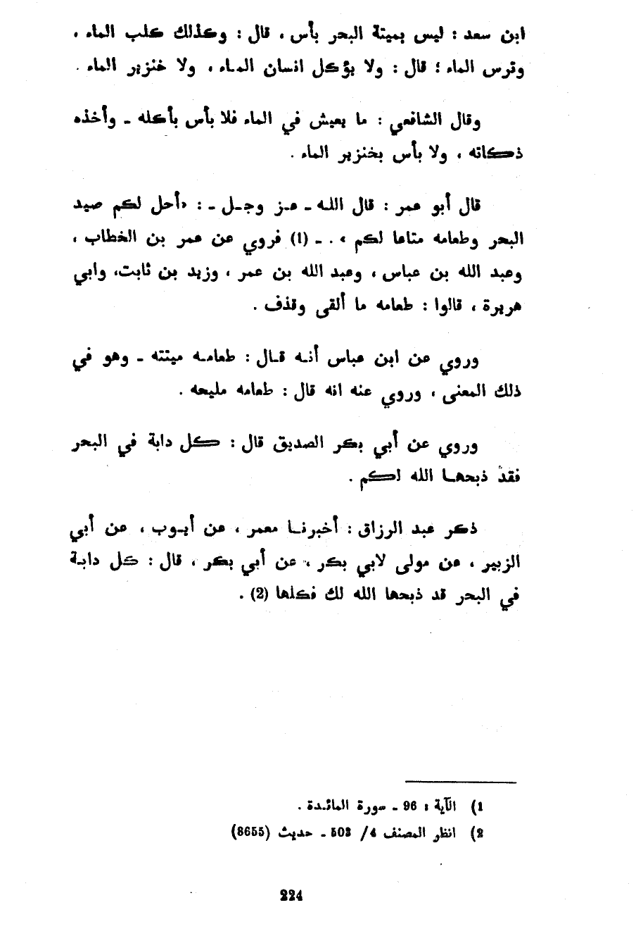 ابن سَعْدٍ لَيْسَ بِمَيْتَةِ الْبَحْرِ بَأْسٌ قَالَ وَكَذَلِكَ كَلْبُ الْمَاءِ وَتُرْسُ الْمَاءِ قَالَ وَلَا يُؤْكَلُ إِنْسَانُ الْمَاءِ وَلَا خِنْزِيرُ الْمَاءِ وَقَالَ الشَّافِعِيُّ مَا يَعِيشُ فِي الْمَاءِ فَلَا بَأْسَ بِأَكْلِهِ وَأَخْذُهُ ذَكَاتُهُ وَلَا بَأْسَ بِخِنْزِيرِ الْمَاءِ قَالَ أَبُو عُمَرَ قَالَ اللَّهُ عَزَّ وَجَلَّ أُحِلَّ لَكُمْ صَيْدُ الْبَحْرِ وَطَعَامُهُ مَتَاعًا لَكُمْ فَرُوِيَ عَنْ عُمَرَ بْنِ الْخَطَّابِ وَعَبْدِ اللَّهِ بْنِ عَبَّاسٍ وَعَبْدِ اللَّهِ بْنِ عُمَرَ وَزَيْدِ بْنِ ثَابِتٍ وَأَبِي هُرَيْرَةَ قَالُوا طَعَامُهُ مَا أَلْقَى وَقَذَفَ وَرُوِيَ عَنِ ابْنِ عَبَّاسٍ أَنَّهُ قَالَ طَعَامُهُ مَيْتَتُهُ وَهُوَ فِي ذَلِكَ الْمَعْنَى وَرُوِيَ عَنْهُ أَنَّهُ قَالَ طَعَامُهُ مُلَيْحُهُ وَرُوِيَ عَنْ أَبِي بَكْرٍ الصِّدِّيقِ قَالَ كُلُّ دَابَّةٍ فِي الْبَحْرِ فَقَدْ ذَبَحَهَا اللَّهُ لَكُمْ ذَكَرَ عَبْدُ الرَّزَّاقِ أَخْبَرَنَا مَعْمَرٌ عَنْ أَيُّوبَ عَنْ أَبِي الزُّبَيْرِ عَنْ مَوْلًى لِأَبِي بَكْرٍ عَنْ أَبِي بَكْرٍ قَالَ كُلُّ دَابَّةٍ فِي الْبَحْرِ قَدْ ذَبَحَهَا اللَّهُ لَكَ فَكُلْهَا