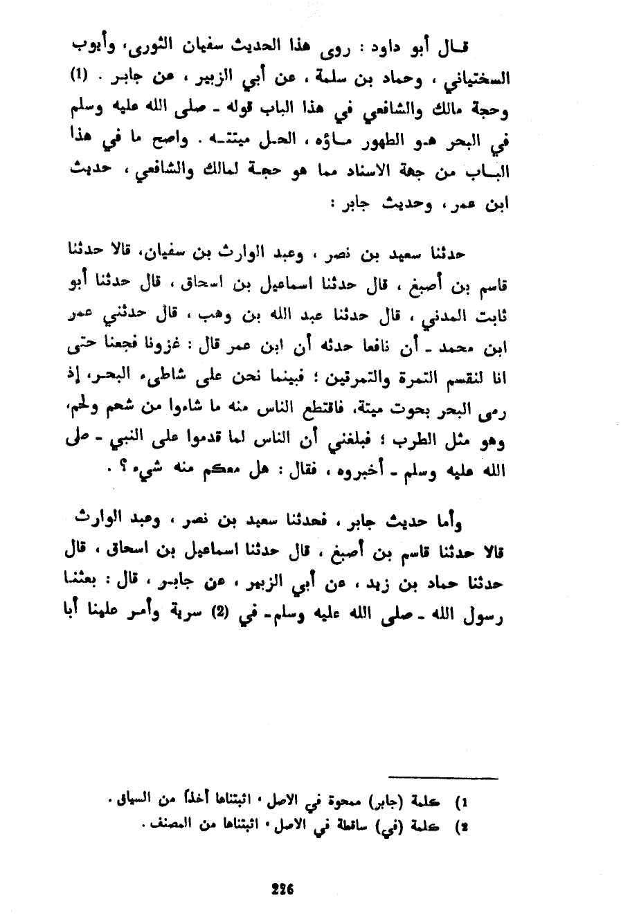 قَالَ أَبُو دَاوُدَ رَوَى هَذَا الْحَدِيثَ سُفْيَانُ الثَّوْرِيُّ وَأَيُّوبُ السَّخْتِيَانِيُّ وَحَمَّادُ بْنُ سَلَمَةَ عَنْ أَبِي الزُّبَيْرِ عَنْ جَابِرٍ وَحُجَّةُ مَالِكٍ وَالشَّافِعِيِّ فِي هَذَا الْبَابِ قَوْلُهُ صَلَّى اللَّهُ عَلَيْهِ وَسَلَّمَ فِي الْبَحْرِ هُوَ الطَّهُورُ مَاؤُهُ الْحِلُّ مَيْتَتُهُ وَأَصَحُّ مَا فِي هَذَا الْبَابِ مِنْ جِهَةِ الْإِسْنَادِ مِمَّا هُوَ حُجَّةٌ لِمَالِكٍ وَالشَّافِعِيِّ حَدِيثُ ابْنِ عُمَرَ وَحَدِيثُ جَابِرٍ حَدَّثَنَا سَعِيدُ بْنُ نَصْرٍ وَعَبْدُ الْوَارِثِ بْنُ سُفْيَانَ قَالَا حَدَّثَنَا قَاسِمُ بْنُ أَصْبَغَ قَالَ حَدَّثَنَا إِسْمَاعِيلُ بْنُ إِسْحَاقَ قَالَ حَدَّثَنَا أَبُو ثَابِتٍ الْمَدَنِيُّ قَالَ حَدَّثَنَا عَبْدُ اللَّهِ بْنُ وَهْبٍ قَالَ حَدَّثَنِي عُمَرُ بْنُ مُحَمَّدٍ أَنَّ نَافِعًا حَدَّثَهُ أَنَّ ابْنَ عُمَرَ قَالَ غَزَوْنَا فَجُعْنَا حَتَّى إِنَّا لَنَقْسِمُ التَّمْرَةَ وَالتَّمْرَتَيْنِ فَبَيْنَمَا نَحْنُ عَلَى شَاطِئِ الْبَحْرِ إِذْ رَمَى الْبَحْرُ بِحُوتٍ مَيْتَةٍ فَاقْتَطَعَ النَّاسُ مِنْهُ مَا شَاءُوا مِنْ شَحْمٍ ولحم وهو مثل الطرب فبلغني أن الناس لم قَدِمُوا عَلَى النَّبِيِّ صَلَّى اللَّهُ عَلَيْهِ وَسَلَّمَ أَخْبَرُوهُ فَقَالَ هَلْ مَعَكُمْ مِنْهُ شَيْءٌ وَأَمَّا حَدِيثُ جَابِرٍ فَحَدَّثَنَا سَعِيدُ بْنُ نَصْرٍ وَعَبْدُ الْوَارِثِ قَالَا حَدَّثَنَا قَاسِمُ بْنُ أَصْبَغَ قَالَ حَدَّثَنَا إِسْمَاعِيلُ بْنُ إِسْحَاقَ قَالَ حَدَّثَنَا حَمَّادُ بْنُ زَيْدٍ عَنْ أَبِي الزُّبَيْرِ عَنْ جَابِرٍ قَالَ بَعَثَنَا رَسُولُ اللَّهِ صَلَّى اللَّهُ عَلَيْهِ وَسَلَّمَ فِي سَرِيَّةٍ وَأَمَّرَ عَلَيْنَا أَبَا