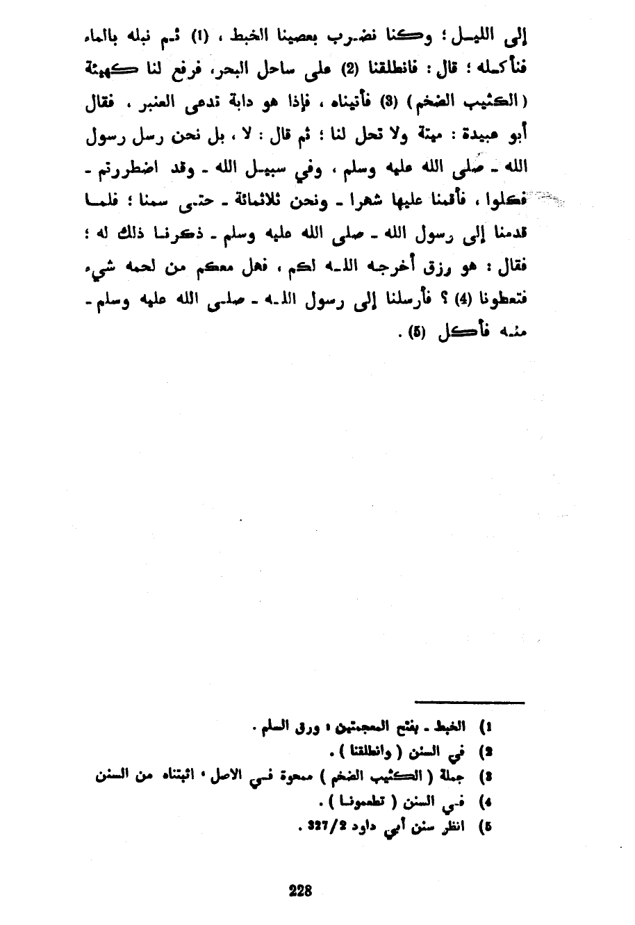 إِلَى اللَّيْلِ وَكُنَّا نَضْرِبُ بِعِصِيِّنَا الْخَبَطَ ثُمَّ نَبُلُّهُ بِالْمَاءِ فَنَأْكُلُهُ قَالَ فَانْطَلَقْنَا عَلَى سَاحِلِ الْبَحْرِ فَرُفِعَ لَنَا كَهَيْئَةِ (الْكَثِيبِ الضَّخْمِ) فَأَتَيْنَاهُ فَإِذَا هُوَ دَابَّةٌ تُدْعَى الْعَنْبَرُ فَقَالَ أَبُو عُبَيْدَةَ مَيْتَةٌ وَلَا تَحِلُّ لَنَا ثُمَّ قَالَ لَا بَلْ نَحْنُ رُسُلُ رَسُولِ اللَّهِ صَلَّى اللَّهُ عَلَيْهِ وَسَلَّمَ وَفِي سَبِيلِ اللَّهِ وَقَدِ اضْطُرِرْتُمْ فَكُلُوا فَأَقَمْنَا عَلَيْهَا شَهْرًا وَنَحْنُ ثَلَاثُمِائَةٍ حَتَّى سَمِنَّا فَلَمَّا قَدِمْنَا إِلَى رَسُولِ اللَّهِ صَلَّى اللَّهُ عَلَيْهِ وَسَلَّمَ ذَكَرْنَا ذَلِكَ لَهُ فَقَالَ هُوَ رِزْقٌ أَخْرَجَهُ اللَّهُ لَكُمْ فَهَلْ مَعَكُمْ مِنْ لَحْمِهِ شَيْءٌ فَتُعْطُونَا فَأَرْسَلْنَا إِلَى رَسُولِ اللَّهِ صَلَّى اللَّهُ عَلَيْهِ وَسَلَّمَ مِنْهُ فأكل