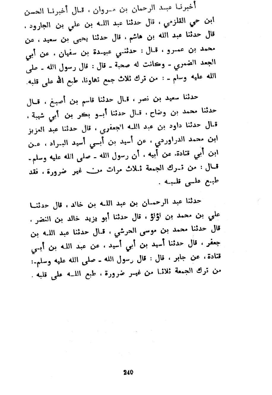 أخبرنا عبد الرحمان بْنُ مَرْوَانَ قَالَ أَخْبَرَنَا الْحَسَنُ بْنُ حَيٍّ الْقَلْزُمِيُّ قَالَ حَدَّثَنَا عَبْدُ اللَّهِ بْنُ عَلِيِّ بْنِ الْجَارُودِ قَالَ حَدَّثَنَا عَبْدُ اللَّهِ بْنُ هَاشِمٍ قَالَ حَدَّثَنَا يَحْيَى بْنُ سَعِيدٍ عَنْ مُحَمَّدِ بْنِ عَمْرٍو قَالَ حَدَّثَنِي عُبَيْدَةُ بْنُ سُفْيَانَ عَنْ أَبِي الْجَعْدِ الضَّمْرِيِّ وَكَانَتْ لَهُ صُحْبَةٌ قَالَ قَالَ رَسُولُ اللَّهِ صَلَّى اللَّهُ عَلَيْهِ وَسَلَّمَ مَنْ تَرَكَ ثَلَاثَ جُمَعٍ تَهَاوُنًا طَبَعَ اللَّهُ عَلَى قَلْبِهِ حَدَّثَنَا سَعِيدُ بْنُ نَصْرٍ قَالَ حَدَّثَنَا قَاسِمُ بْنُ أَصْبَغَ قَالَ حَدَّثَنَا ابْنُ وَضَّاحٍ قَالَ حَدَّثَنَا أَبُو بَكْرِ بْنُ أَبِي شَيْبَةَ قَالَ حَدَّثَنَا دَاوُدُ بْنُ عَبْدِ اللَّهِ الْجَعْفَرِيُّ قَالَ حَدَّثَنَا عَبْدُ الْعَزِيزِ بْنُ مُحَمَّدٍ الدَّرَاوَرْدِيُّ عَنْ أُسَيْدِ بْنِ أَبِي أُسِيدٍ الْبَرَّادُ عَنِ ابْنِ أَبِي قَتَادَةَ عَنْ أَبِيهِ أَنَّ رَسُولَ اللَّهِ صَلَّى اللَّهُ عَلَيْهِ وَسَلَّمَ قَالَ مَنْ تَرَكَ الْجُمُعَةَ ثَلَاثَ مَرَّاتٍ مِنْ غَيْرِ ضَرُورَةٍ فَقَدْ طُبِعَ عَلَى قَلْبِهِ حدثنا عبد الرحمان بْنُ عَبْدِ اللَّهِ بْنِ خَالِدٍ قَالَ حَدَّثَنَا عَلِيُّ بْنُ مُحَمَّدِ بْنِ لُؤْلُؤٍ قَالَ حَدَّثَنَا أَبُو يَزِيدَ خَالِدُ بْنُ النَّضْرِ قَالَ حَدَّثَنَا مُحَمَّدُ بْنُ مُوسَى الْحَرَشِيُّ قَالَ حَدَّثَنَا عَبْدُ اللَّهِ بْنُ جَعْفَرٍ قَالَ حَدَّثَنَا أُسَيْدُ بْنُ أَبِي أُسَيْدٍ عَنْ عَبْدِ اللَّهِ بْنِ أَبِي قَتَادَةَ عَنْ جَابِرٍ قَالَ قَالَ رَسُولُ اللَّهِ صَلَّى اللَّهُ عَلَيْهِ وَسَلَّمَ مَنْ تَرَكَ الْجُمُعَةَ ثَلَاثًا مِنْ غَيْرِ ضَرُورَةٍ طَبَعَ اللَّهُ عَلَى قلبه