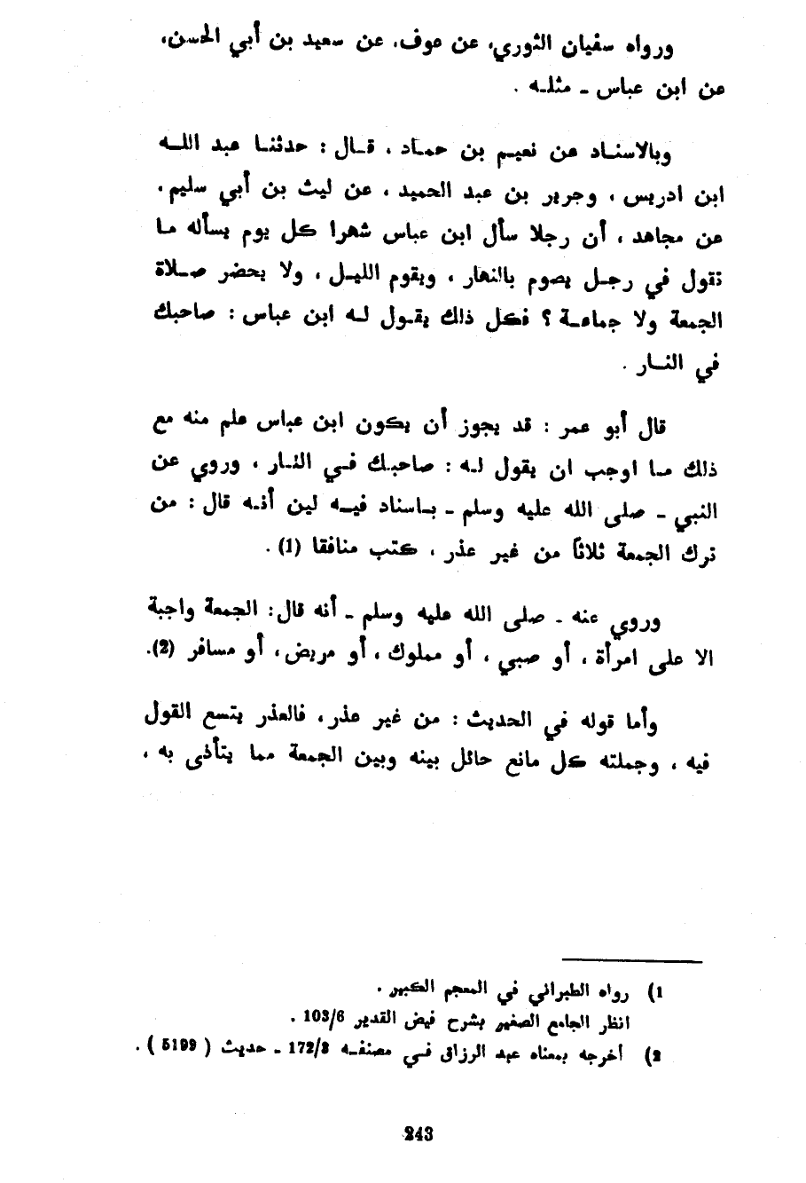وَرَوَاهُ سُفْيَانُ الثَّوْرِيُّ عَنْ عَوْفٍ عَنْ سَعِيدِ بْنِ أَبِي الْحَسَنِ عَنِ ابْنِ عَبَّاسٍ مِثْلَهُ وَبِالْإِسْنَادِ عَنْ نُعَيْمِ بْنِ حَمَّادٍ قَالَ حَدَّثَنَا عَبْدُ اللَّهِ بْنُ إِدْرِيسَ وَجَرِيرُ بْنُ عَبْدِ الْحَمِيدِ عَنْ لَيْثِ بْنِ أَبِي سُلَيْمٍ عَنْ مُجَاهِدٍ أَنَّ رَجُلًا سَأَلَ ابْنَ عَبَّاسٍ شَهْرًا كُلَّ يَوْمٍ يَسْأَلُهُ مَا تَقَوُّلُ فِي رَجُلٍ يَصُومُ بِالنَّهَارِ وَيَقُومُ اللَّيْلَ وَلَا يَحْضُرُ صَلَاةَ الْجُمُعَةِ وَلَا جَمَاعَةً فَكُلُّ ذَلِكَ يَقُولُ لَهُ ابْنُ عَبَّاسٍ صَاحِبُكَ فِي النَّارِ قَالَ أَبُو عُمَرَ قَدْ يَجُوزُ أَنْ يَكُونَ ابْنُ عَبَّاسٍ عَلِمَ مِنْهُ مَعَ ذَلِكَ مَا أَوْجَبَ أَنْ يَقُولَ لَهُ صَاحِبُكَ فِي النَّارِ وَرُوِيَ عَنِ النَّبِيِّ صَلَّى اللَّهُ عَلَيْهِ وَسَلَّمَ بِإِسْنَادٍ فِيهِ لِينٌ أَنَّهُ قَالَ مَنْ تَرَكَ الْجُمُعَةَ ثَلَاثًا مِنْ غَيْرِ عُذْرٍ كُتِبَ مُنَافِقًا وَرُوِيَ عَنْهُ صَلَّى اللَّهُ عَلَيْهِ وَسَلَّمَ أَنَّهُ قَالَ الْجُمُعَةُ وَاجِبَةٌ إِلَّا عَلَى امْرَأَةٍ أَوْ صَبِيٍّ أَوْ مَمْلُوكٍ أَوْ مَرِيضٍ أَوْ مُسَافِرٍ وَأَمَّا قَوْلُهُ فِي الْحَدِيثِ مِنْ غَيْرِ عُذْرٍ فَالْعُذْرُ يَتَّسِعُ الْقَوْلُ فِيهِ وَجُمْلَتُهُ كُلُّ مَانِعٍ حَائِلٍ بَيْنَهُ وَبَيْنَ الْجُمُعَةِ مِمَّا يَتَأَذَّى بِهِ